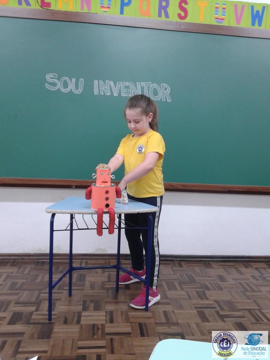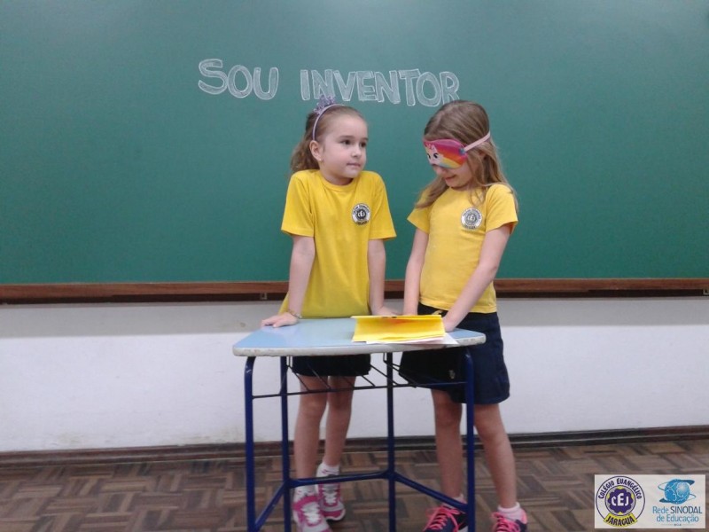 Esse projeto iniciou em agosto e está em andamento. Exploramos a letra inicial de cada invenção como por exemplo: A de Alfabeto, B de Bambolê, F de Foguete, H de Harpa, K de Karaokê, M de Microscópio, U de Urso de Pelúcia. Assim como a observação de imagens de época que retrataram algumas invenções e a criação de seus próprios inventos.