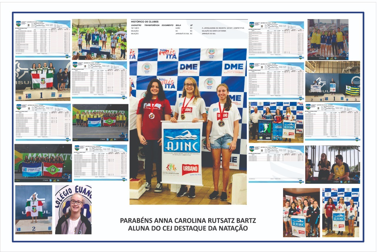 Mais notíciasO Colégio Evangélico Jaraguá parabeniza a aluna Anna Carolina Rutsatz Bartz pelo seu desempenho na natação, sendo destaque representando o Estado de Santa Catarina, a cidade de Jaraguá do Sul, e o Colégio em competições estaduais e nacionais.