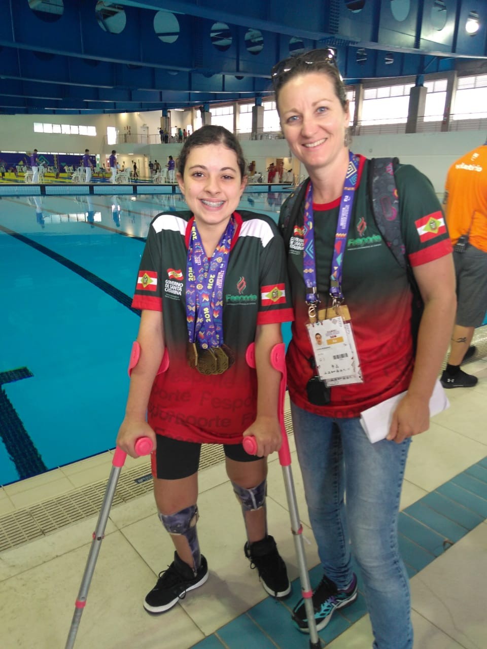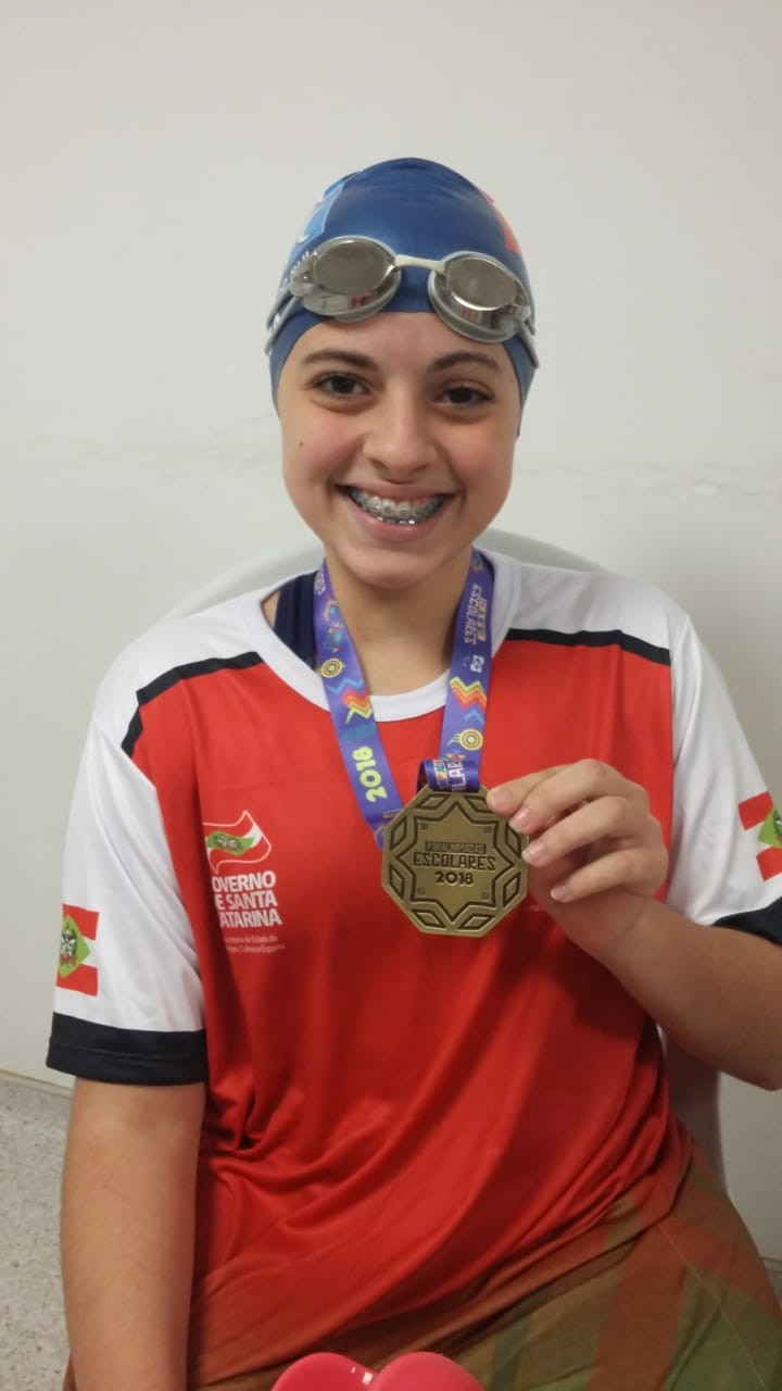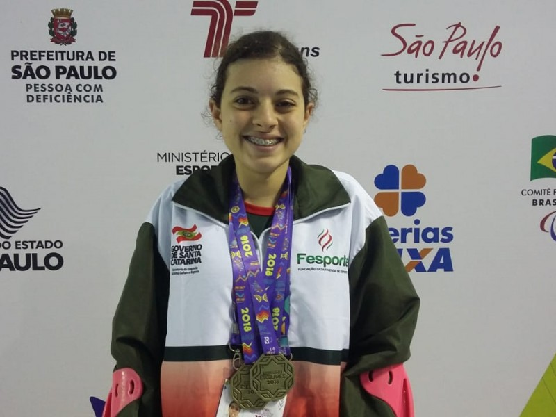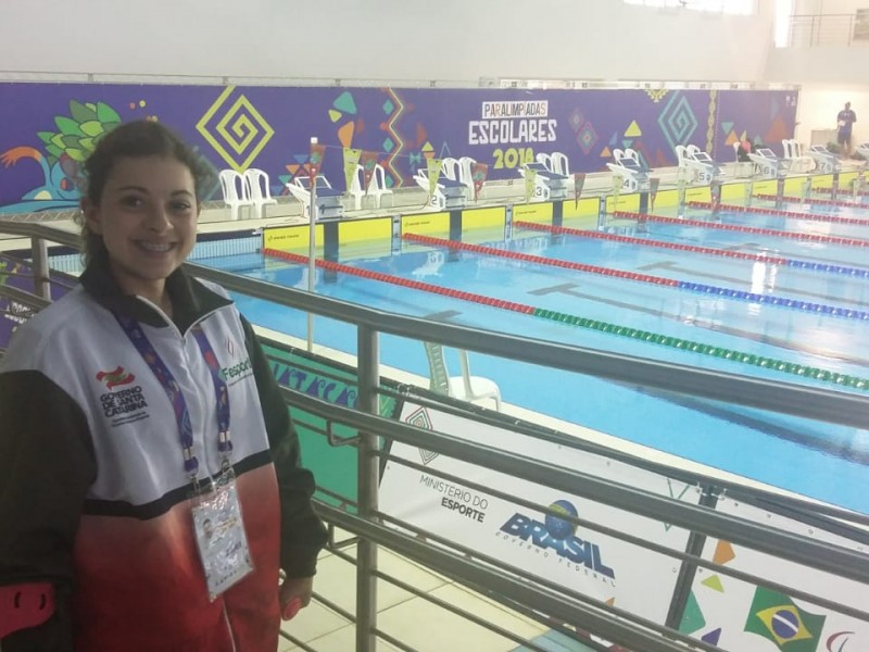 Mais notíciasLuiza Possamai , atleta do Colégio Evangélico Jaraguá/ Ajinc/ Urbano/ Secel, participou das Paralímpiadas Escolares Brasileiras em São Paulo nessa semana, representando Santa Catarina. Luíza demonstrou muita garra e superação , conquistando 6 medalhas na piscina do Centro Paralímpico Brasileiro: 4 de Ouro (50m costas, 100m medley, 50m livre e 50m borboleta), 1 de prata (50m peito), 1 de bronze no revezamento (4x25m livre). A Equipe de Santa Catarina conquistou o troféu de vice-campeã brasileira escolar. Estamos muito felizes com essa conquista e orgulhosos pelo esforço da nossa aluna atleta!