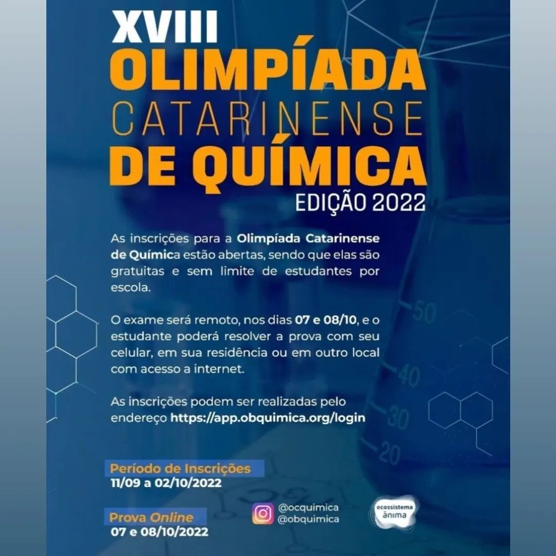 Também, nos dias 07 e 08 de outubro, os estudantes poderão se inscrever e participar da Olímpiada Catarinense de Química, prova que será realizada em sua 1ª e 2ª fases “online” em cada Estado e classificatória para a 3ªfase que é nacional. Os primeiros colocados nesta fase deste certame têm seus nomes inseridos na galeria de honra do troféu da Olimpíada Brasileira de Química. Os quinze estudantes de maior destaque nesta olimpíada são convocados para participar do Curso de Aprofundamento e Excelência em Química ministrado por professores do curso de pós-graduação em Química de uma das universidades participantes, de onde se escolherá a equipe que representará o Brasil na Olimpíada Internacional de Química e na Olimpíada Ibero-americana de Química.
