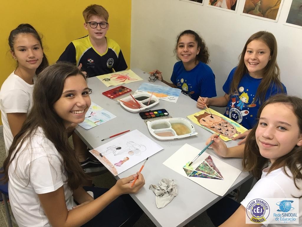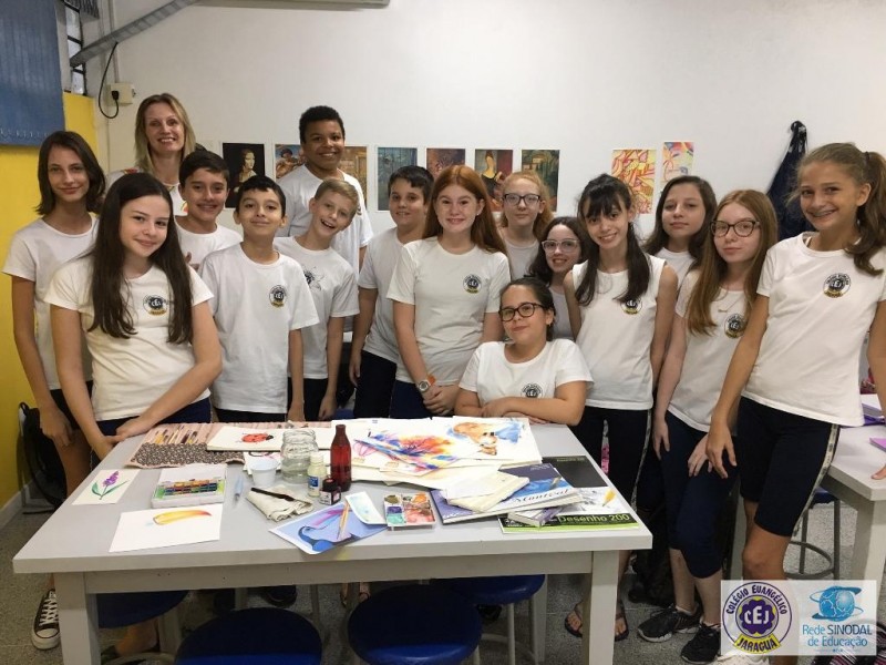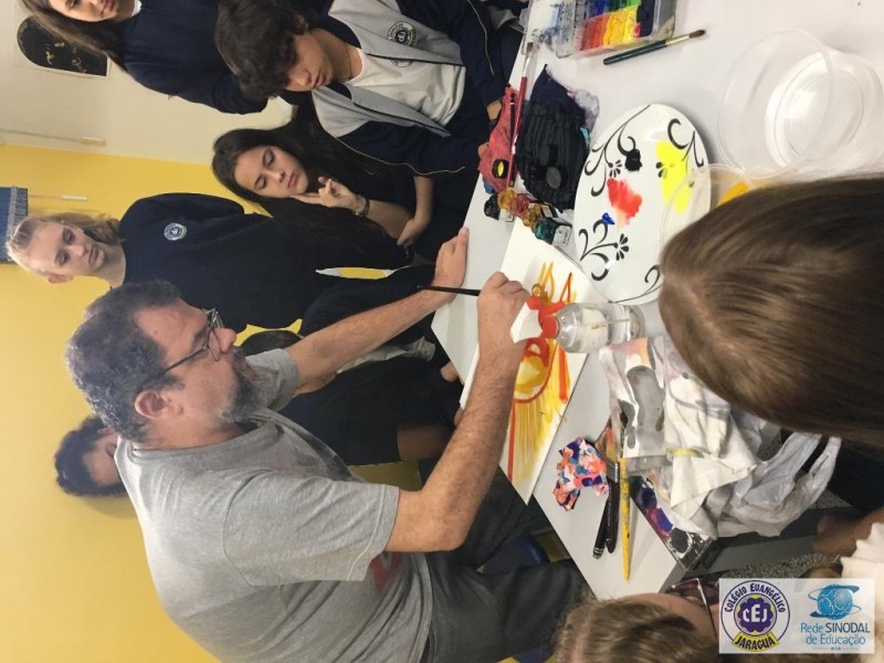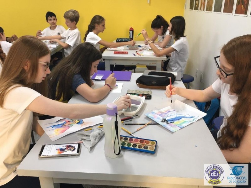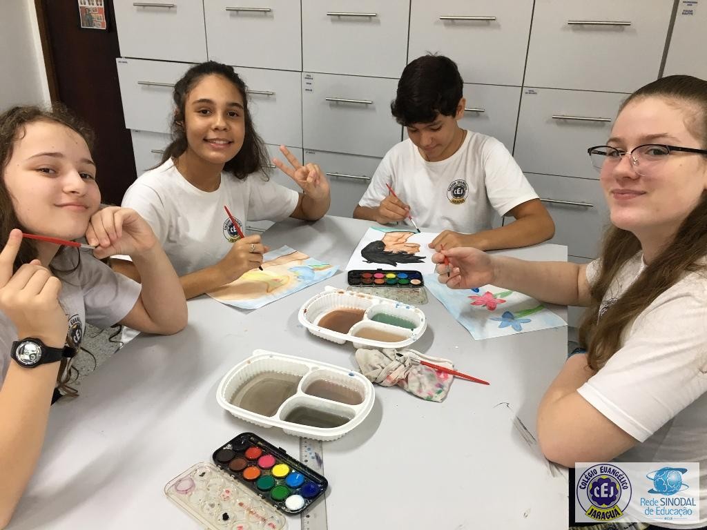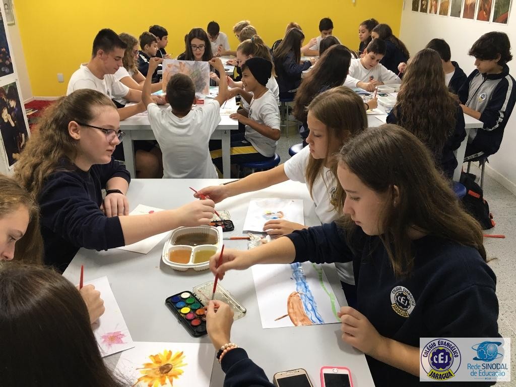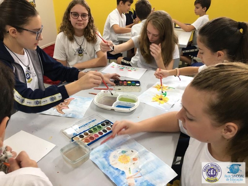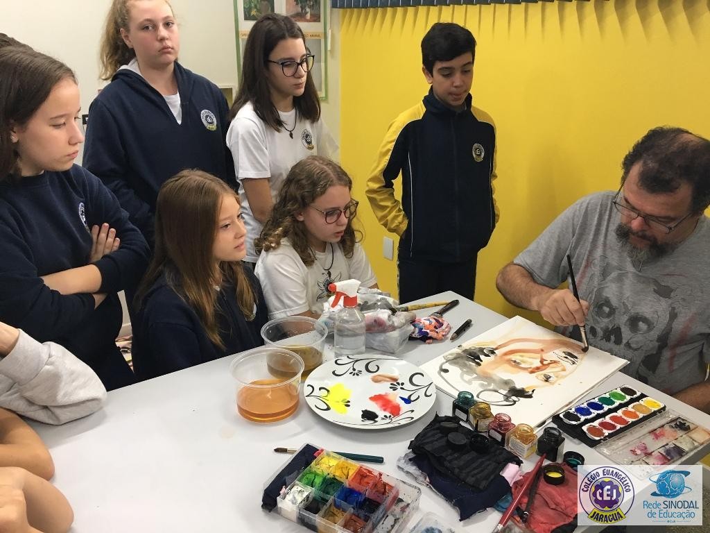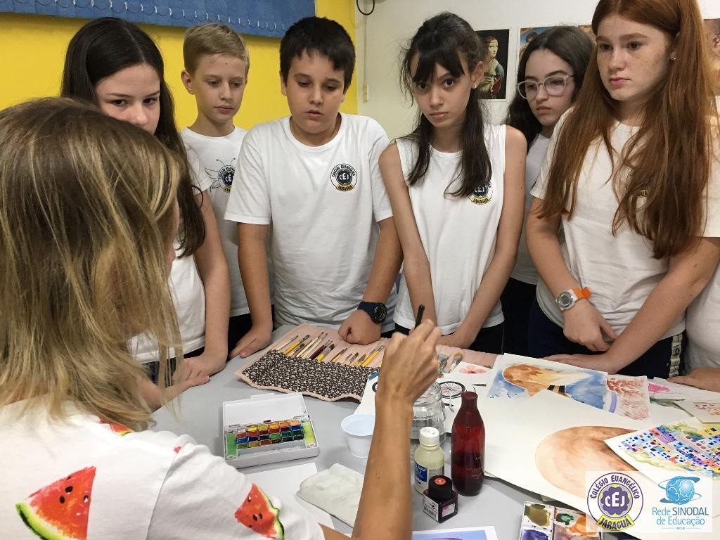 Mais notíciasUm dos conteúdos abordados no primeiro bimestre com o 7˚ ano A e 7˚ ano B foi a Aquarela. Para conhecermos um pouco mais desta técnica milenar, convidamos dois profissionais da área para trazer conhecimento e experiência aos nossos alunos. A artista plástica e design Gilmara Kunchenbecker, que é mãe de uma aluna do nosso colégio, e o artista plástico e designer Fernando Oechsler. Os dois compartilharam muito conhecimento com os nossos alunos, que depois tiveram um momento para desenvolver belos trabalhos com a técnica da aquarela.