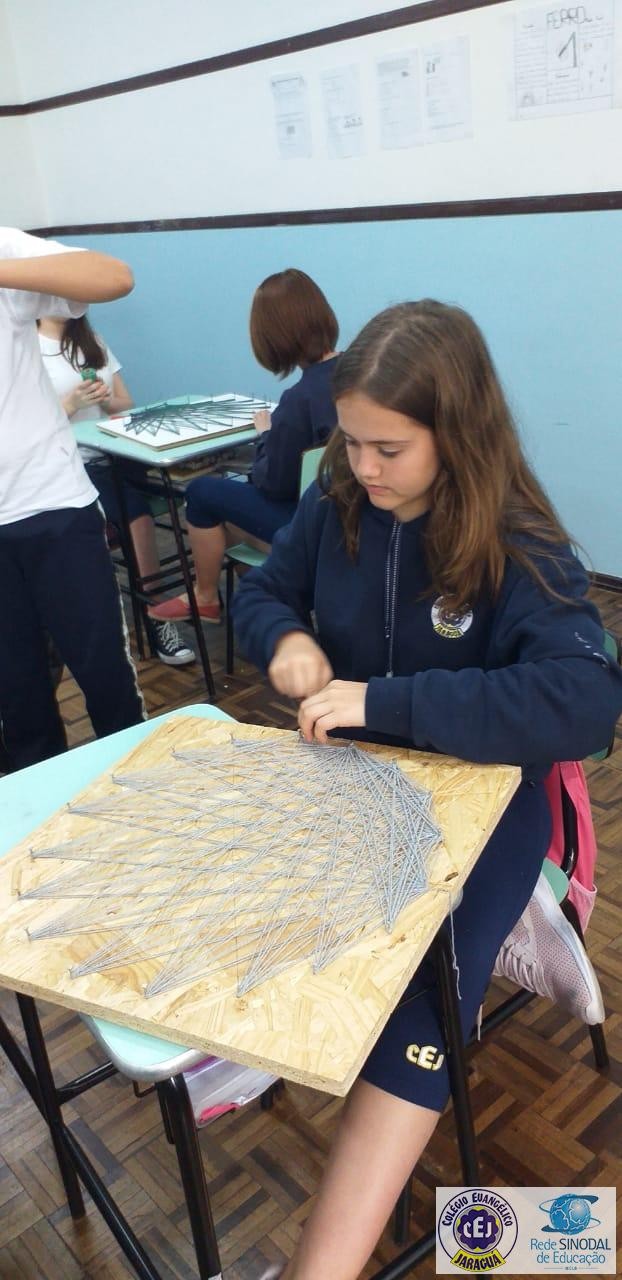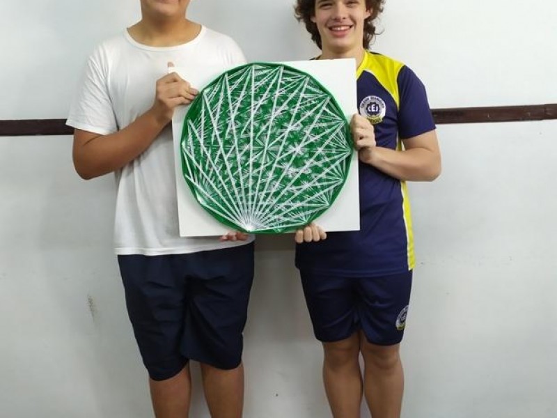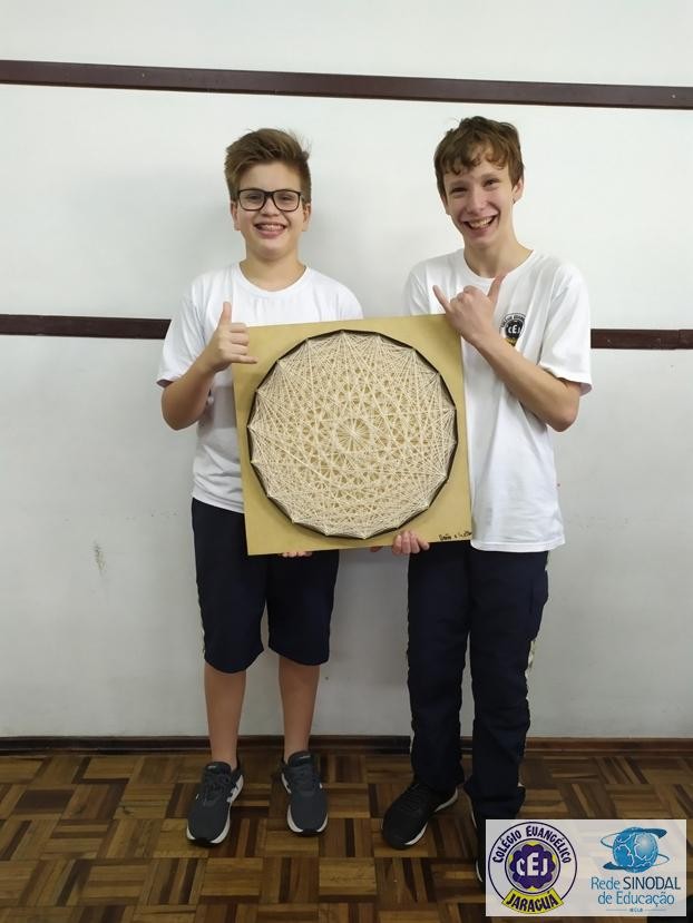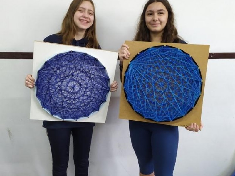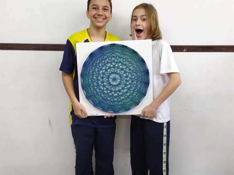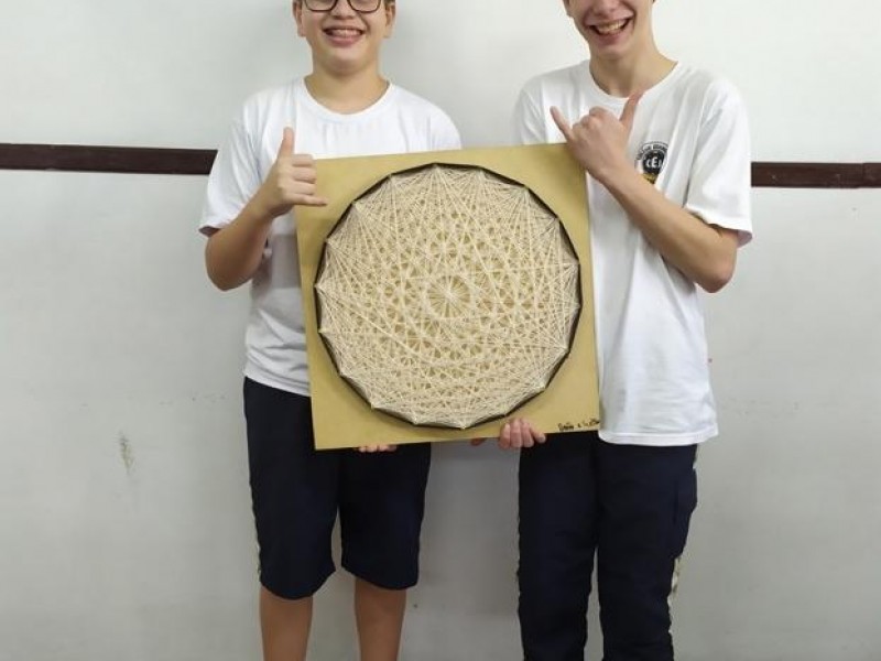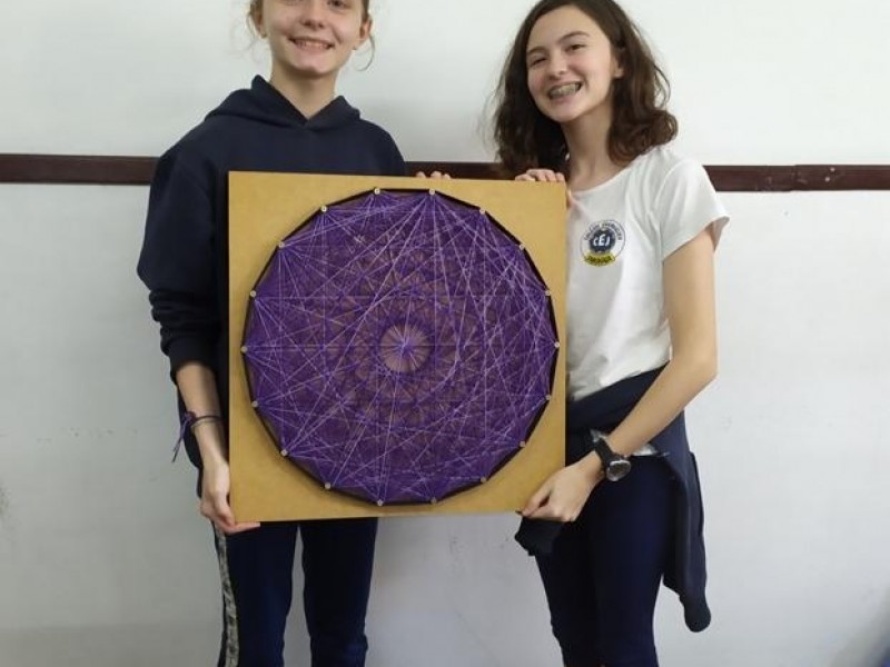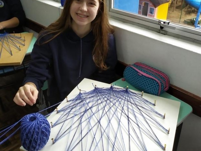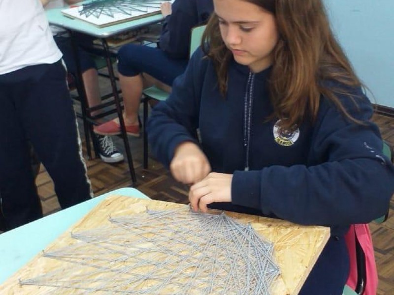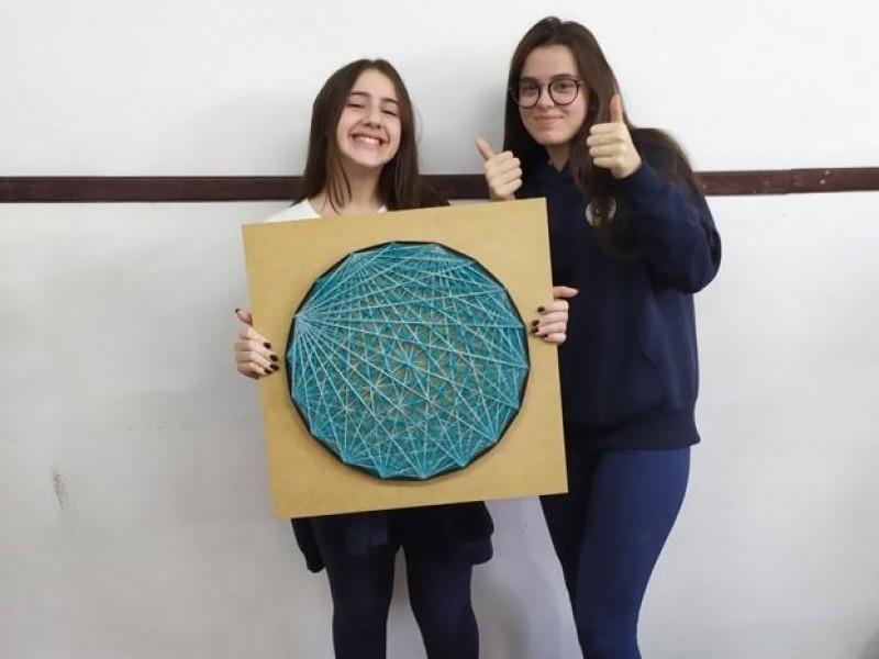 Mais notíciasNo mês de setembro nas aulas de Matemática, os alunos do 8º A e B realizaram o trabalho dos polígonos , utilizando uma tábua 50cm x 50cm, pregos ou parafusos e também fios coloridos. O objetivo foi desenvolver maiores habilidades do uso do transferidor e régua, bem como traçar as diagonais com fios coloridos formando um desenho geométrico.