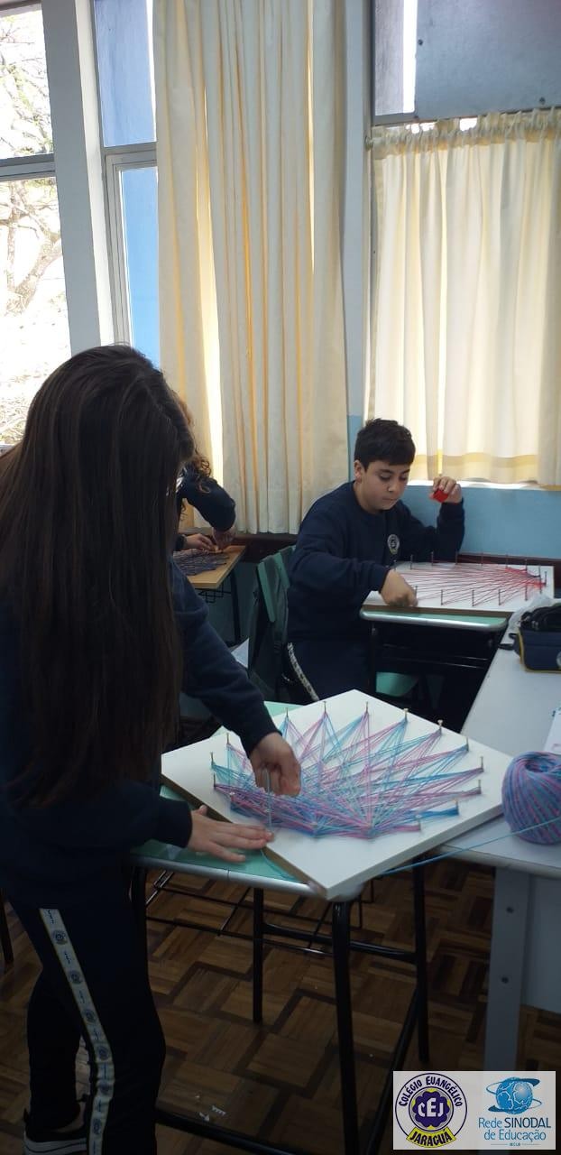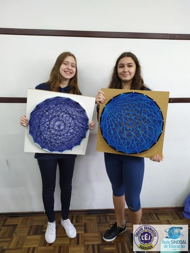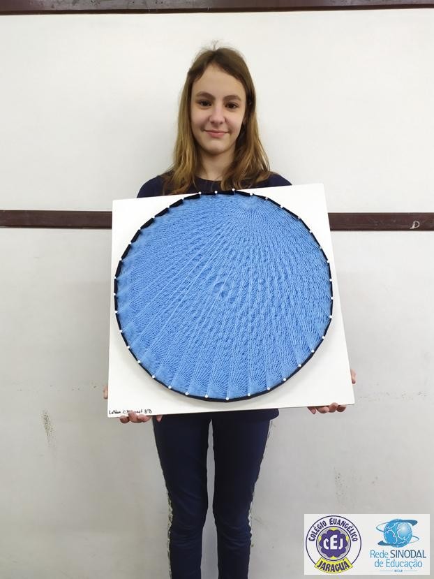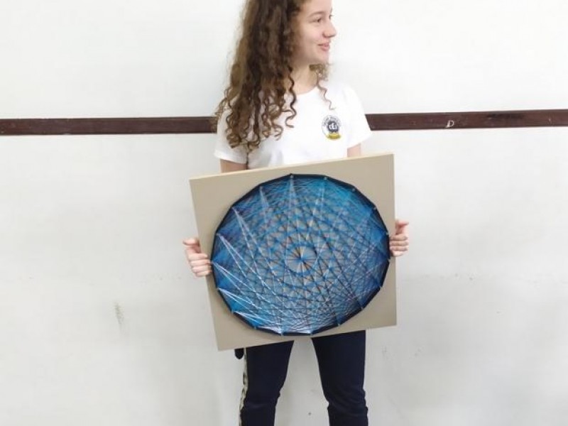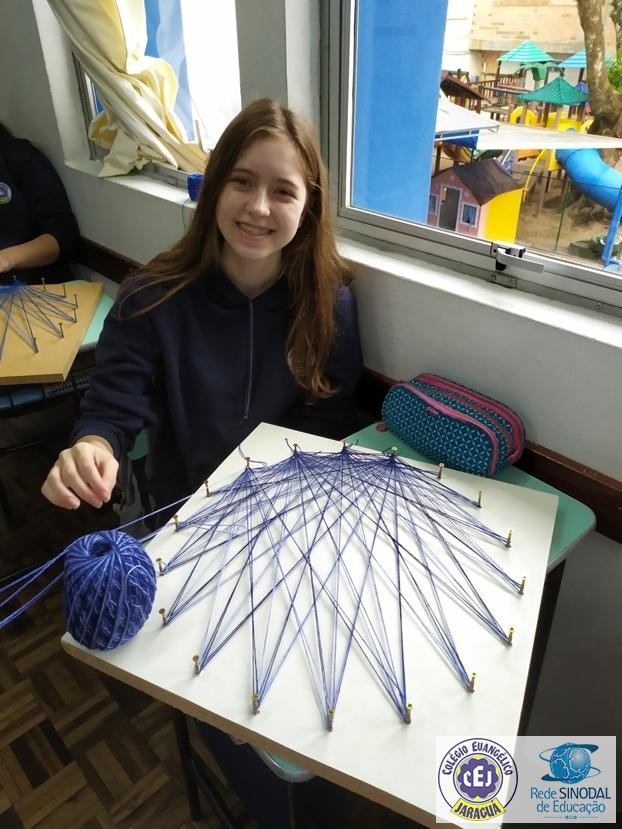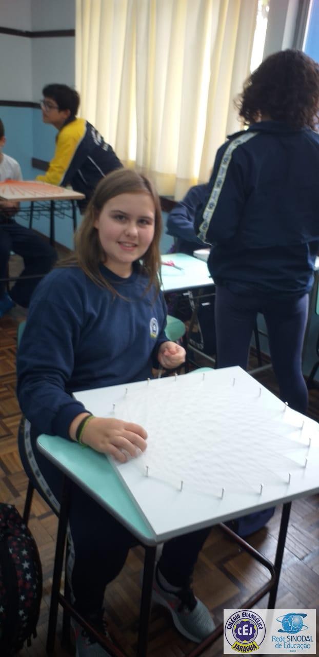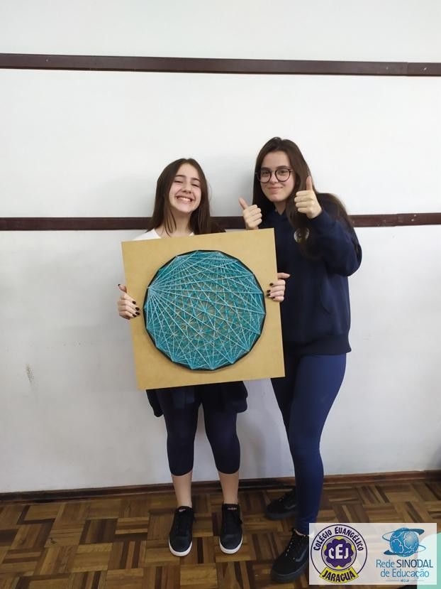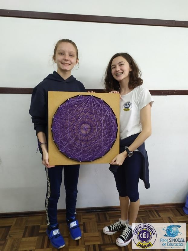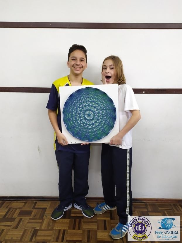 Mais notíciasNo mês de setembro nas aulas de Matemática, os alunos do 8º A e B realizaram o trabalho dos polígonos , utilizando uma tábua 50cm x 50cm, pregos ou parafusos e também fios coloridos. O objetivo foi desenvolver maiores habilidades do uso do transferidor e régua, bem como traçar as diagonais com fios coloridos formando um desenho geométrico.
