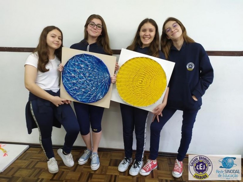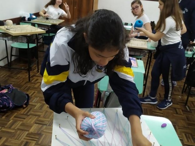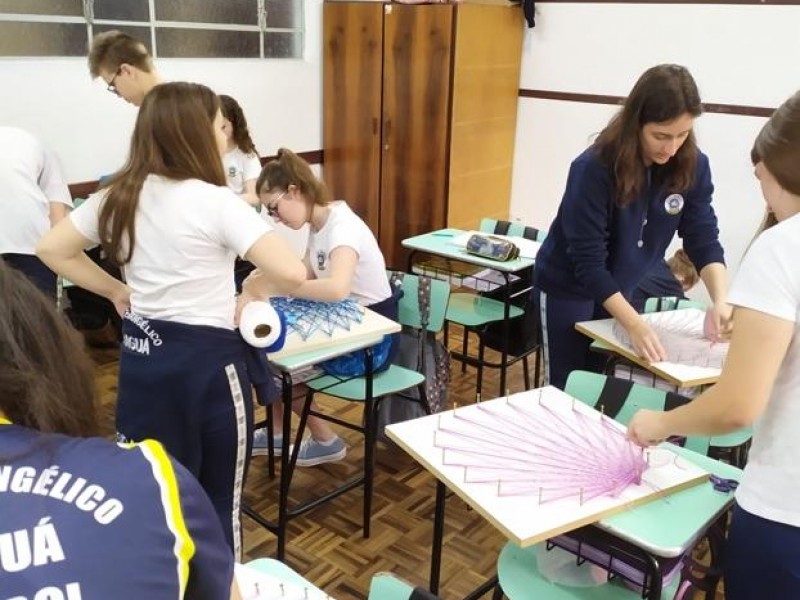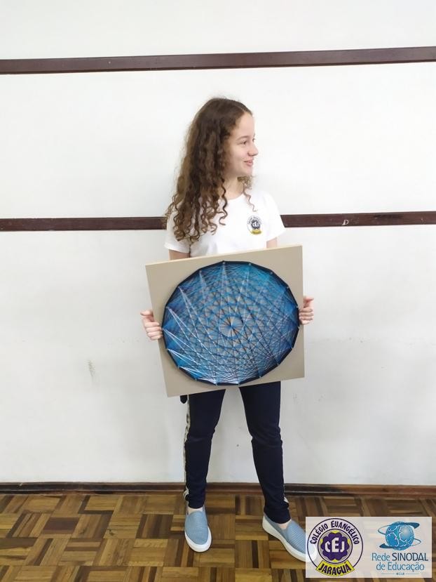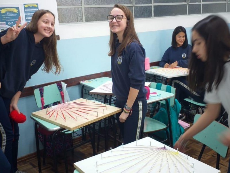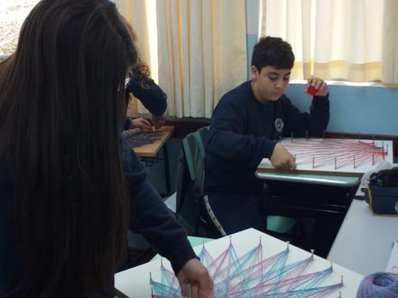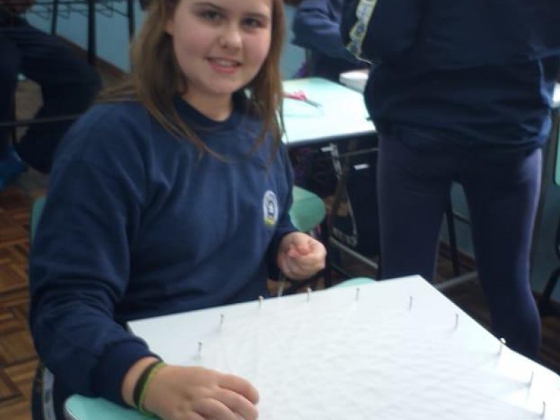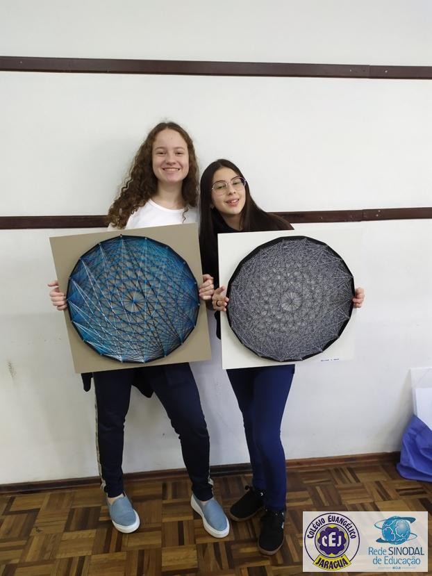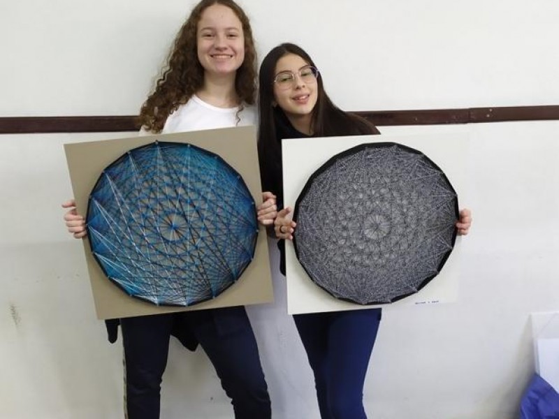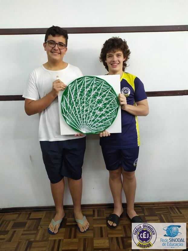 Mais notíciasNo mês de setembro nas aulas de Matemática, os alunos do 8º A e B realizaram o trabalho dos polígonos , utilizando uma tábua 50cm x 50cm, pregos ou parafusos e também fios coloridos. O objetivo foi desenvolver maiores habilidades do uso do transferidor e régua, bem como traçar as diagonais com fios coloridos formando um desenho geométrico.