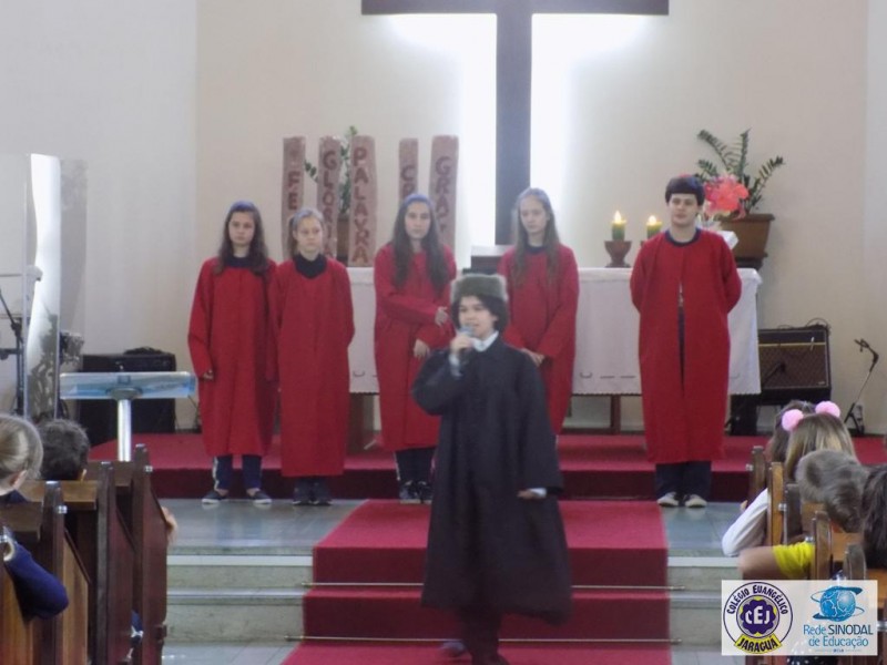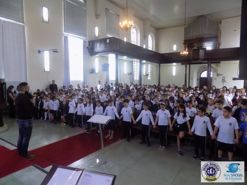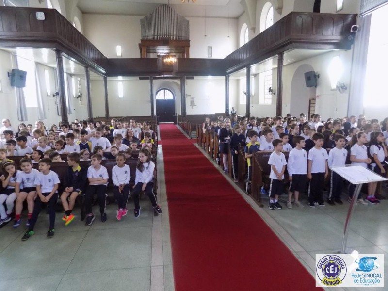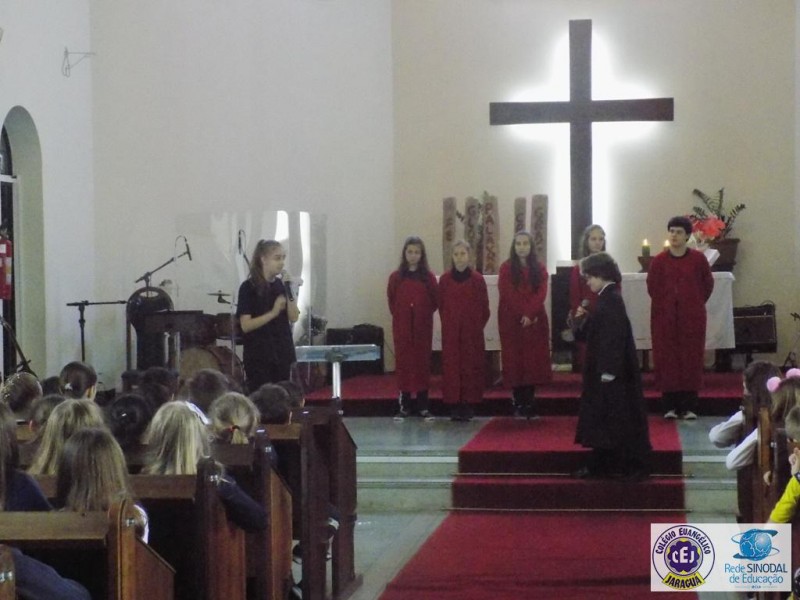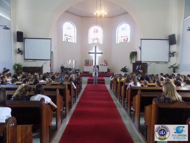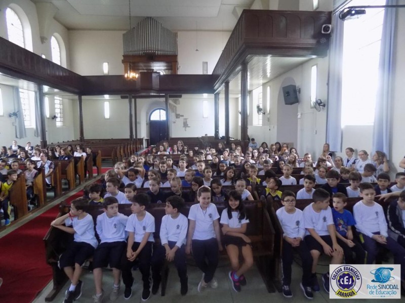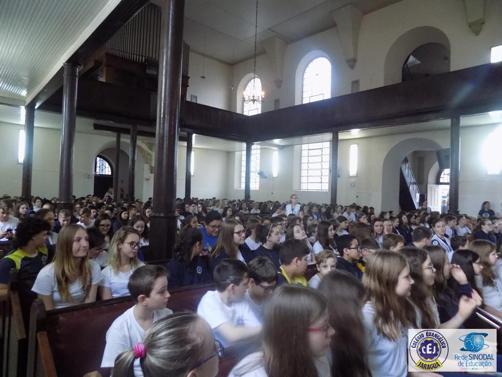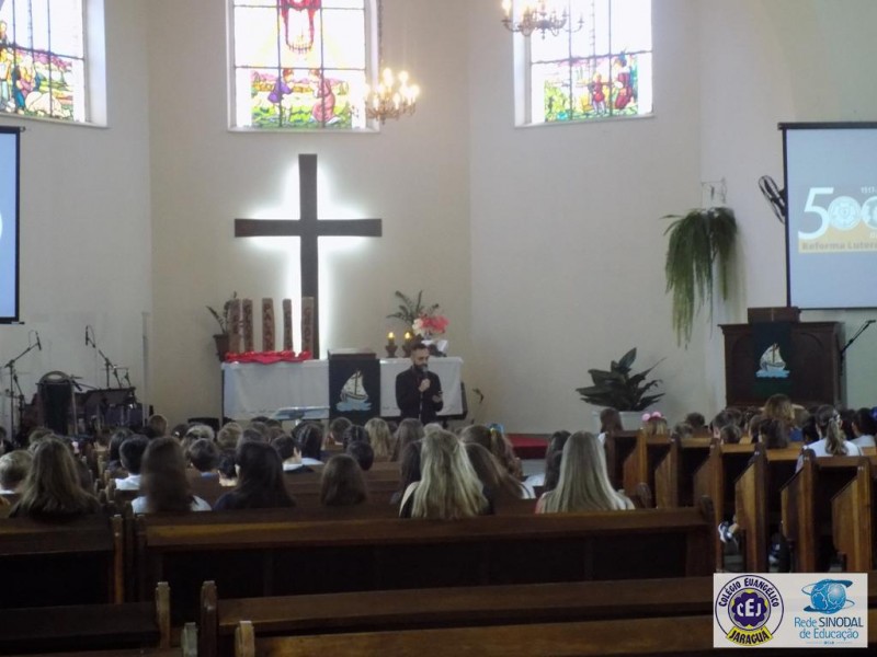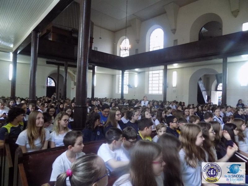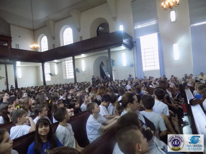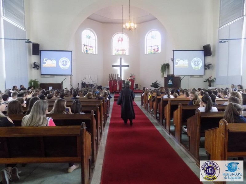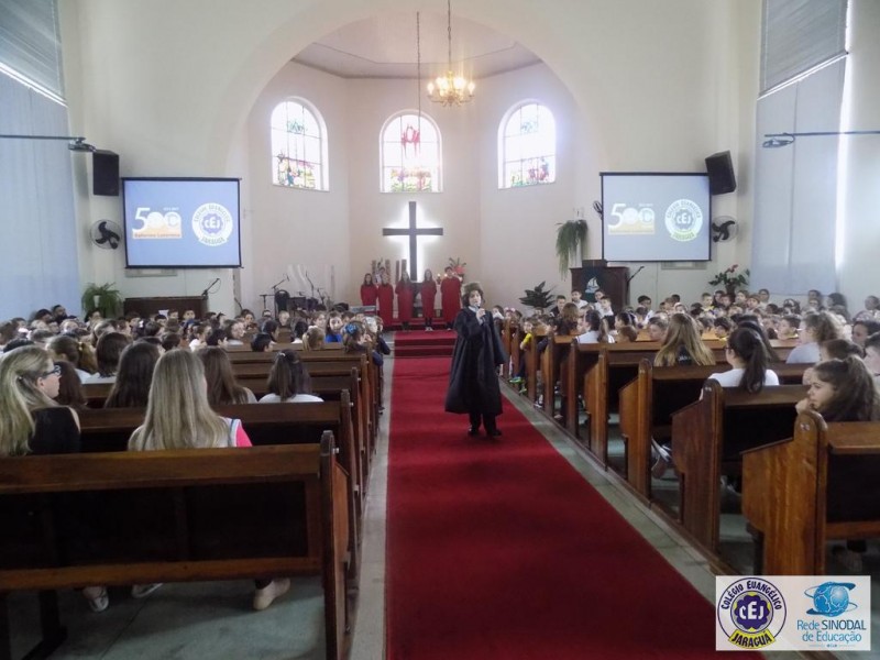 Mais notíciasNa quarta-feira , dia 31 de outubro, os alunos do 1º ano do Ensino Fundamental ao 3º ano do Ensino Médio do Colégio Evangélico Jaraguá participaram da celebração em comemoração ao Dia da Reforma Luterana. A celebração foi organizada pelas professoras Luciane Affonso e Daniele Steinert e contou com a participação do P. Rafael Coelho. Além das reflexões sobre a Reforma Luterana realizadas a partir de encenações, o P. Rafael e a professora Luciane enfatizaram o amor como principal reforma nas nossas vidas. Na celebração também foi realizado o fechamento do projeto Lições para toda a Vida, que abordou nesse ano letivo três temas: responsabilidade, honestidade e fazer o seu melhor! Para fechar o projeto, os alunos do 2º ao 5º ano juntamente com a professora Vanize Camargo Kraag elaboraram uma paródia “Viver a Vida”, que traz uma reflexão sobre os temas abordados.