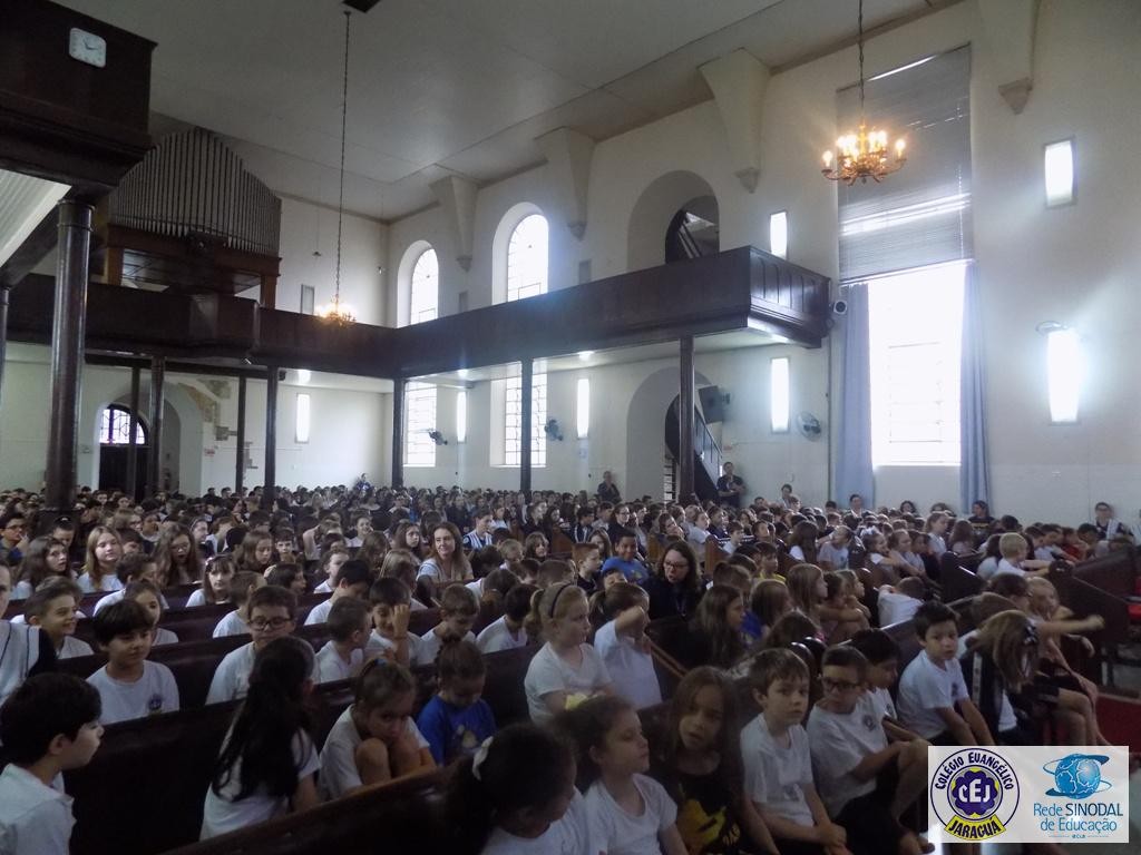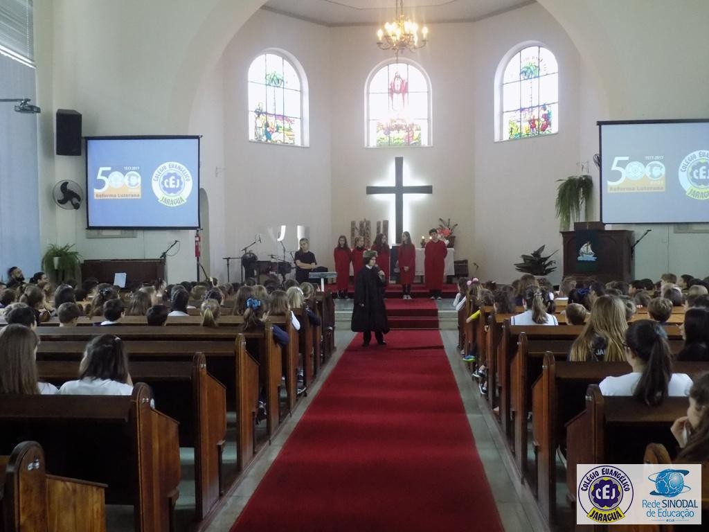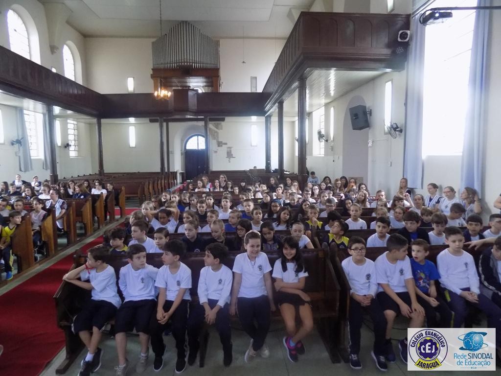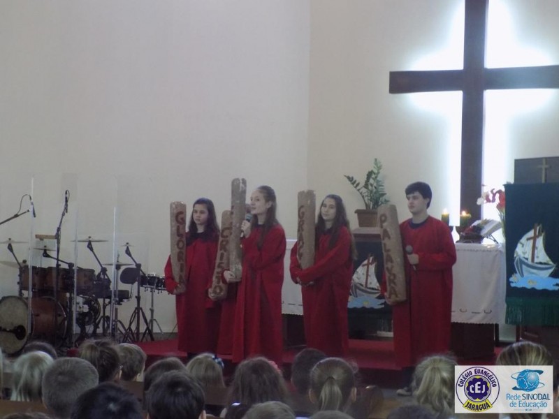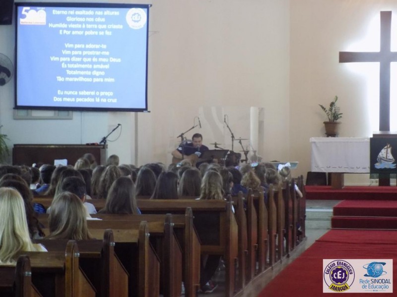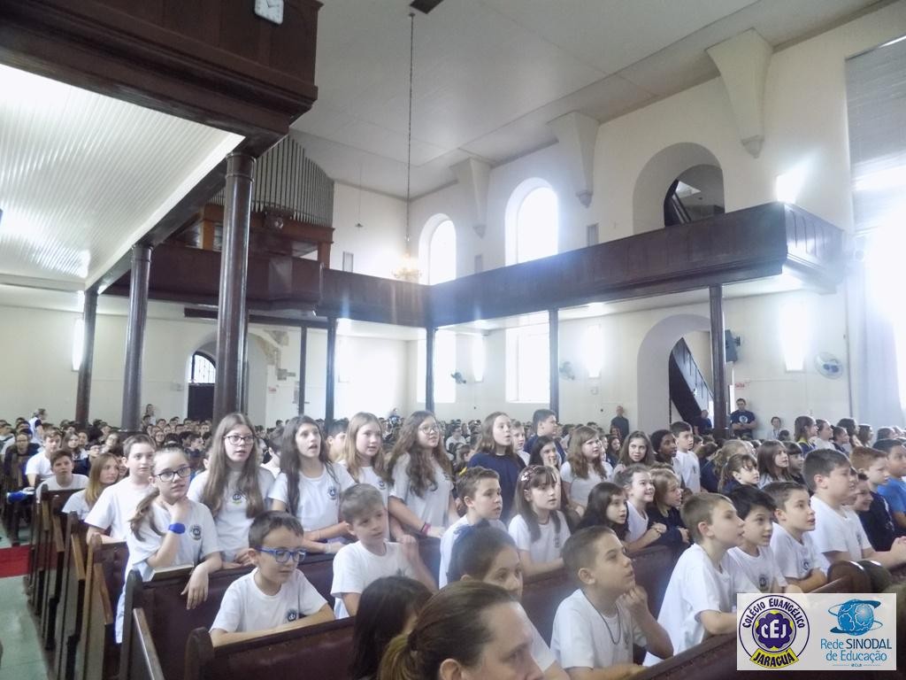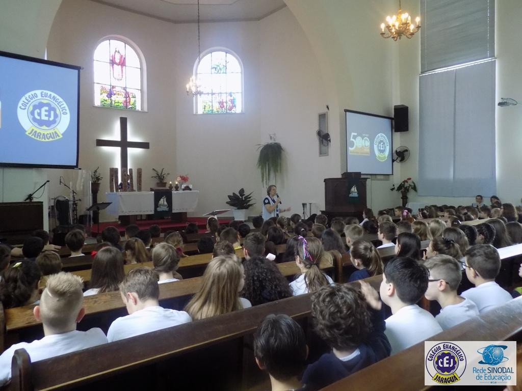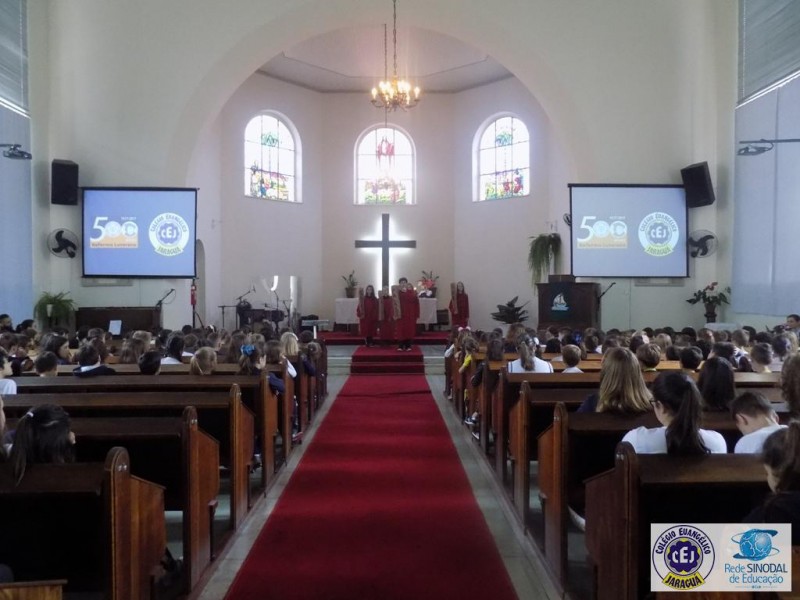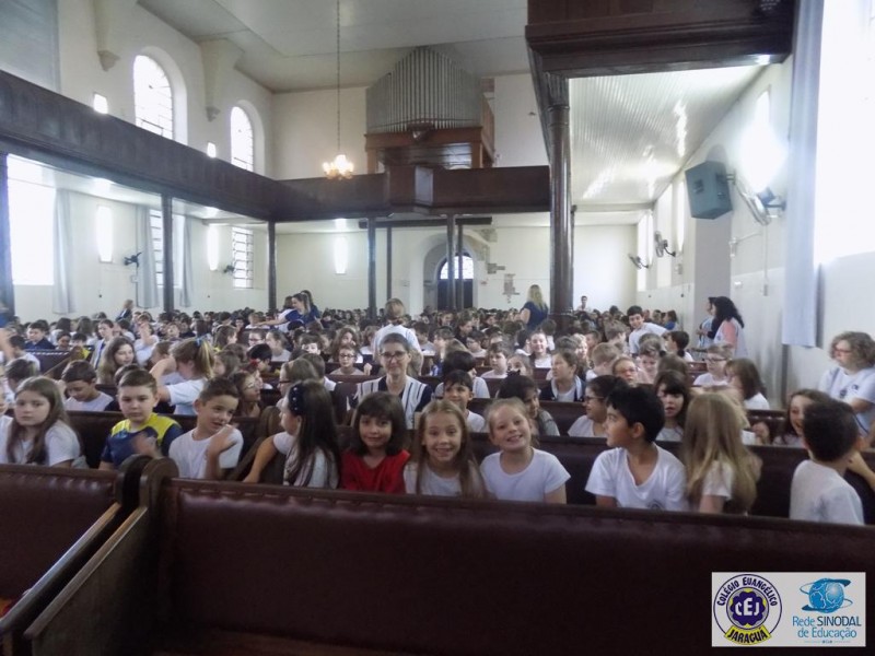 Mais notíciasNa quarta-feira , dia 31 de outubro, os alunos do 1º ano do Ensino Fundamental ao 3º ano do Ensino Médio do Colégio Evangélico Jaraguá participaram da celebração em comemoração ao Dia da Reforma Luterana. A celebração foi organizada pelas professoras Luciane Affonso e Daniele Steinert e contou com a participação do P. Rafael Coelho. Além das reflexões sobre a Reforma Luterana realizadas a partir de encenações, o P. Rafael e a professora Luciane enfatizaram o amor como principal reforma nas nossas vidas. Na celebração também foi realizado o fechamento do projeto Lições para toda a Vida, que abordou nesse ano letivo três temas: responsabilidade, honestidade e fazer o seu melhor! Para fechar o projeto, os alunos do 2º ao 5º ano juntamente com a professora Vanize Camargo Kraag elaboraram uma paródia “Viver a Vida”, que traz uma reflexão sobre os temas abordados.