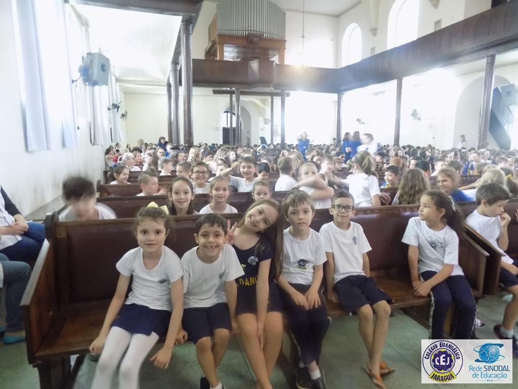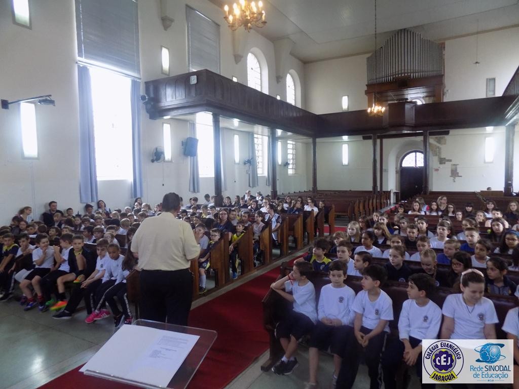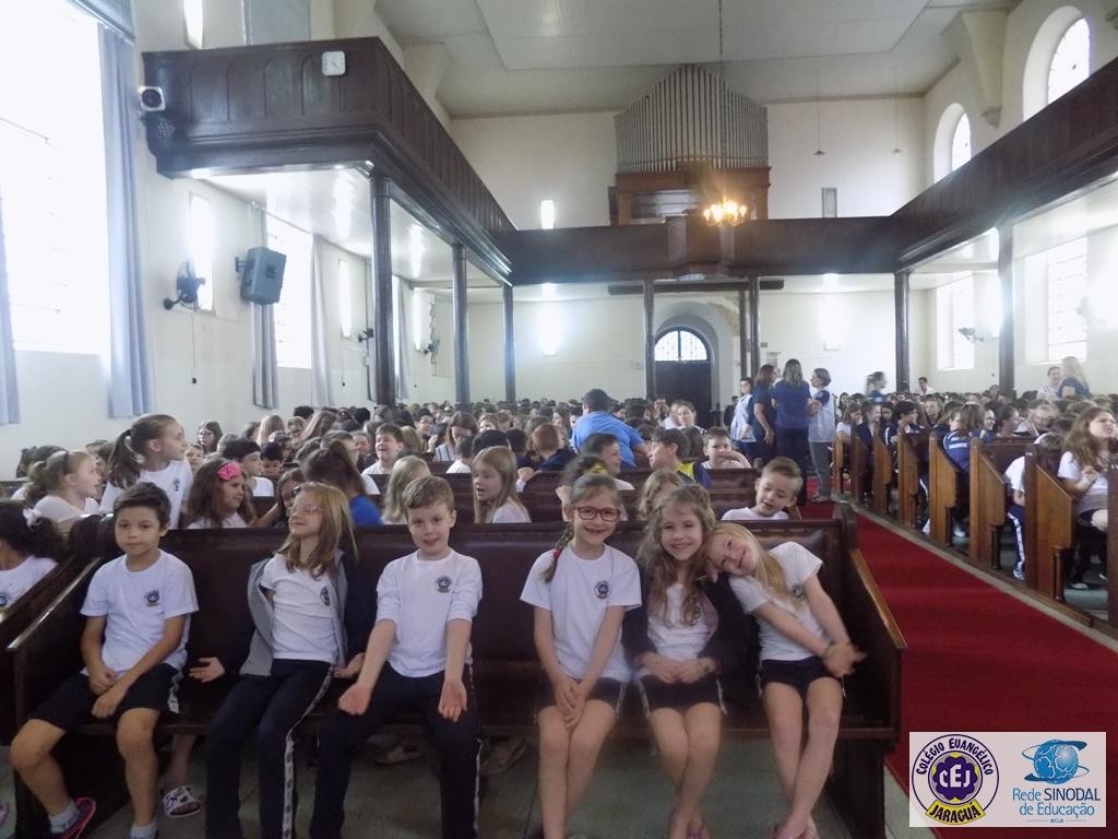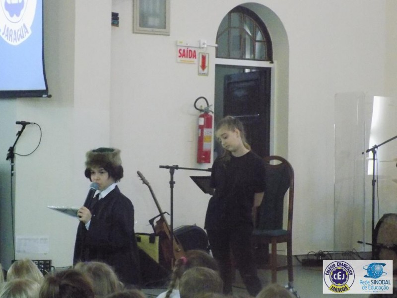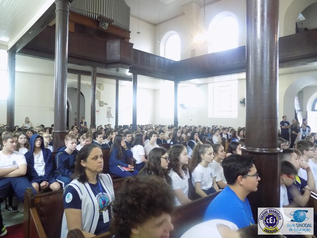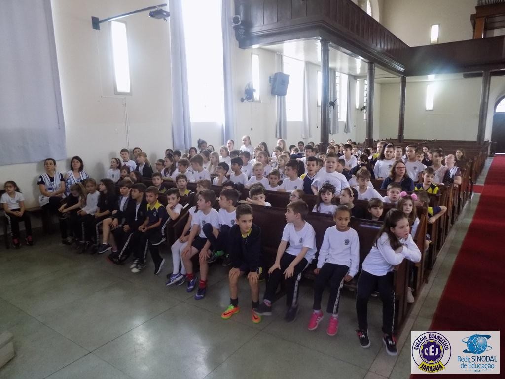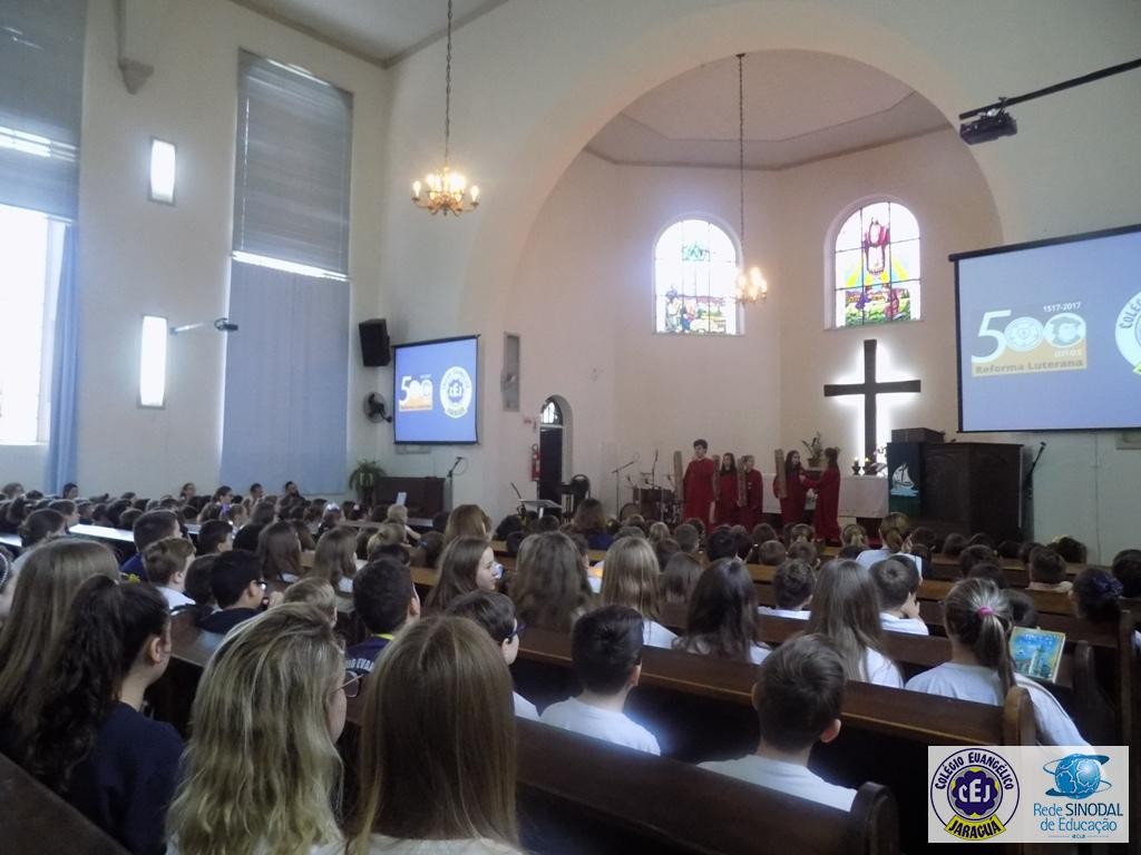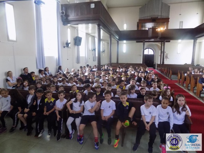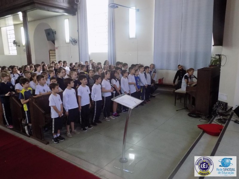 Mais notíciasNa quarta-feira , dia 31 de outubro, os alunos do 1º ano do Ensino Fundamental ao 3º ano do Ensino Médio do Colégio Evangélico Jaraguá participaram da celebração em comemoração ao Dia da Reforma Luterana. A celebração foi organizada pelas professoras Luciane Affonso e Daniele Steinert e contou com a participação do P. Rafael Coelho. Além das reflexões sobre a Reforma Luterana realizadas a partir de encenações, o P. Rafael e a professora Luciane enfatizaram o amor como principal reforma nas nossas vidas. Na celebração também foi realizado o fechamento do projeto Lições para toda a Vida, que abordou nesse ano letivo três temas: responsabilidade, honestidade e fazer o seu melhor! Para fechar o projeto, os alunos do 2º ao 5º ano juntamente com a professora Vanize Camargo Kraag elaboraram uma paródia “Viver a Vida”, que traz uma reflexão sobre os temas abordados.