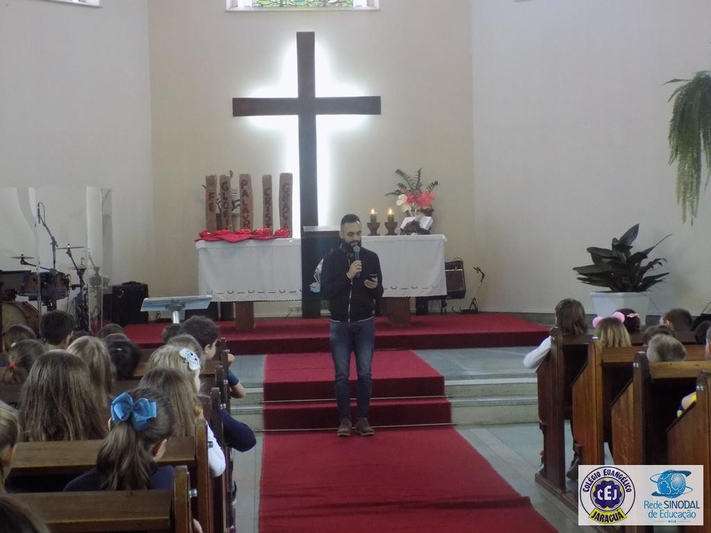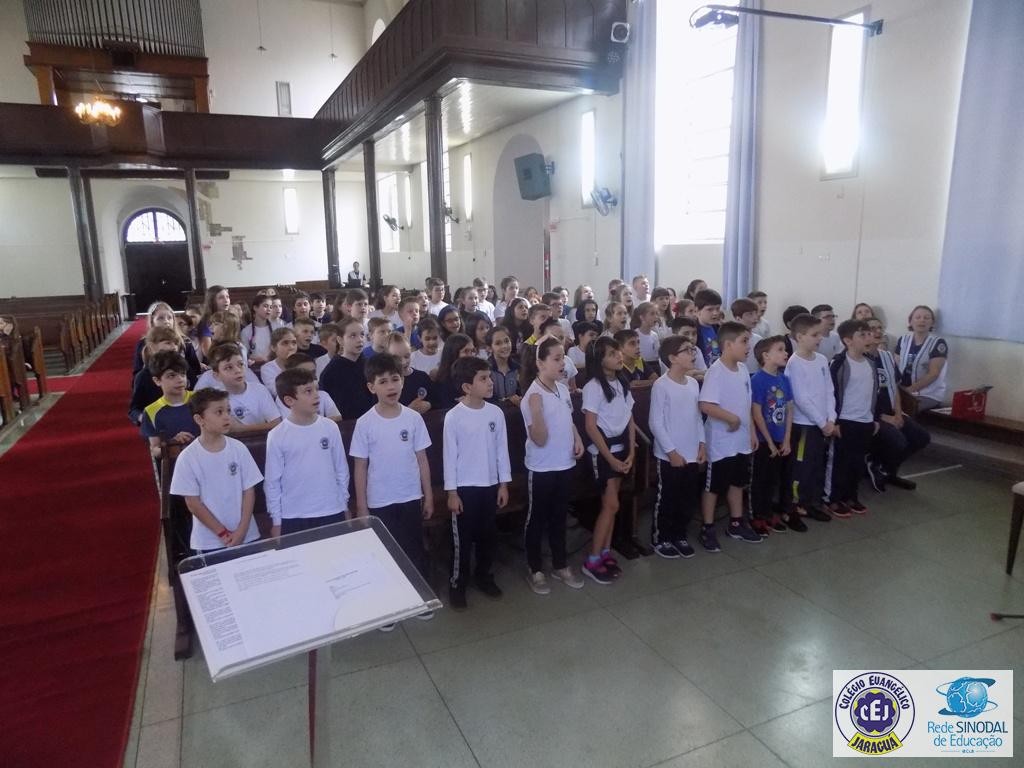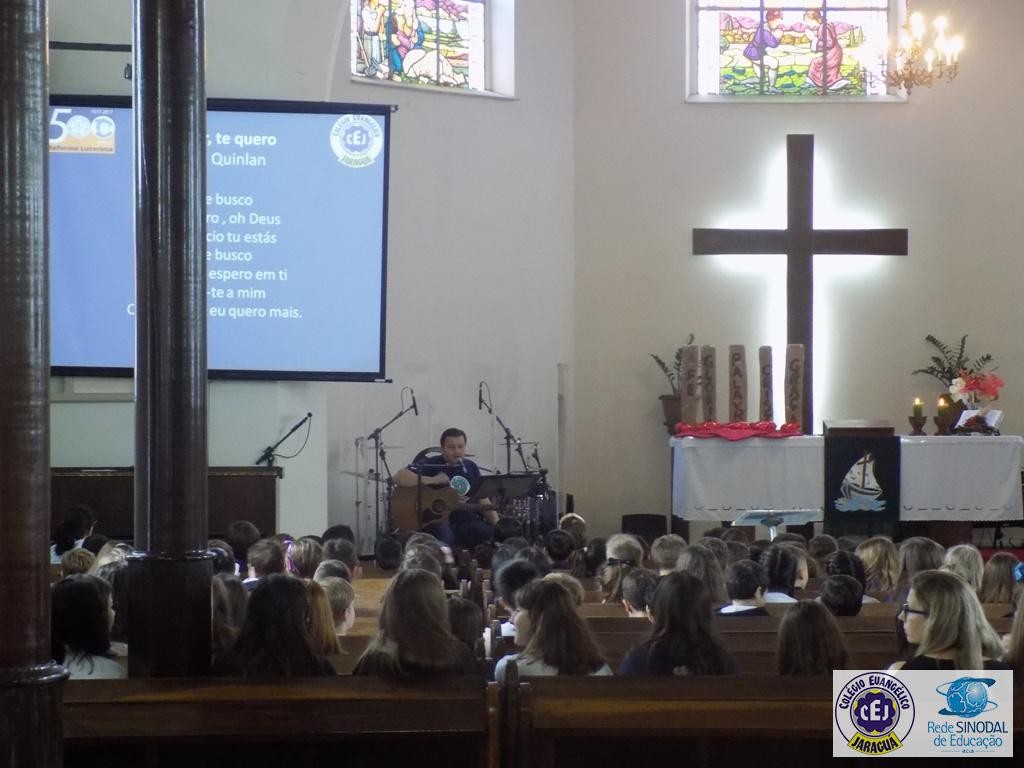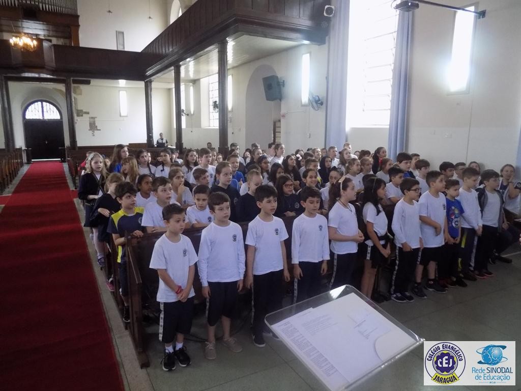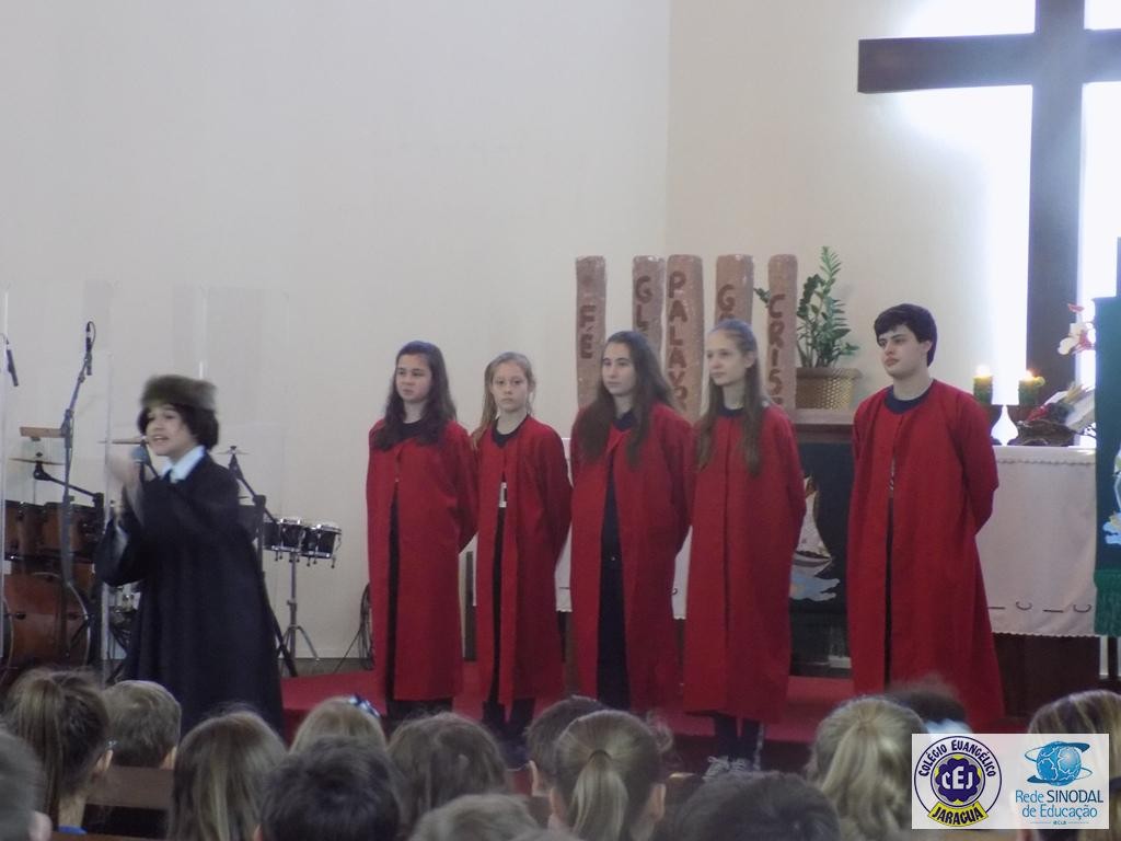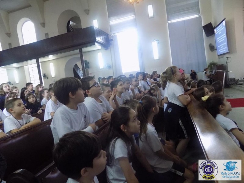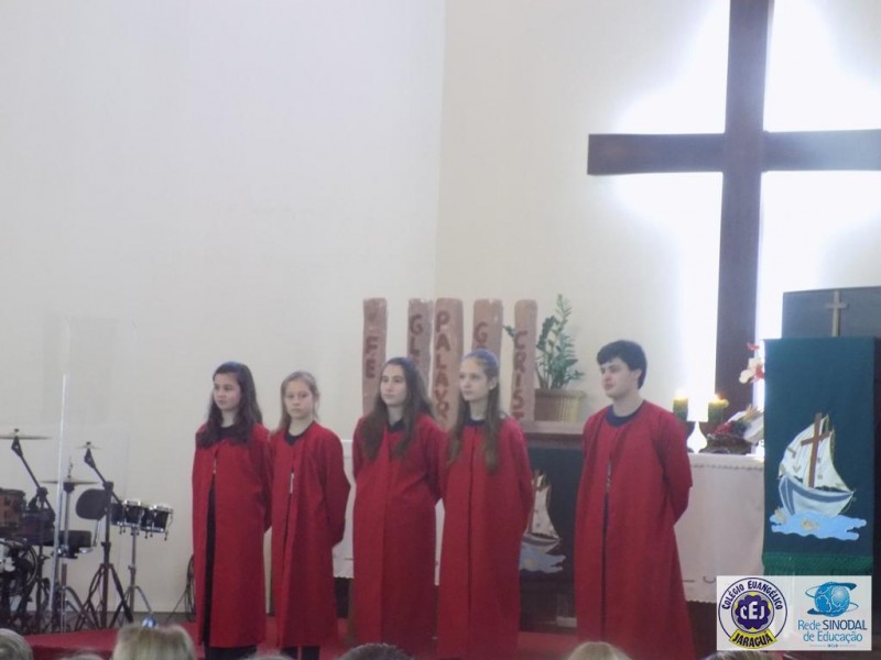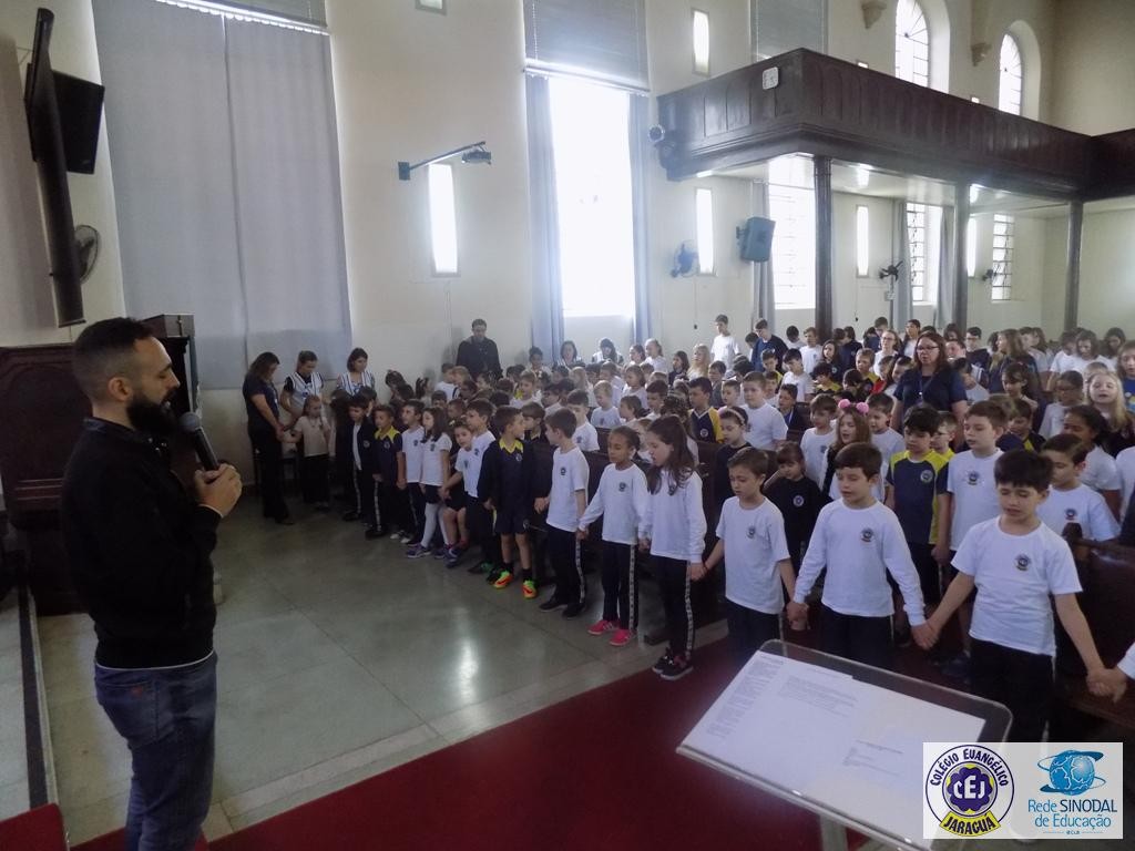 Mais notíciasNa quarta-feira , dia 31 de outubro, os alunos do 1º ano do Ensino Fundamental ao 3º ano do Ensino Médio do Colégio Evangélico Jaraguá participaram da celebração em comemoração ao Dia da Reforma Luterana. A celebração foi organizada pelas professoras Luciane Affonso e Daniele Steinert e contou com a participação do P. Rafael Coelho. Além das reflexões sobre a Reforma Luterana realizadas a partir de encenações, o P. Rafael e a professora Luciane enfatizaram o amor como principal reforma nas nossas vidas. Na celebração também foi realizado o fechamento do projeto Lições para toda a Vida, que abordou nesse ano letivo três temas: responsabilidade, honestidade e fazer o seu melhor! Para fechar o projeto, os alunos do 2º ao 5º ano juntamente com a professora Vanize Camargo Kraag elaboraram uma paródia “Viver a Vida”, que traz uma reflexão sobre os temas abordados.