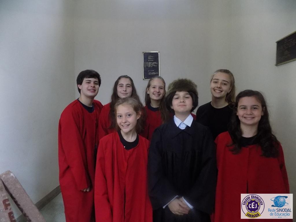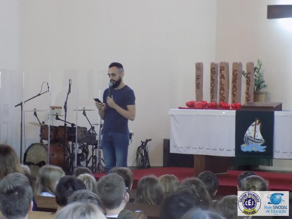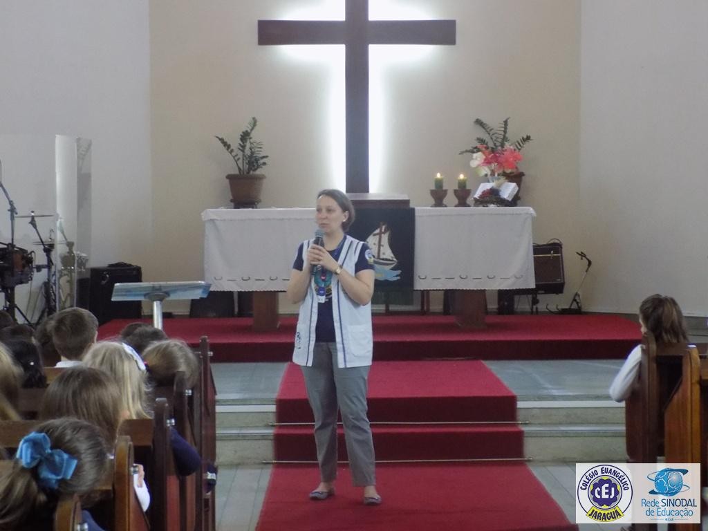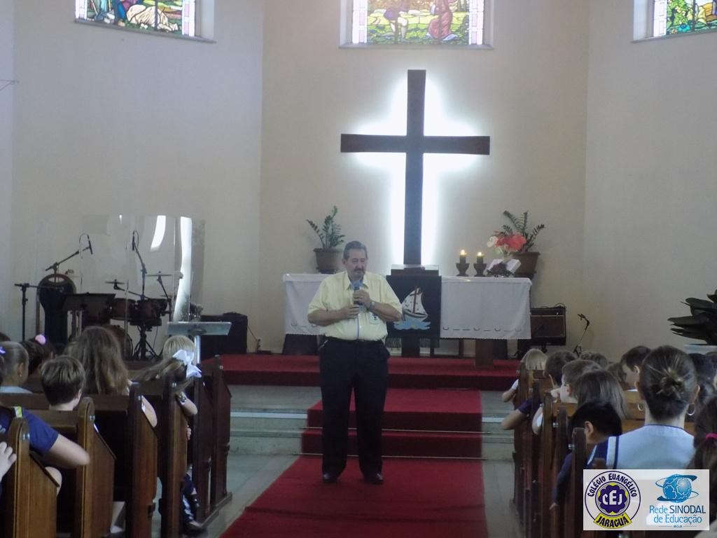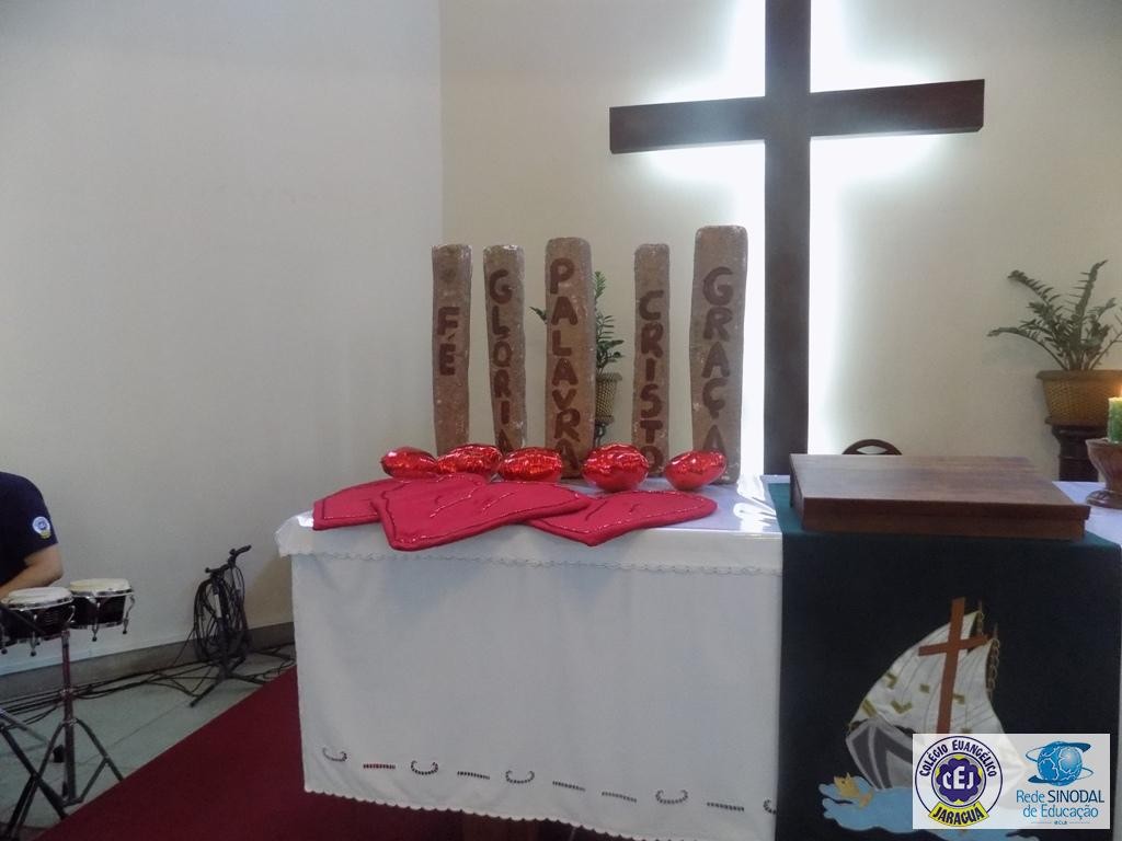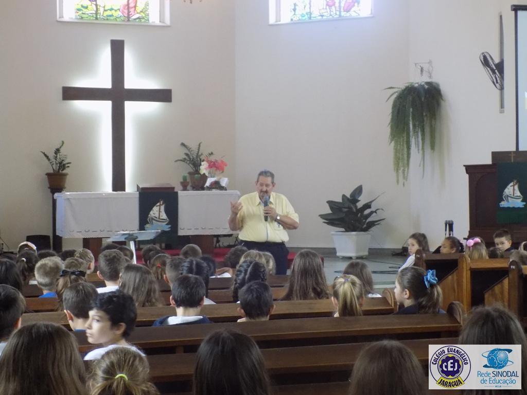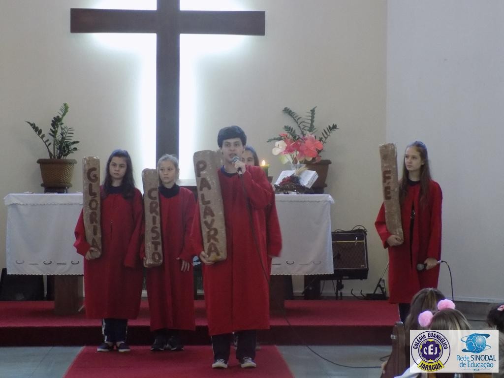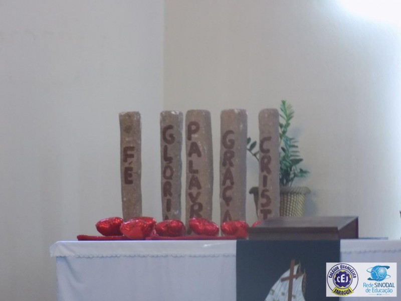 Mais notíciasNa quarta-feira , dia 31 de outubro, os alunos do 1º ano do Ensino Fundamental ao 3º ano do Ensino Médio do Colégio Evangélico Jaraguá participaram da celebração em comemoração ao Dia da Reforma Luterana. A celebração foi organizada pelas professoras Luciane Affonso e Daniele Steinert e contou com a participação do P. Rafael Coelho. Além das reflexões sobre a Reforma Luterana realizadas a partir de encenações, o P. Rafael e a professora Luciane enfatizaram o amor como principal reforma nas nossas vidas. Na celebração também foi realizado o fechamento do projeto Lições para toda a Vida, que abordou nesse ano letivo três temas: responsabilidade, honestidade e fazer o seu melhor! Para fechar o projeto, os alunos do 2º ao 5º ano juntamente com a professora Vanize Camargo Kraag elaboraram uma paródia “Viver a Vida”, que traz uma reflexão sobre os temas abordados.