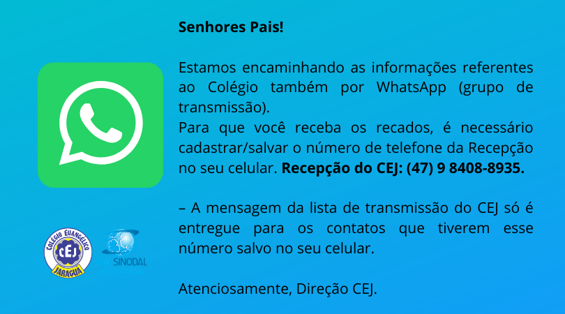 Para que você receba os recados, é necessário cadastrar/salvar o número de telefone da Recepção no seu celular. Recepção do CEJ: (47) 9 8408-8935.