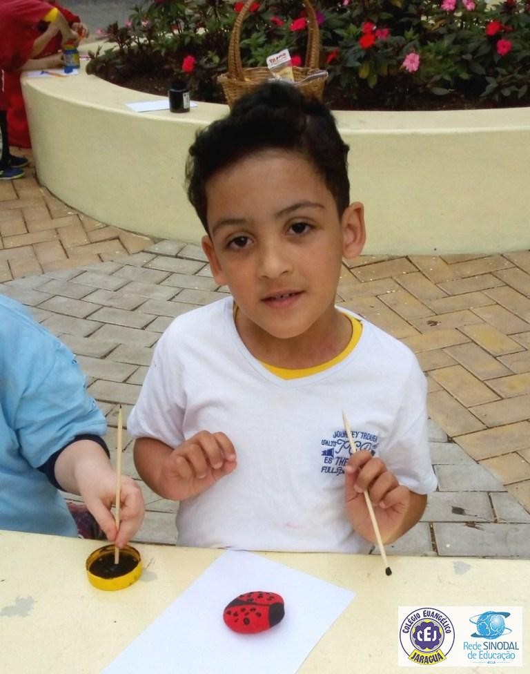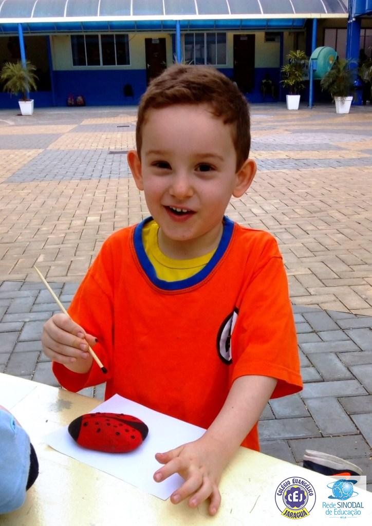 Os alunos do Infantil IV, conheceram a letra J de joaninha. Realizaram uma pesquisa sobre as diferentes cores deste inseto e a confeccionaram em pedras. Confira os registros dessa atividade.