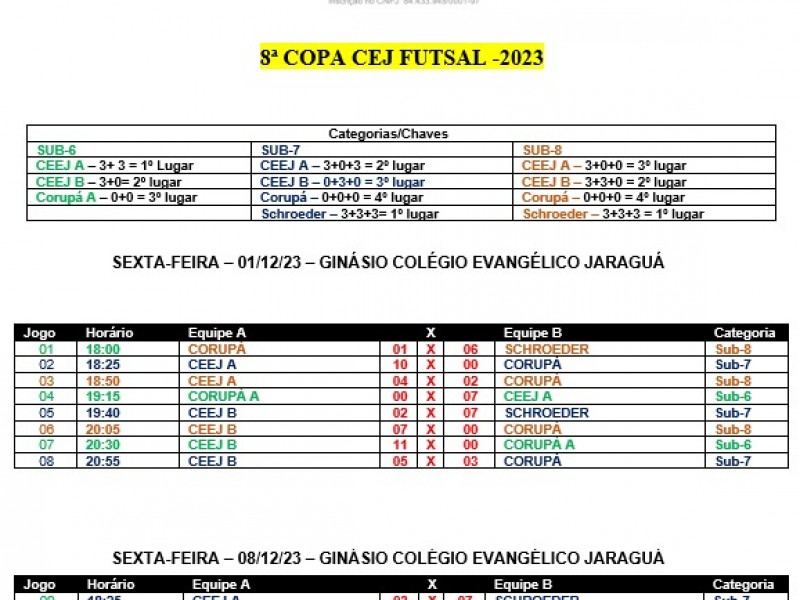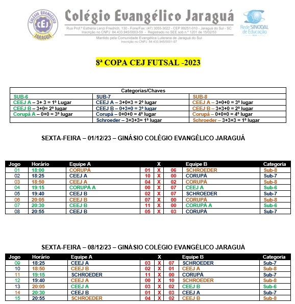 Mais notíciasNas últimas duas semanas, a quadra do Colégio Evangélico Jaraguá se transformou em um verdadeiro campo de sonhos para os jovens atletas. Entre os dias 1º e 7 de dezembro, aconteceu a 8ª Edição da Copa CEJ Futsal Menor, um evento que reuniu talentos das categorias sub-6, sub-7 e sub-8. A competição contou com a participação entusiasmada dos atletas do Projeto Futsal Menor de Jaraguá do Sul, da Adesc de Schroeder e das escolinhas do Corupá Futsal.