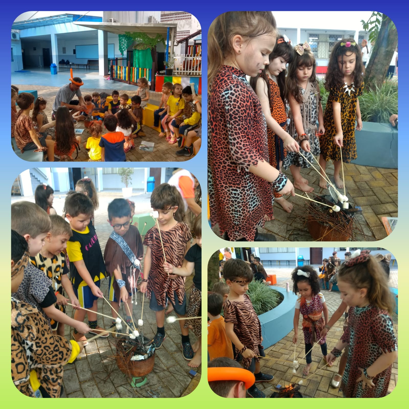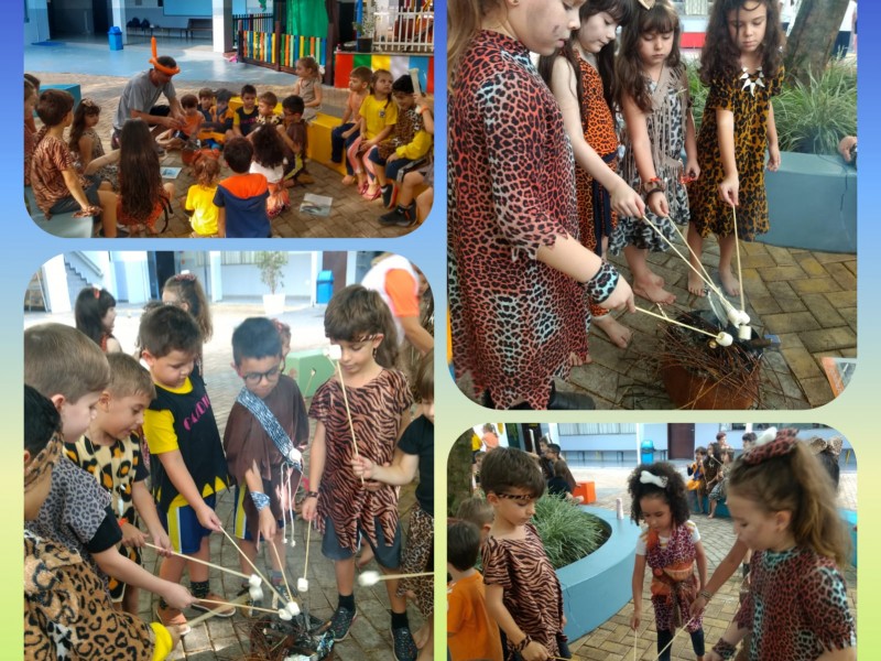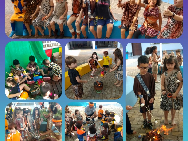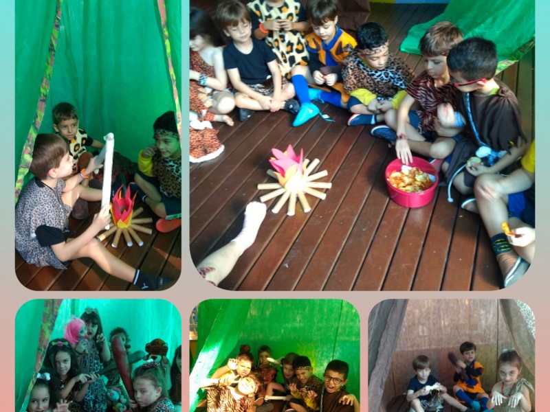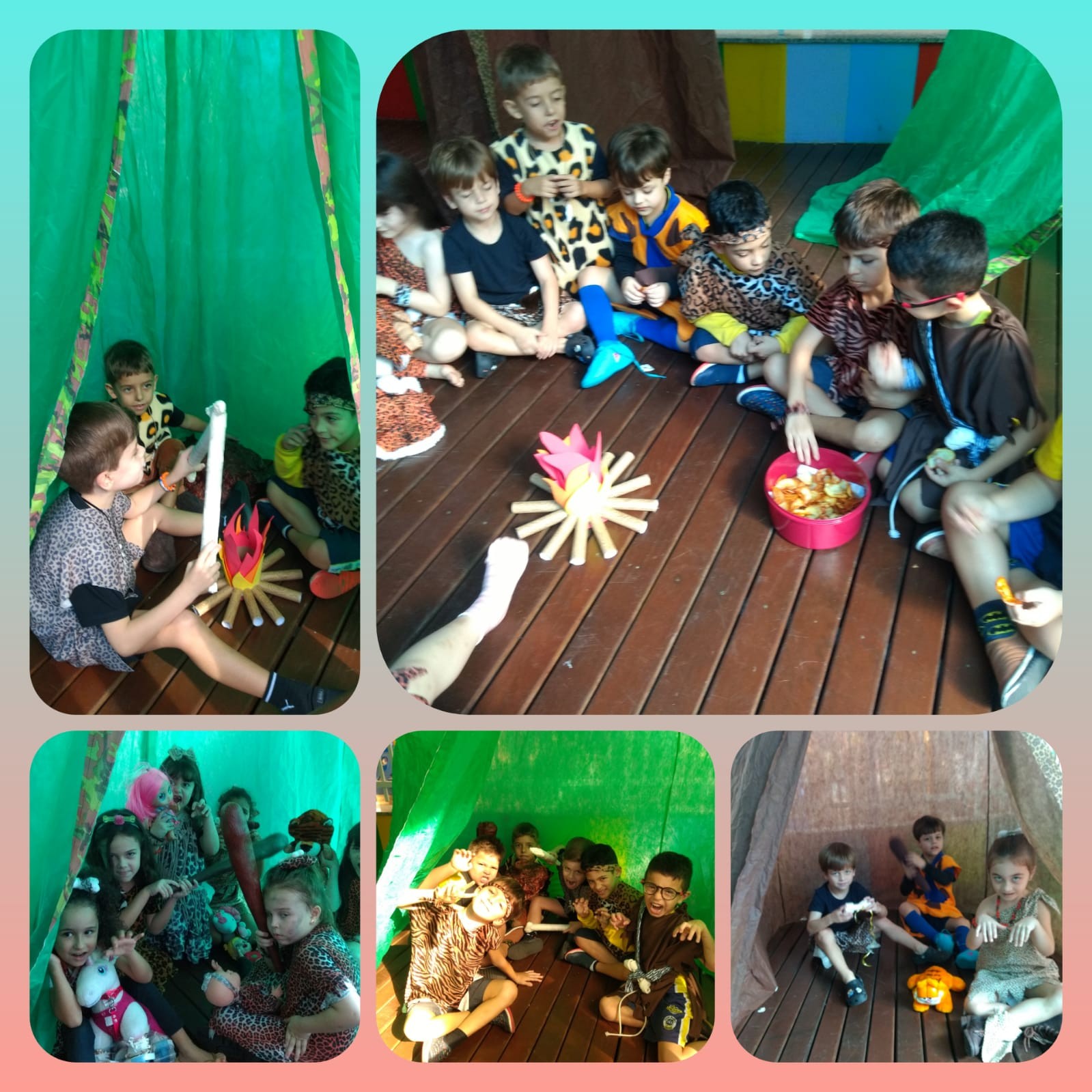 As crianças vestiram-se como “crianças das cavernas” e vivenciaram a organização de suas cavernas com seus pertences trazidos de casa, o domínio do fogo, a modificação do alimento através do fogo, a proteção contra os animais, a iluminação dos espaços, o aquecimento e a interação que este fogo nos trouxe.