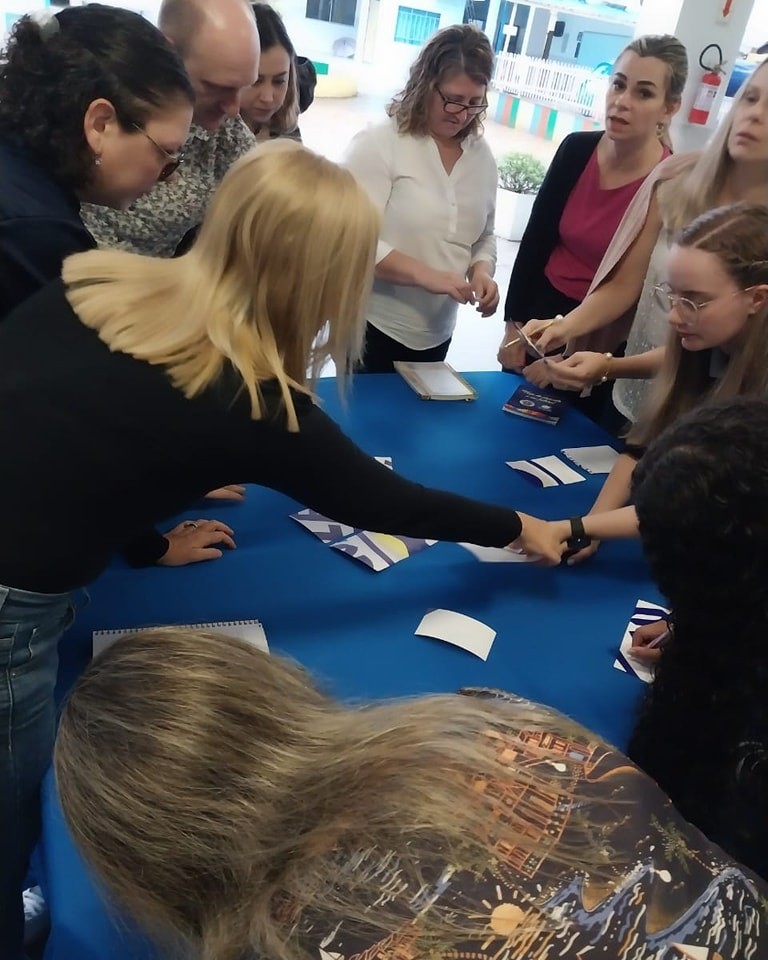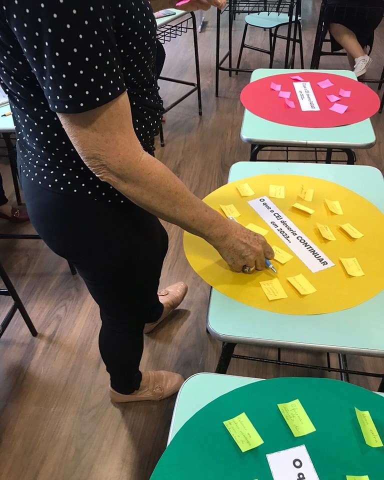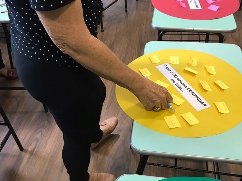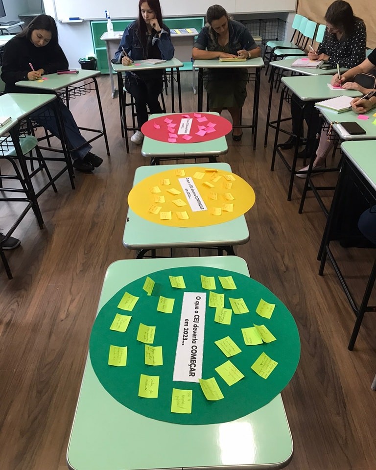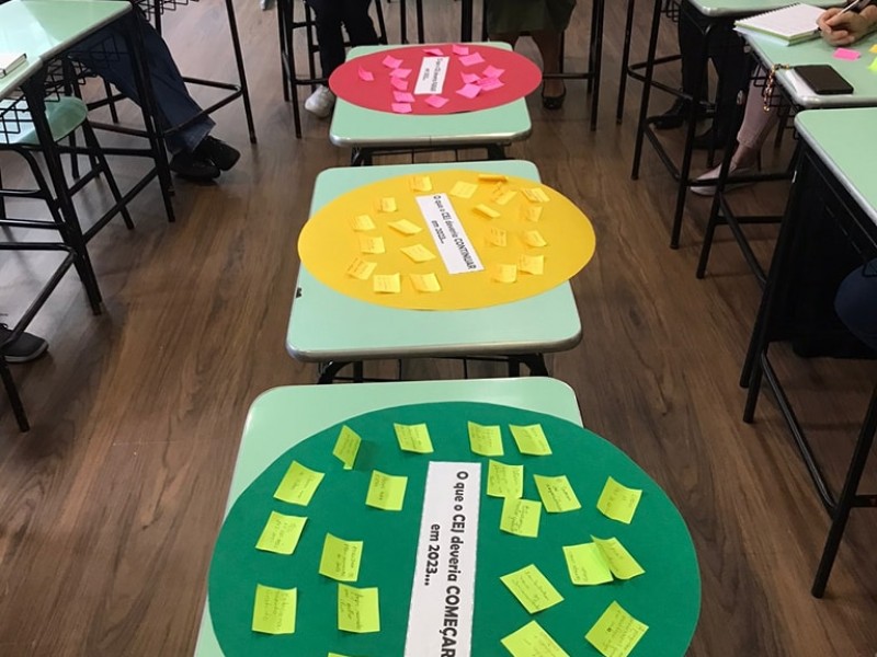 Em seguida, a equipe CEJ foi dividida em grupos e, com a orientação das coordenadoras pedagógicas, cada grupo participou de momentos de reflexão sobre diversos temas: formação continuada, engajamento e compromissos para o próximo ano, avaliação do ano letivo e planejamento do ano seguinte , além da elaboração de um podcast a partir dos aprendizados de uma palestra que assistimos em outubro. Em cada grupo de trabalho diferentes metodologias foram utilizadas para que os objetivos fossem alcançados.