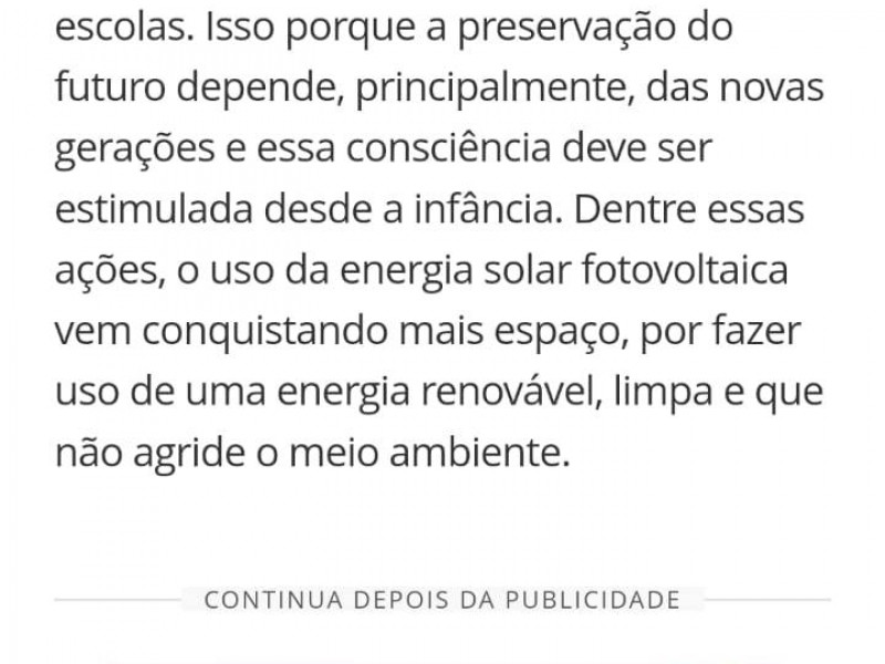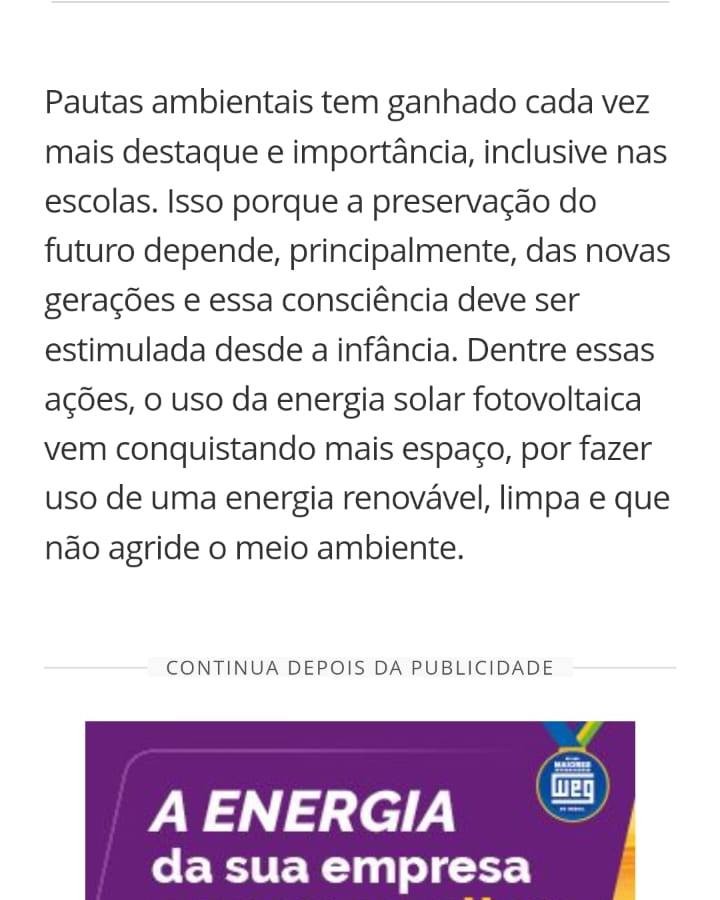 Pautas ambientais tem ganhado cada vez mais destaque e importância, inclusive nas escolas. Isso porque a preservação do futuro depende, principalmente, das novas gerações e essa consciência deve ser estimulada desde a infância. Dentre essas ações, o uso da energia solar fotovoltaica vem conquistando mais espaço, por fazer uso de uma energia renovável, limpa e que não agride o meio ambiente.