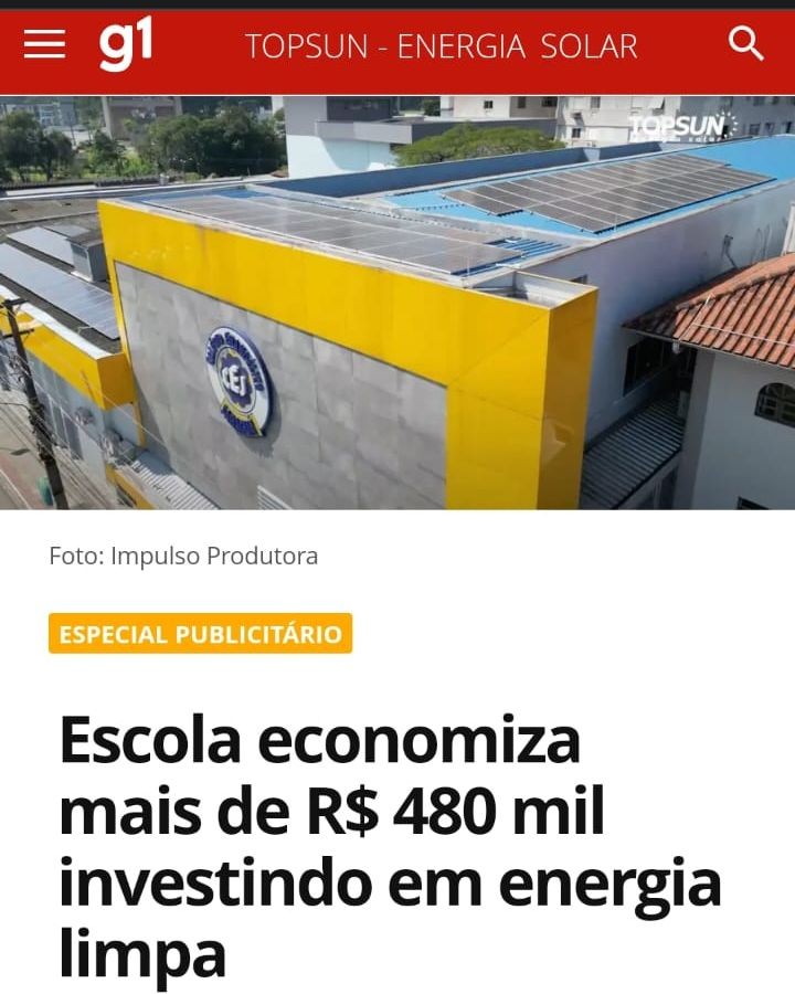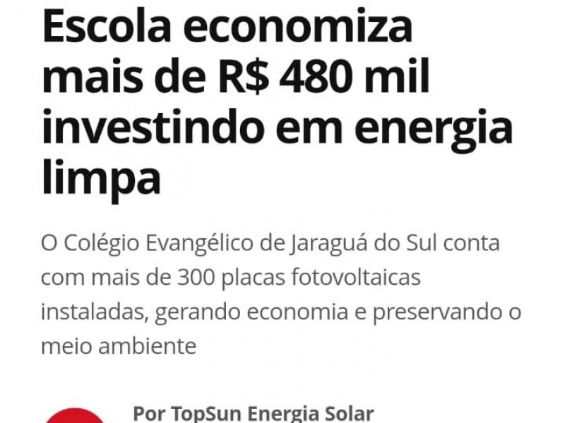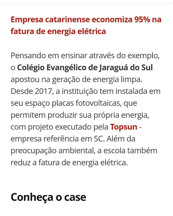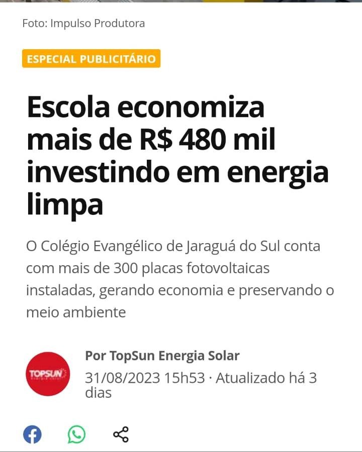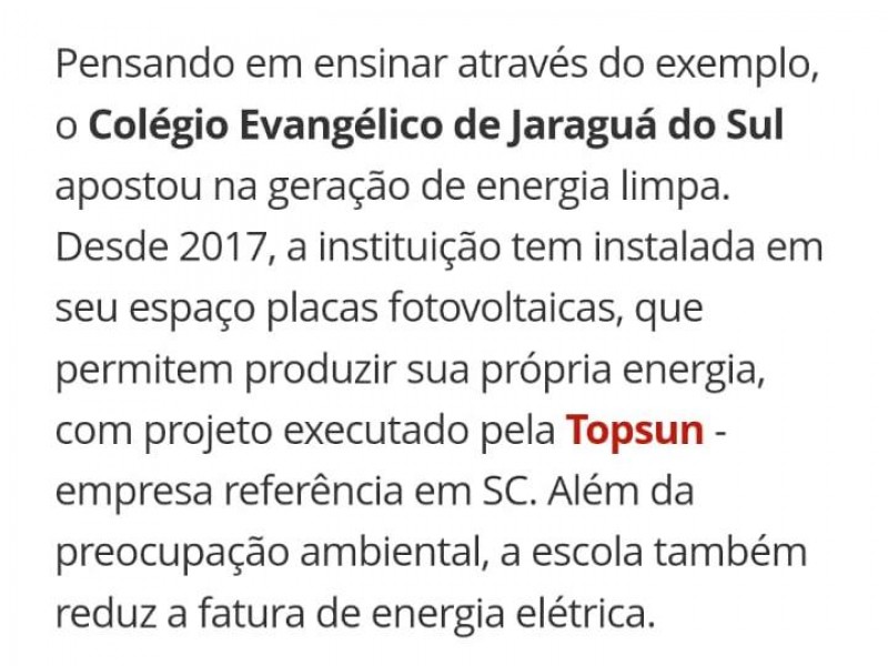 Pensando em ensinar através do exemplo, o Colégio Evangélico de Jaraguá do Sul apostou na geração de energia limpa. Desde 2017, a instituição tem instalada em seu espaço placas fotovoltaicas, que permitem produzir sua própria energia, com projeto executado pela Topsun - empresa referência em SC. Além da preocupação ambiental, a escola também reduz a fatura de energia elétrica.