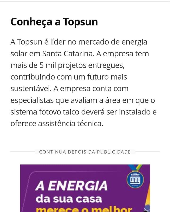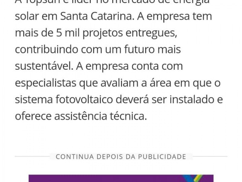 A Topsun é líder no mercado de energia solar em Santa Catarina. A empresa tem mais de 5 mil projetos entregues, contribuindo com um futuro mais sustentável. A empresa conta com especialistas que avaliam a área em que o sistema fotovoltaico deverá ser instalado e oferece assistência técnica.
