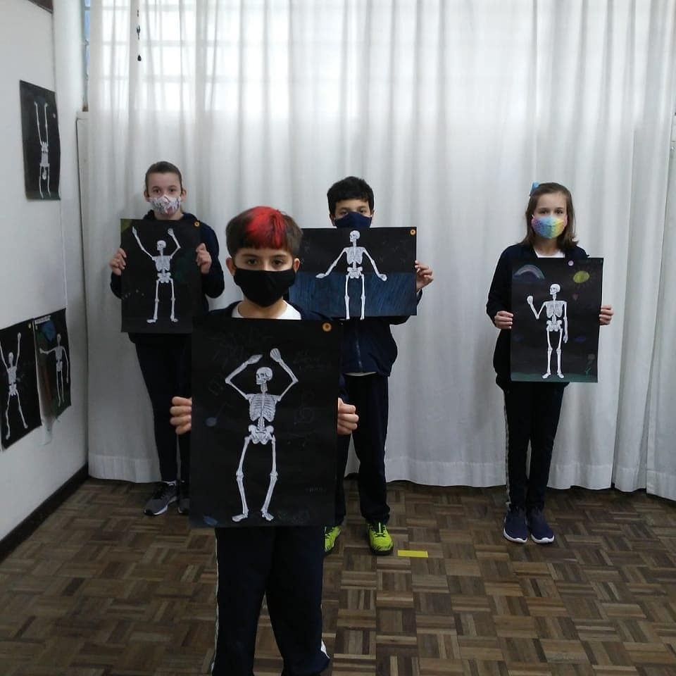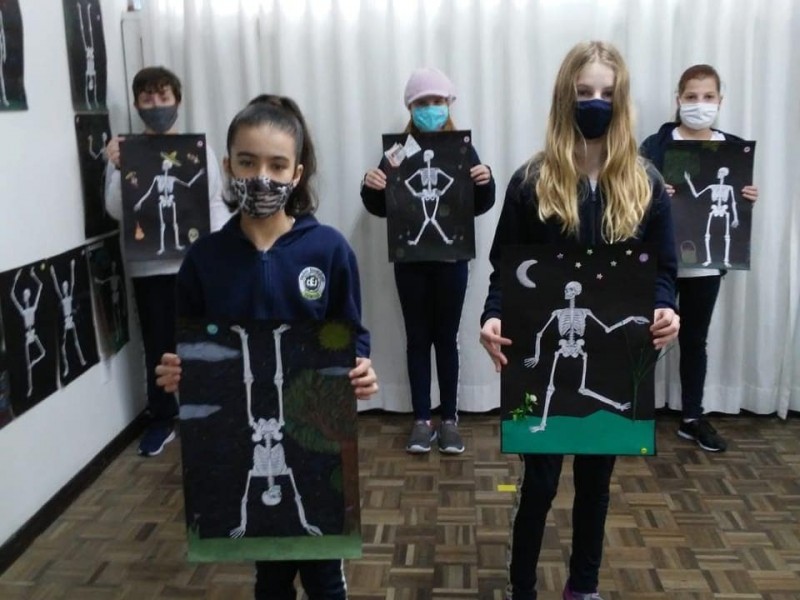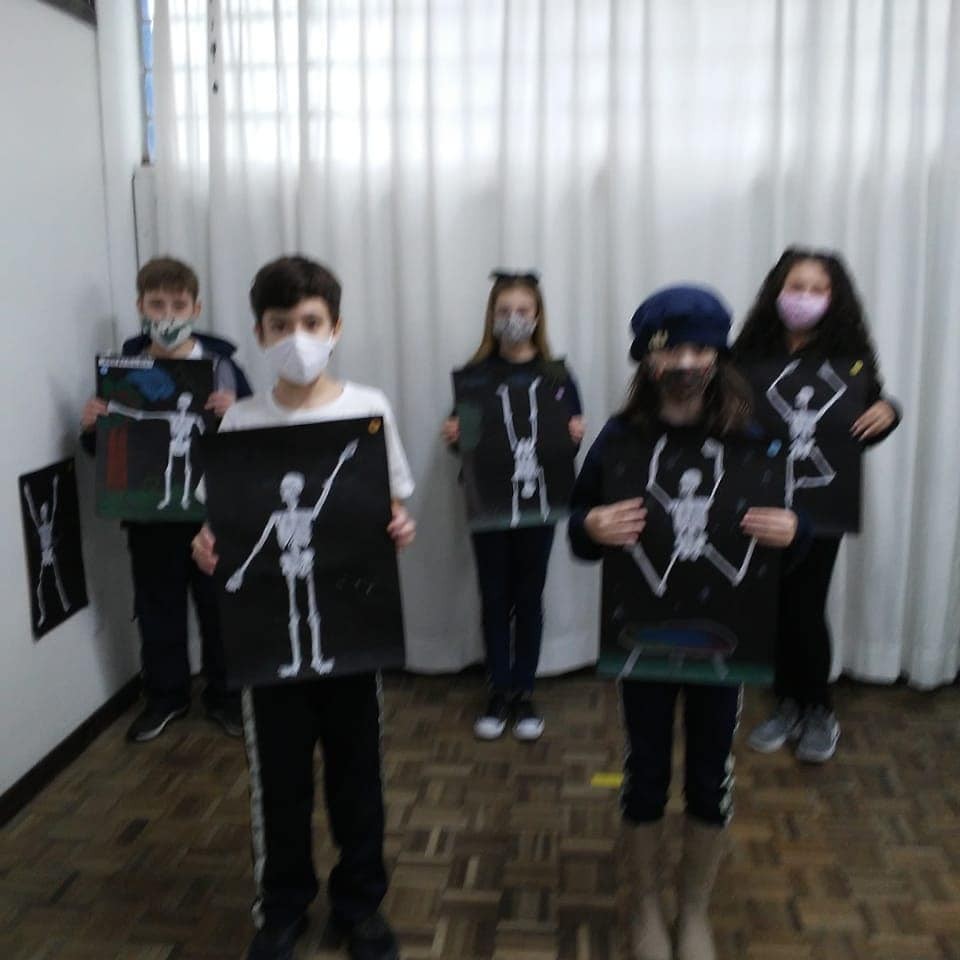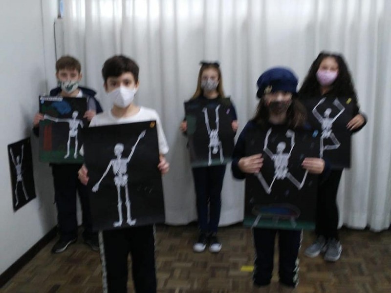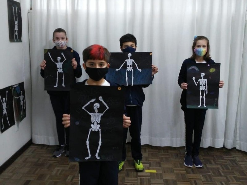 Cada aluno deveria recortar e colar a estrutura óssea corretamente, além de acrescentar um cenário. A posição do esqueleto deveria combinar com a cena. Confira o resultado do trabalho.
