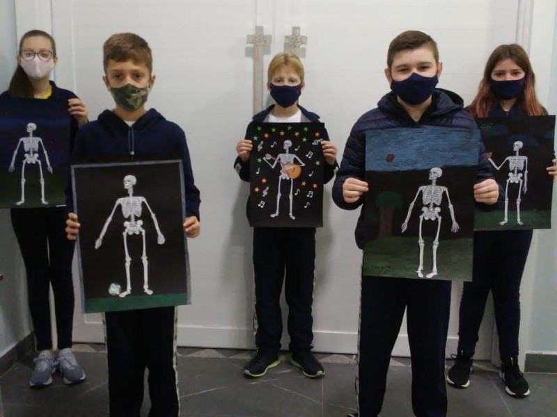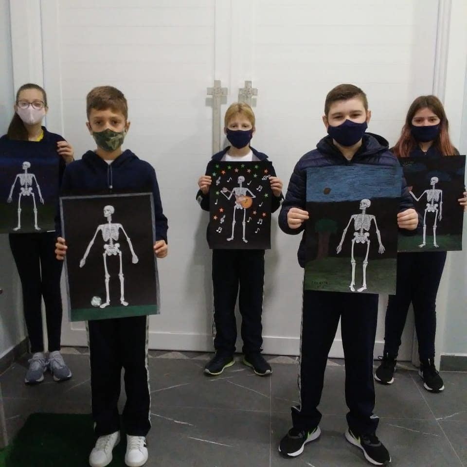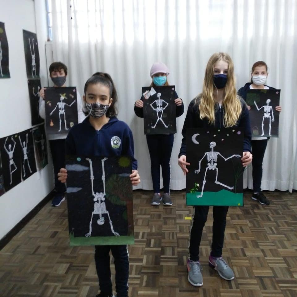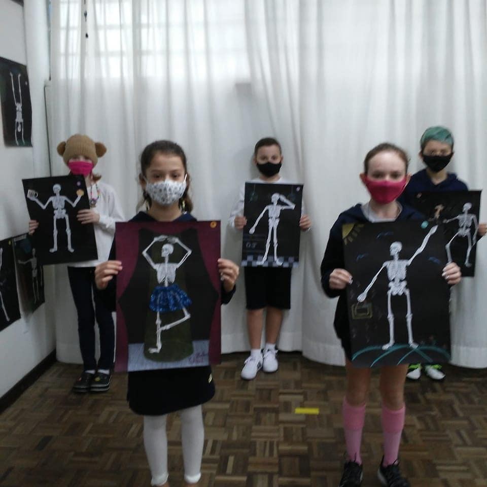 Cada aluno deveria recortar e colar a estrutura óssea corretamente, além de acrescentar um cenário. A posição do esqueleto deveria combinar com a cena. Confira o resultado do trabalho.