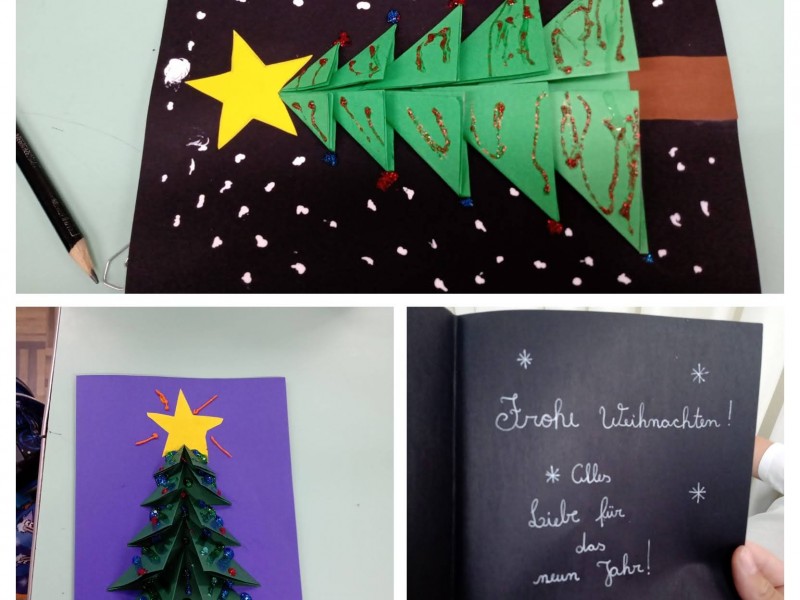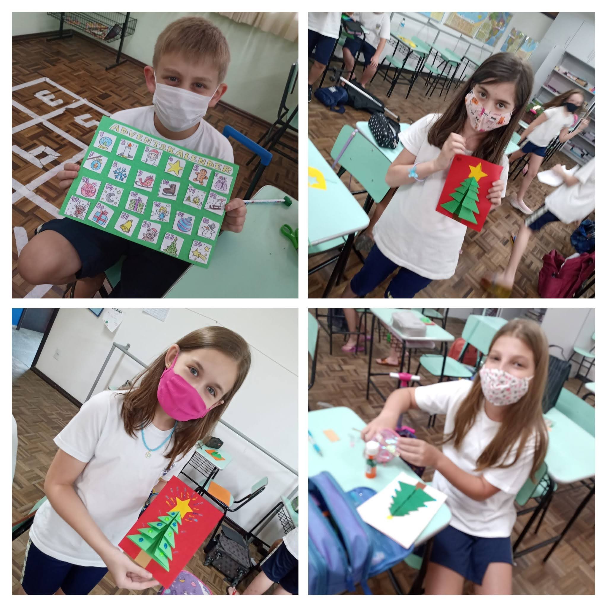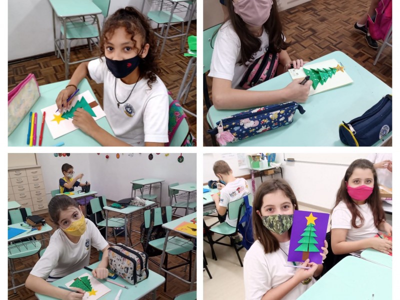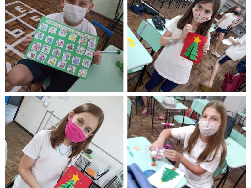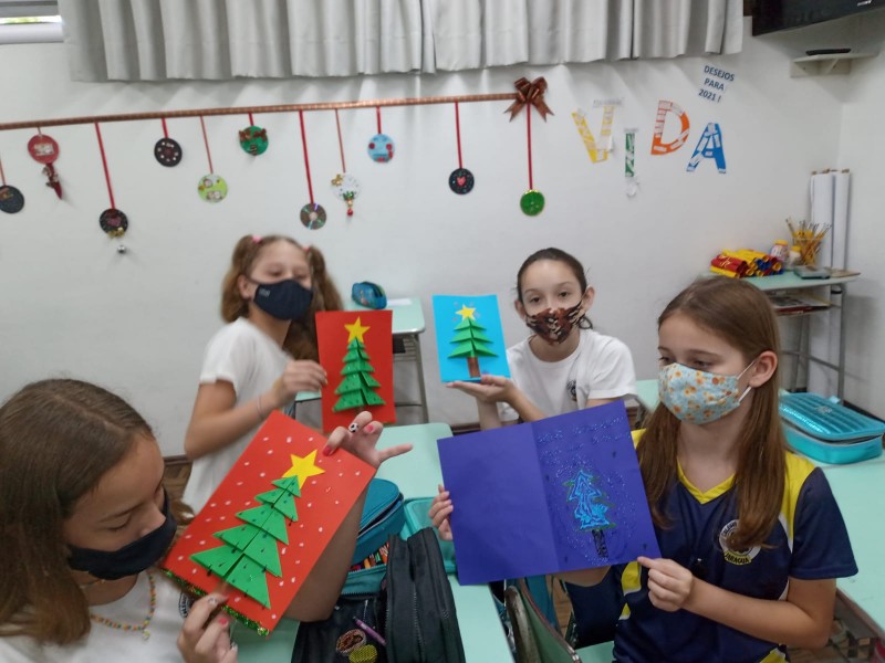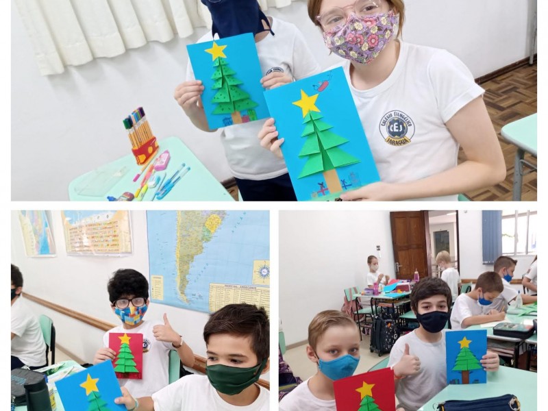 Mais notíciasNas aulas de Alemão dos 4ºs e 5ºs anos elaboramos cartões de Natal trabalhando com dobraduras. Cada aluno decorou seu cartão usando a imaginação e criatividade. Para desejar um feliz e abençoado Natal, utilizaram palavras no idioma alemão.