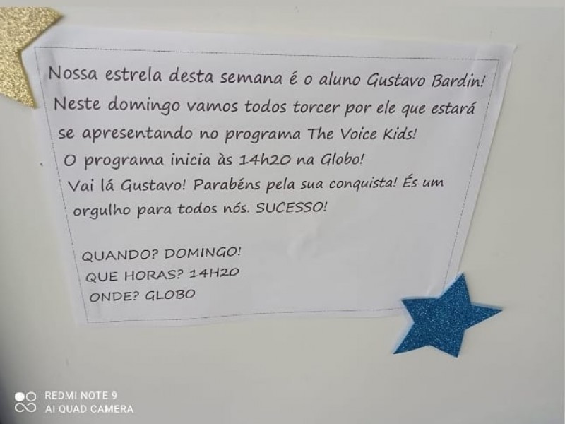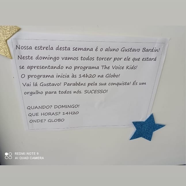 Mais notíciasE hoje, na hora do intervalo, foi o momento de demonstrar ao aluno Gustavo Bardim, do 6º ano A, nosso carinho e torcida para a sua participação no The Voice Kids desse domingo (13 de junho)! Estamos ansiosos para acompanhar a sua estreia e confiantes na virada das cadeiras! O programa tem início às 14h20min.