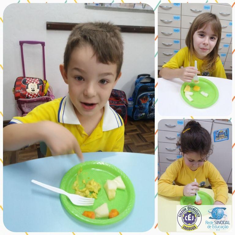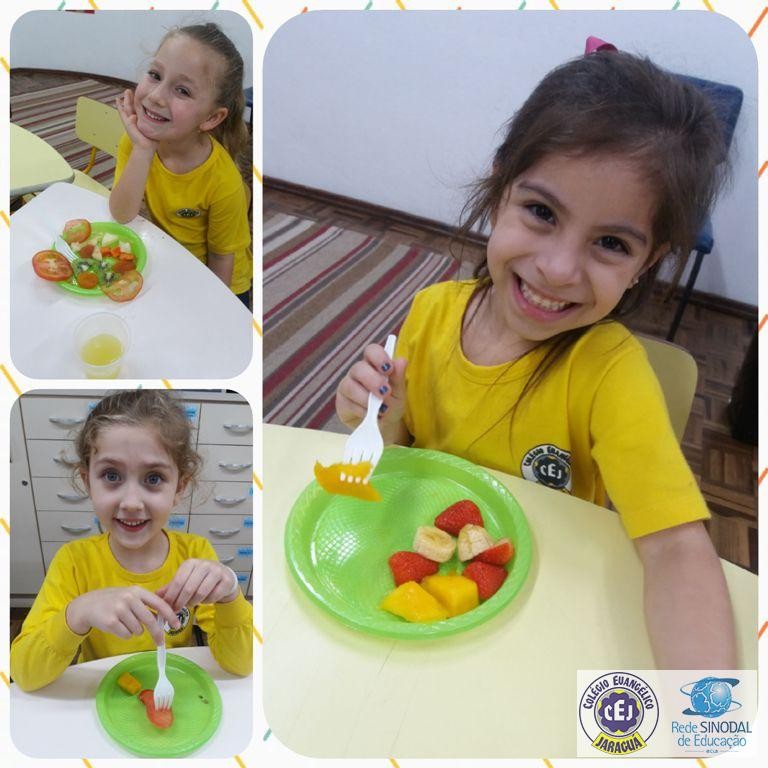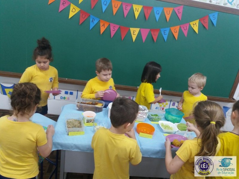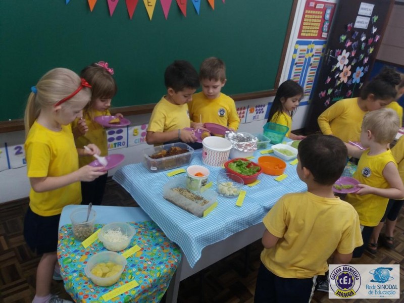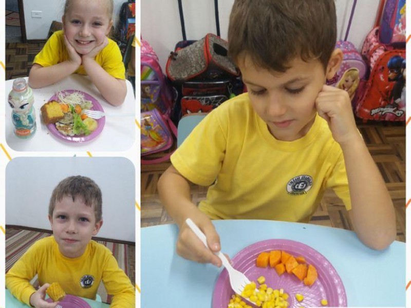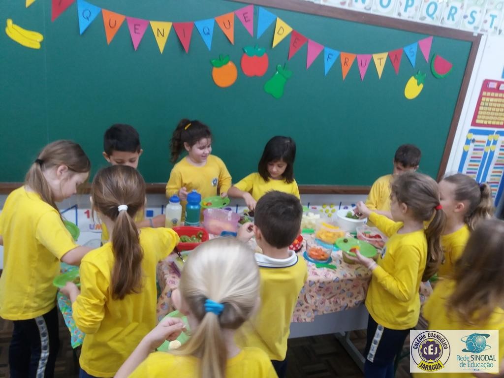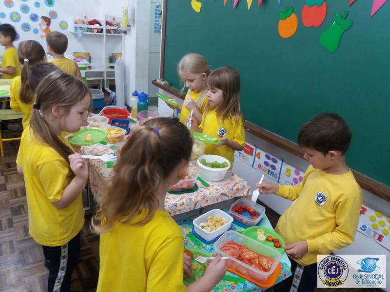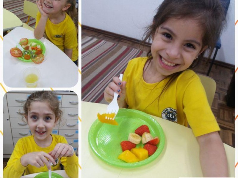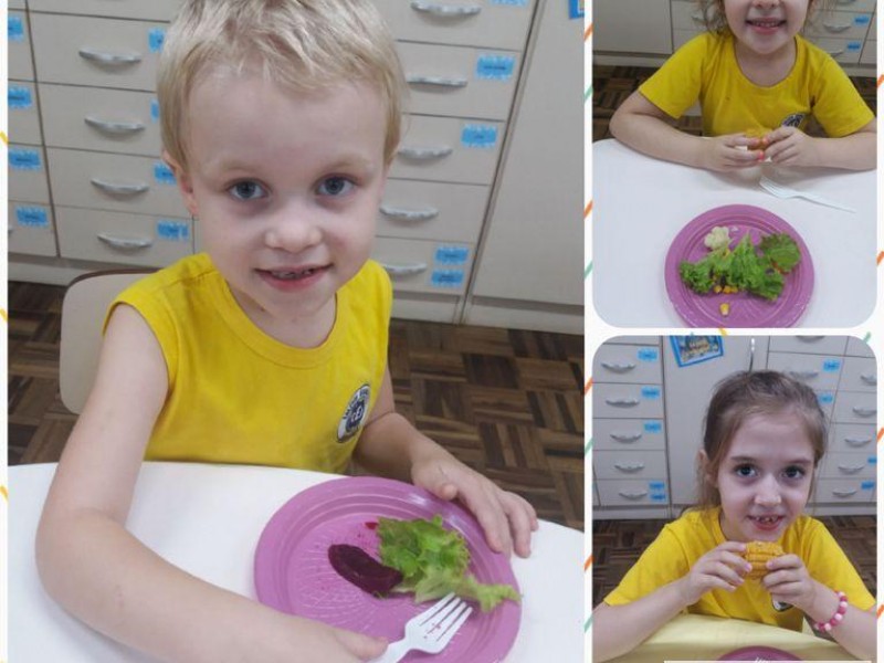 Mais notíciasSabendo da importância de incentivar a alimentação saudável, desde o início do ano letivo no lanche diário a turma do Infantil V A da professora Anne, teve a oportunidade de montar seu prato e provar vários sabores de verduras e de frutas em momentos de piquenique. Além disso, conheceram histórias, músicas e atividades relacionadas ao tema, realizados no final do mês de outubro e início do mês de novembro.