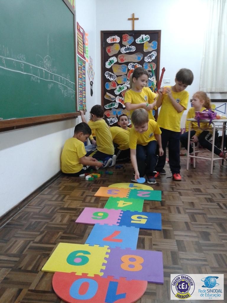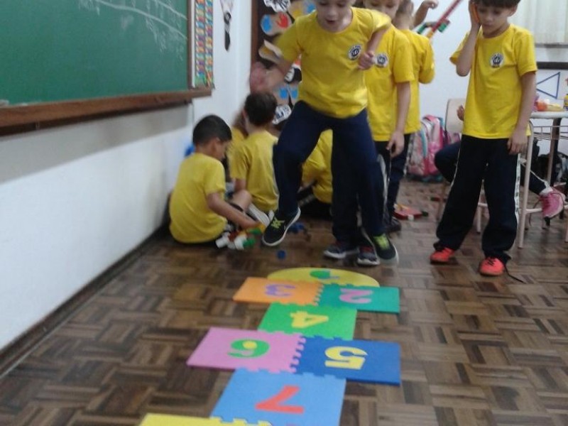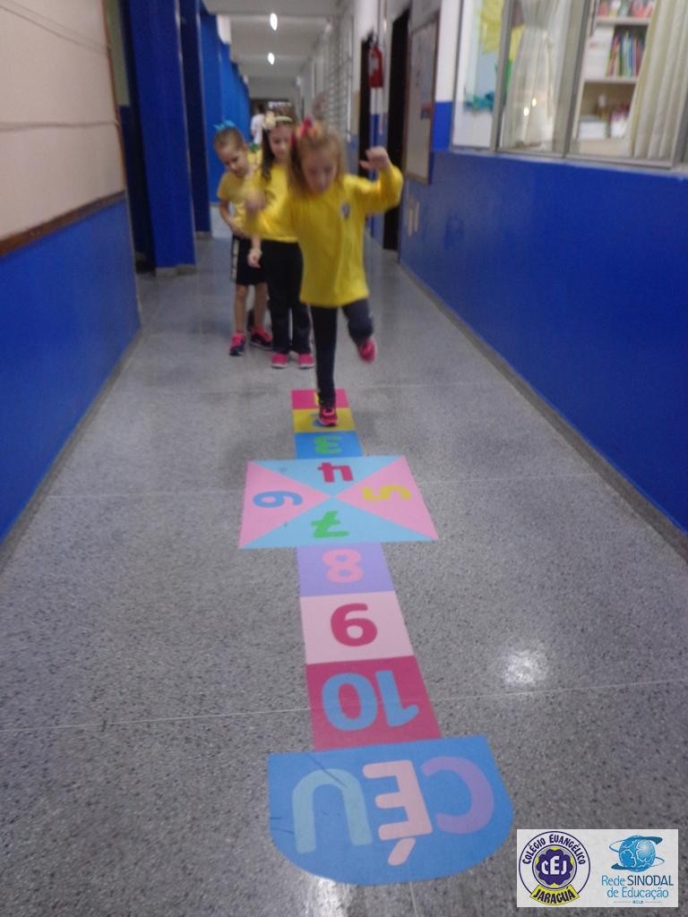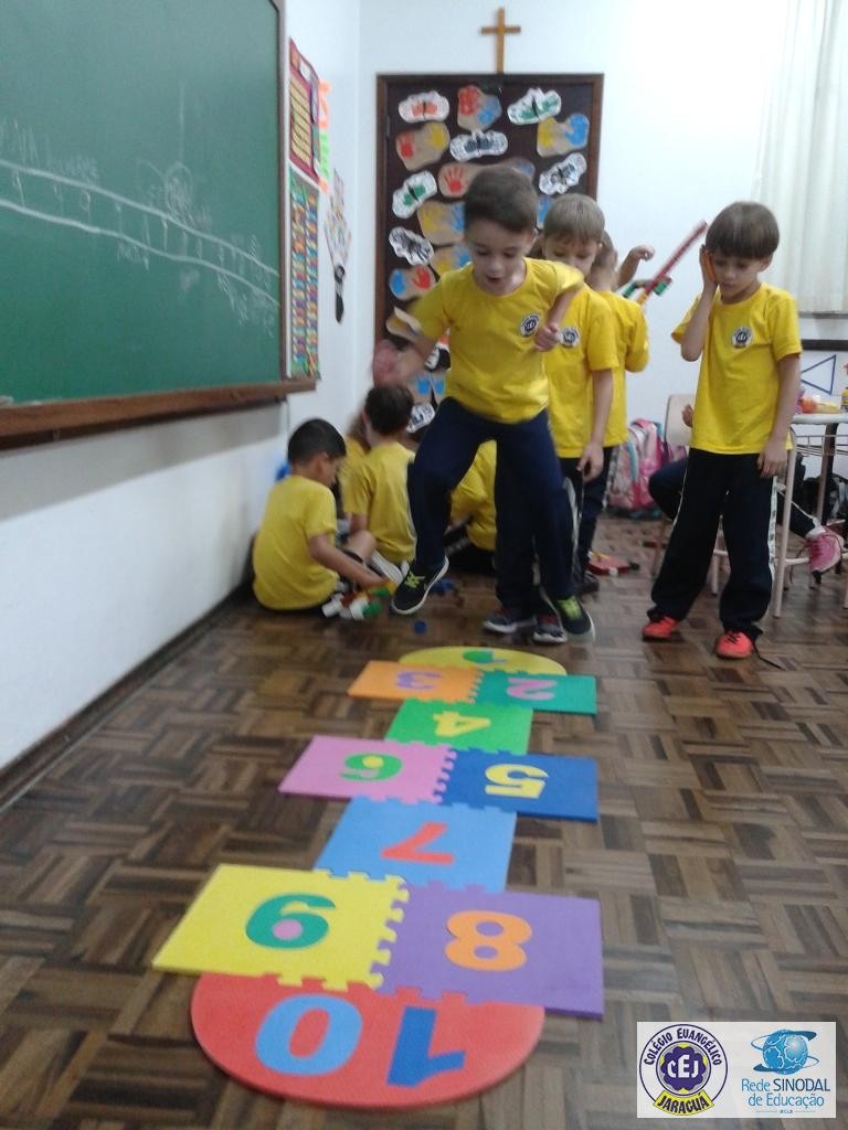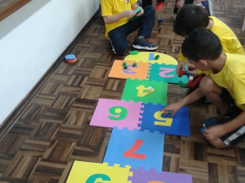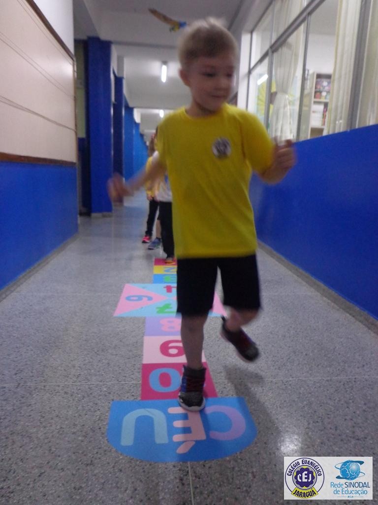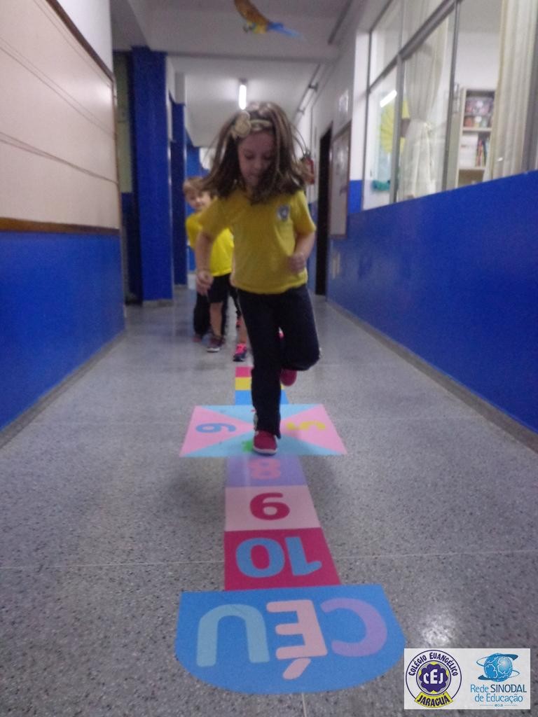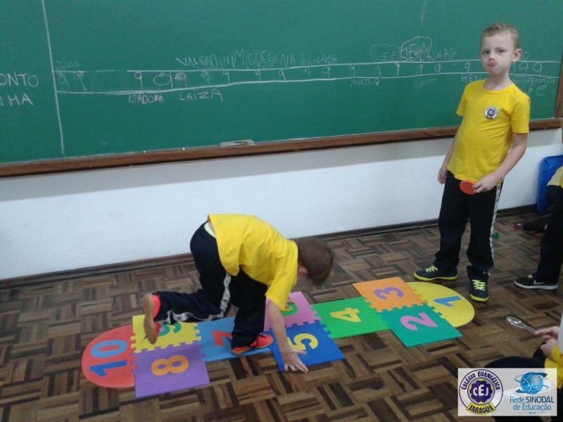 Mais notíciasBrincando, as crianças constroem sentido para o mundo, desenvolvem ideias e habilidades e ainda compreendem conceitos relacionados a cada vivência. Pensando nisso, os alunos do Infantil V B, durante os meses de abril e maio, estão explorando o jogo da Amarelinha com o objetivo de apropriar-se da sequência numérica, da grafia dos números, da quantidade correspondente de cada número. Além disso diversas habilidades são desenvolvidas: o controle corporal ao não pisar na linha, a força muscular ao dar saltos, a orientação espacial ao respeitar os limites da casinha, a coordenação óculo-manual ao lançar a pedrinha, coordenação motora fina ao pegar a pedrinha, o equilíbrio ao ficar em um pé só. As atividades também fortalecem o vínculo de amizade sem deixar de ser uma grande brincadeira.