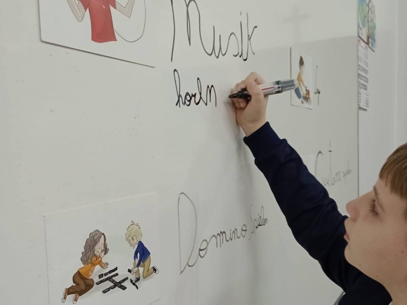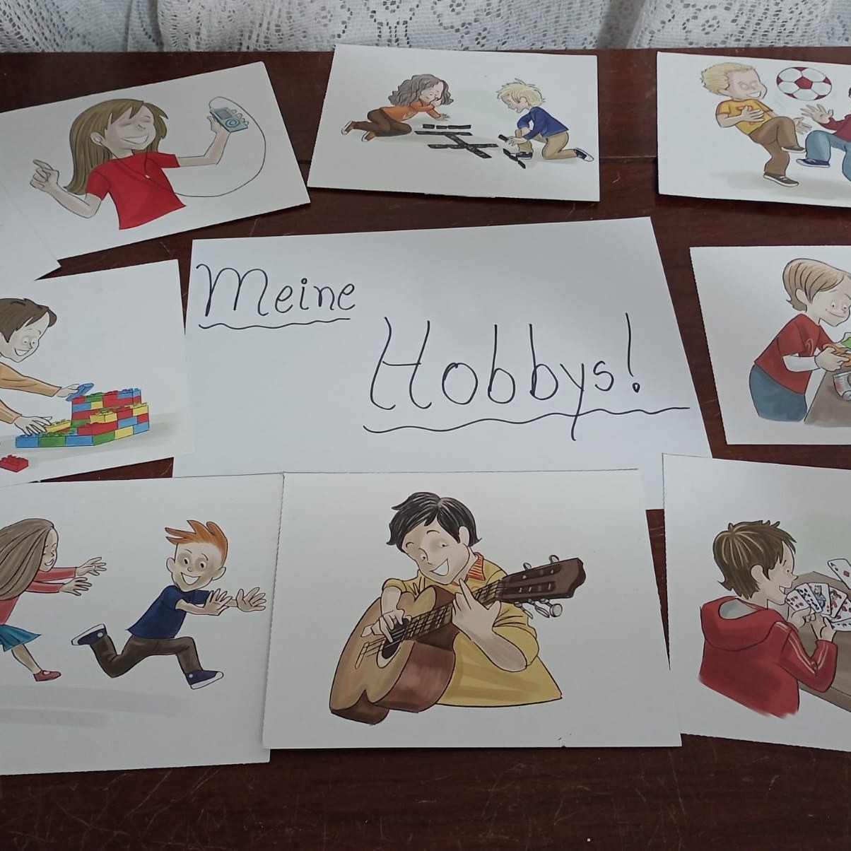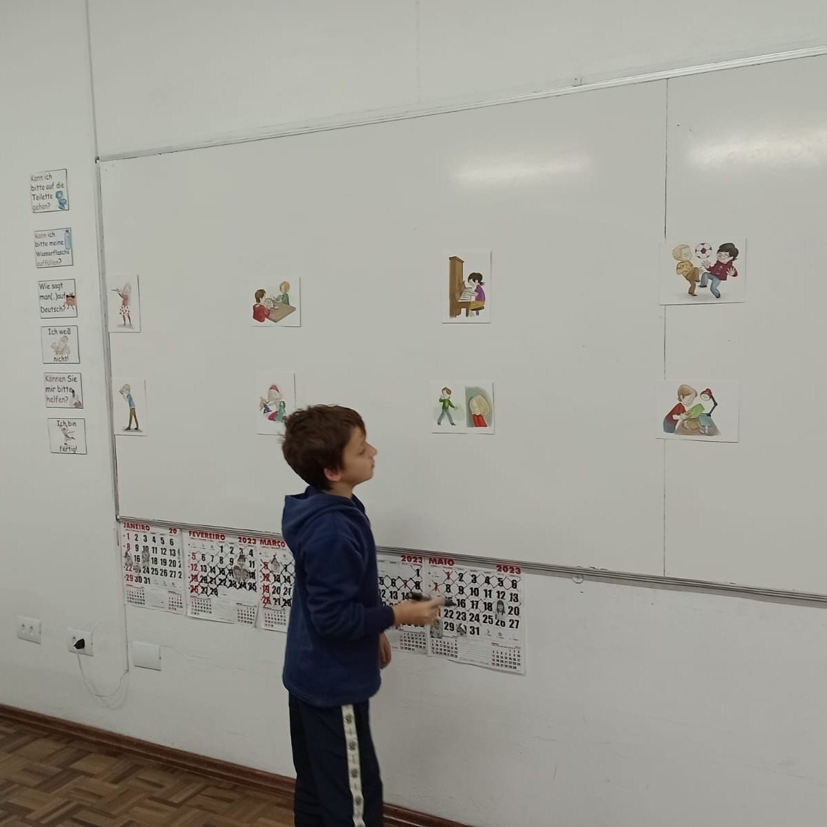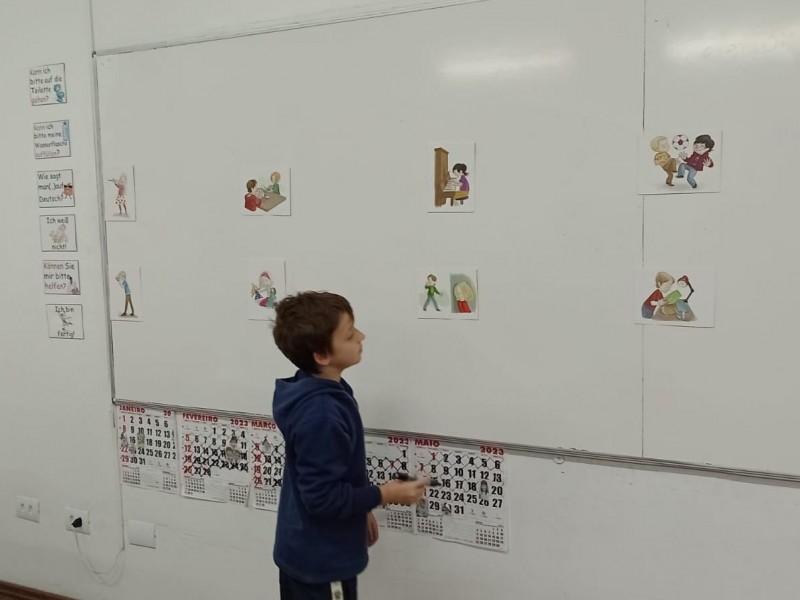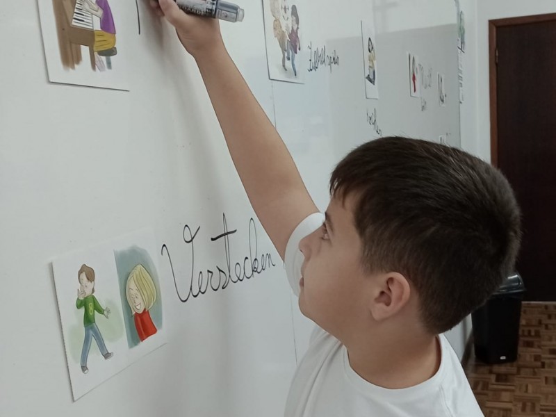 Mais notíciasOs alunos das turmas dos 3ª anos trabalharam nas aulas de Alemão, o vocabulário das palavras encontradas na lição "Meine Hobbys", praticando a escrita das mesmas no quadro juntamente com as cartelas.