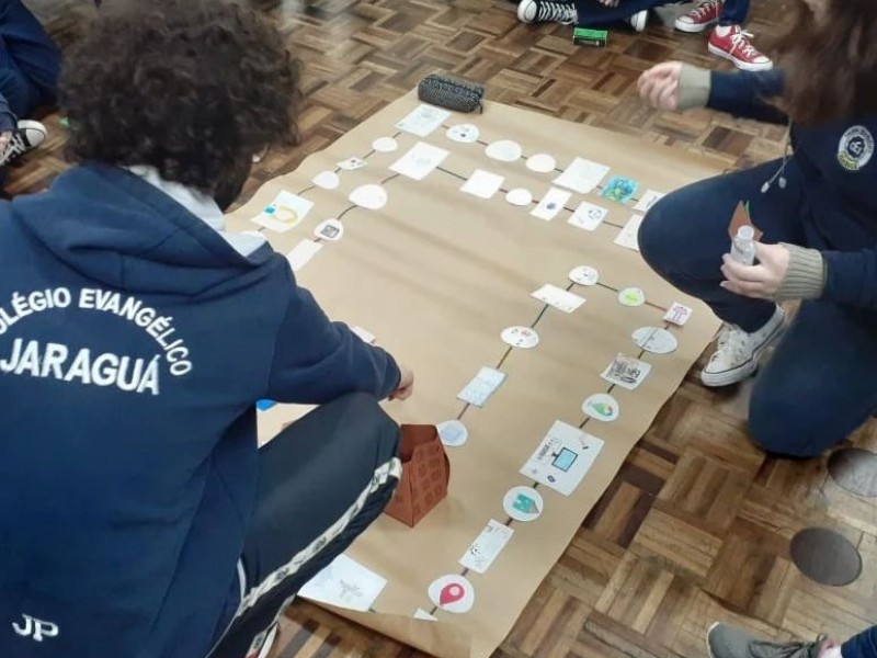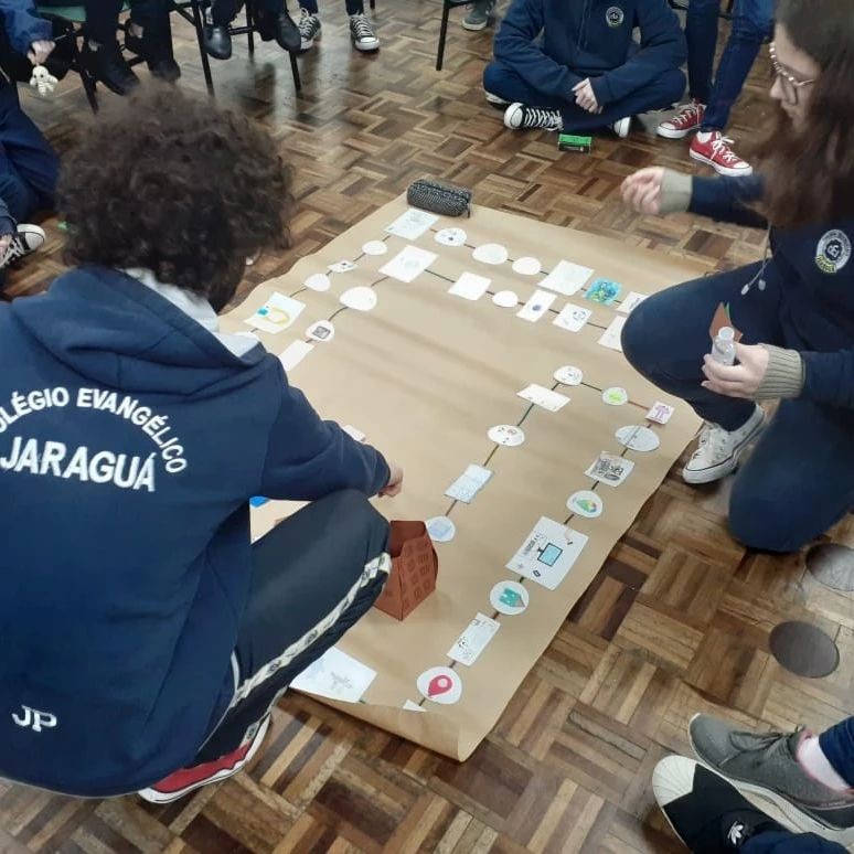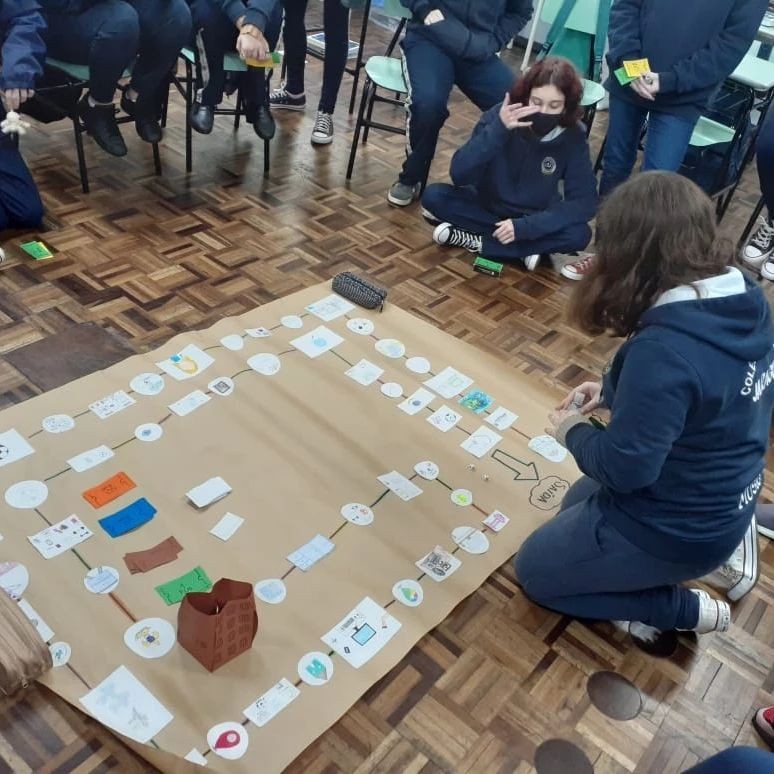 Considerando que Projeto de Vida possui três pilares: pessoal, social e profissional, nas últimas aulas do segundo bimestre a turma do 2º Ano B desenvolveu um tabuleiro para o Jogo da Vida, onde foram desafiados a recriaram regras sociais e de convívio para as personagens do tabuleiro, a partir da realidade social que vivem. Foram aulas de muitas trocas, diálogos, construções e reconstruções para que o tabuleiro ficasse pronto, as regras definidas e para que as personagens pudessem ocupar seus espaços dentro do tabuleiro.