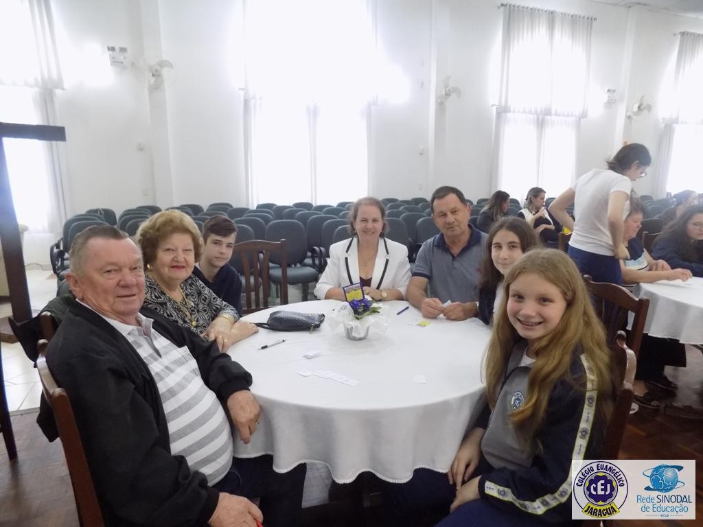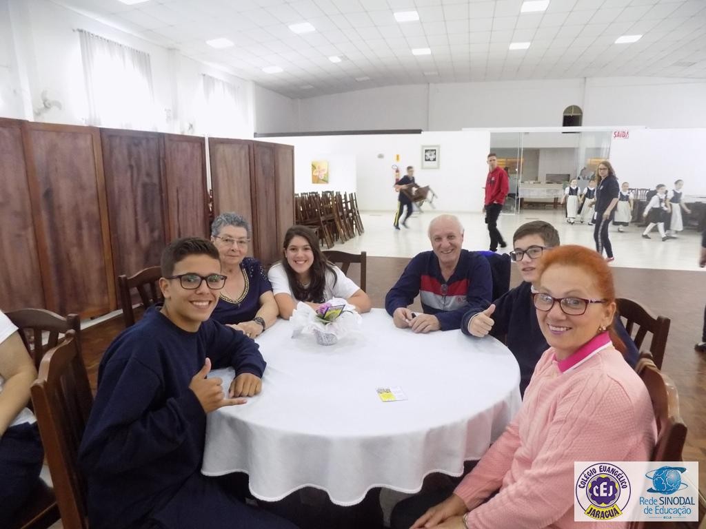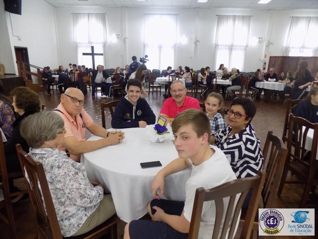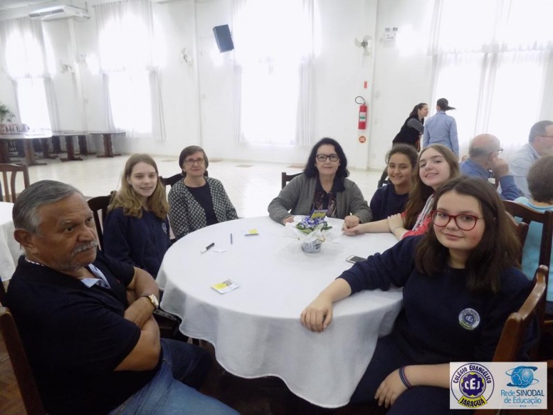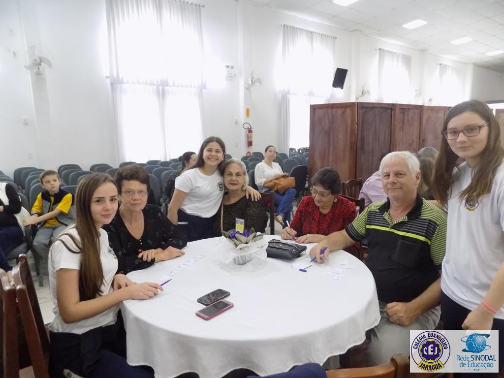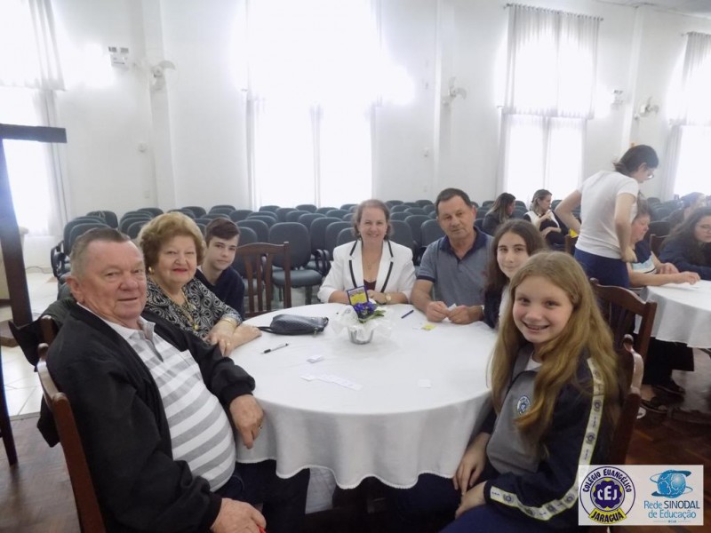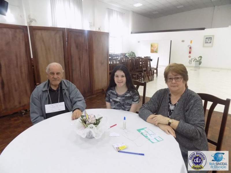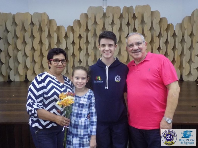 E como finalização do projeto ocorreu a tarde “Amo minha idade”. Evento carinhosamente planejado e elaborado para que alunos e avós vivenciassem momentos nostálgicos e raros, compartilhando histórias e extravasando emoções. O evento contou com a participação dos alunos dos oitavos anos, professores envolvidos e coordenação, profissionais da área da saúde e, logicamente, com as estrelas principais do evento: 39 avós. As atividades foram enriquecidas com muito conhecimento através do bate-papo com o orientador físico e recreador Professor Rafael Ramos, da Ludus Recreação, com o tema “corpo em movimento na terceira idade”, com a psicóloga Bárbara Bretzke conversando sobre “Mente feliz em todas as idades, principalmente na minha”e com a nutricionista Amandha Bernardi abordando o tema “Chás e alimentos benéficos para a melhor idade”.