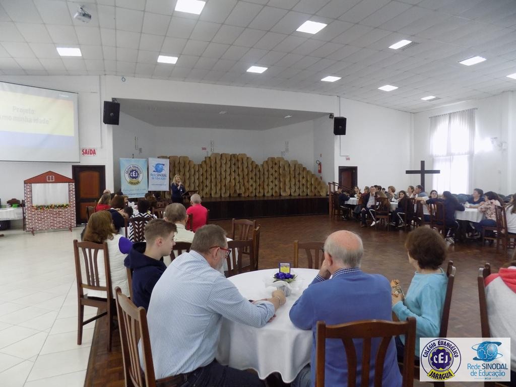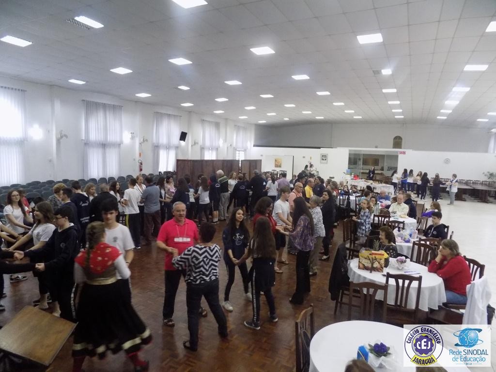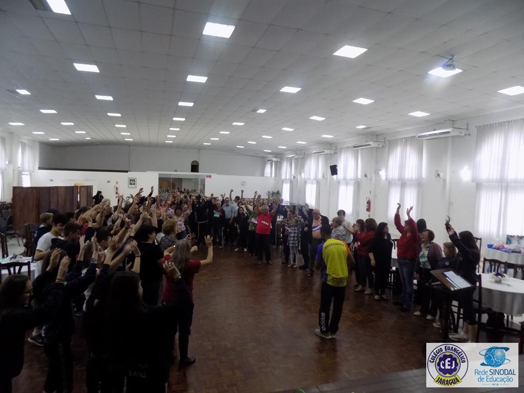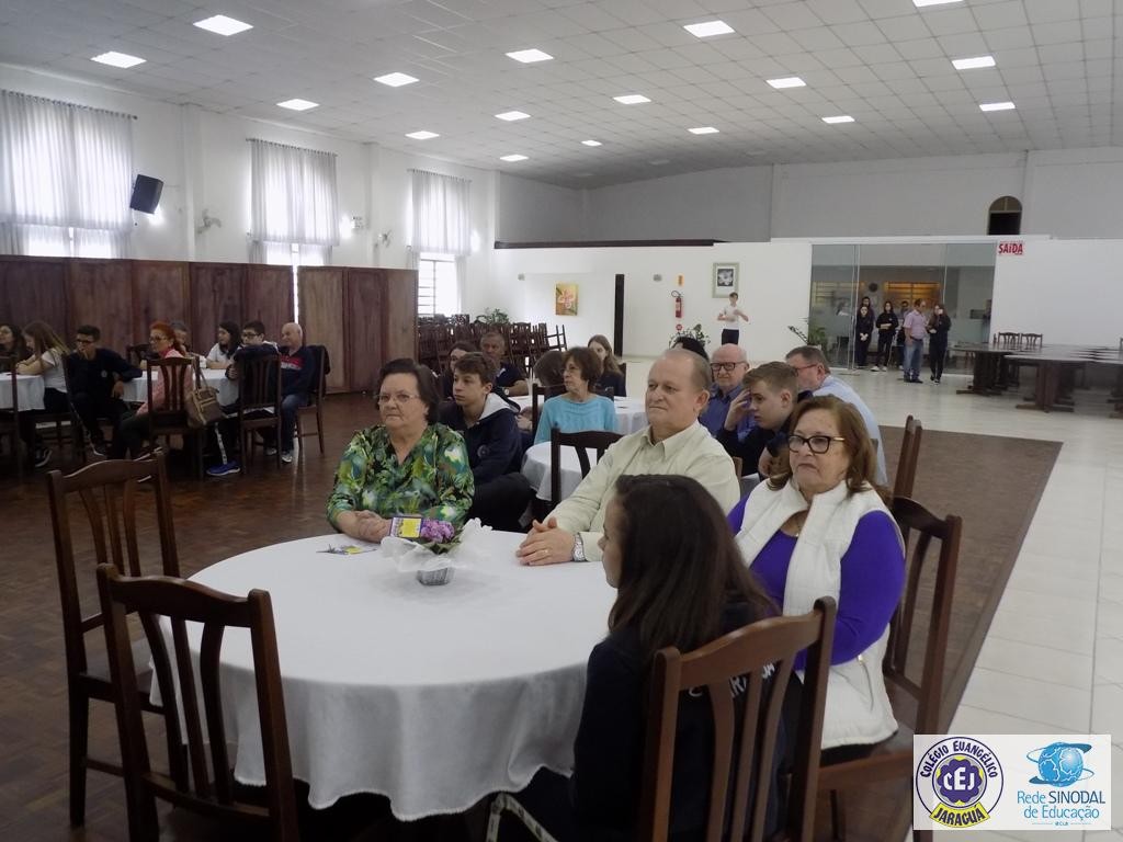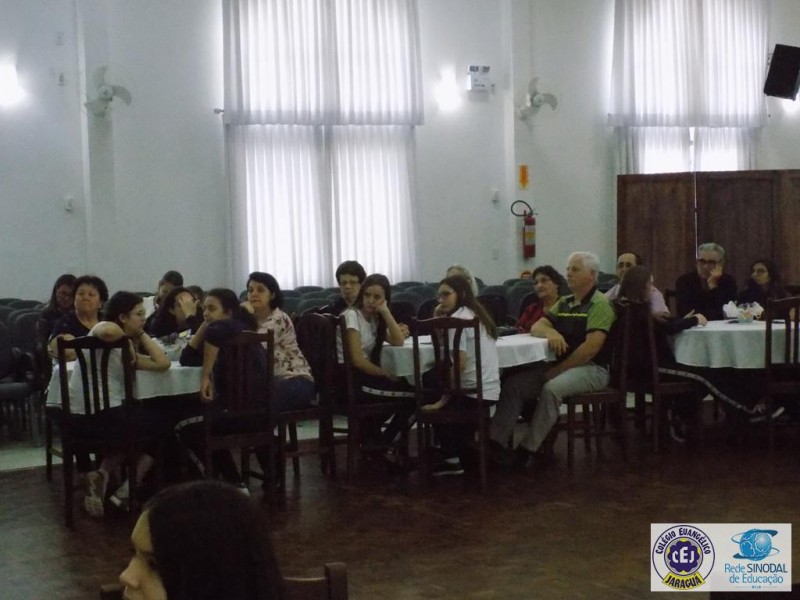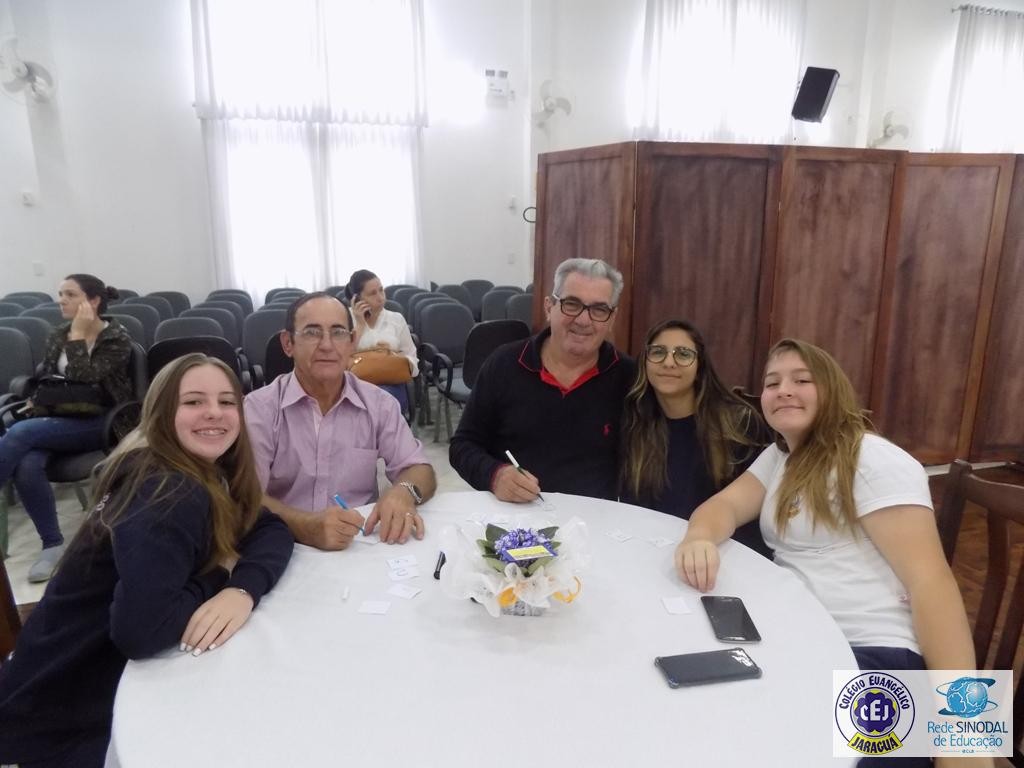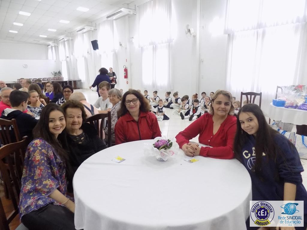 E como finalização do projeto ocorreu a tarde “Amo minha idade”. Evento carinhosamente planejado e elaborado para que alunos e avós vivenciassem momentos nostálgicos e raros, compartilhando histórias e extravasando emoções. O evento contou com a participação dos alunos dos oitavos anos, professores envolvidos e coordenação, profissionais da área da saúde e, logicamente, com as estrelas principais do evento: 39 avós. As atividades foram enriquecidas com muito conhecimento através do bate-papo com o orientador físico e recreador Professor Rafael Ramos, da Ludus Recreação, com o tema “corpo em movimento na terceira idade”, com a psicóloga Bárbara Bretzke conversando sobre “Mente feliz em todas as idades, principalmente na minha”e com a nutricionista Amandha Bernardi abordando o tema “Chás e alimentos benéficos para a melhor idade”.