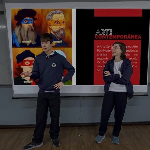 Foi o que os alunos do itinerário formativo de ciências humanas fizeram bastante até aqui. Cada um deles escolheu seu recorte dentro do tema e sua forma de compartilhar as próprias reflexões com os colegas . Na foto, o aluno Felipe da Rocha e a aluna Elisa Fleury apresentam seu trabalho.