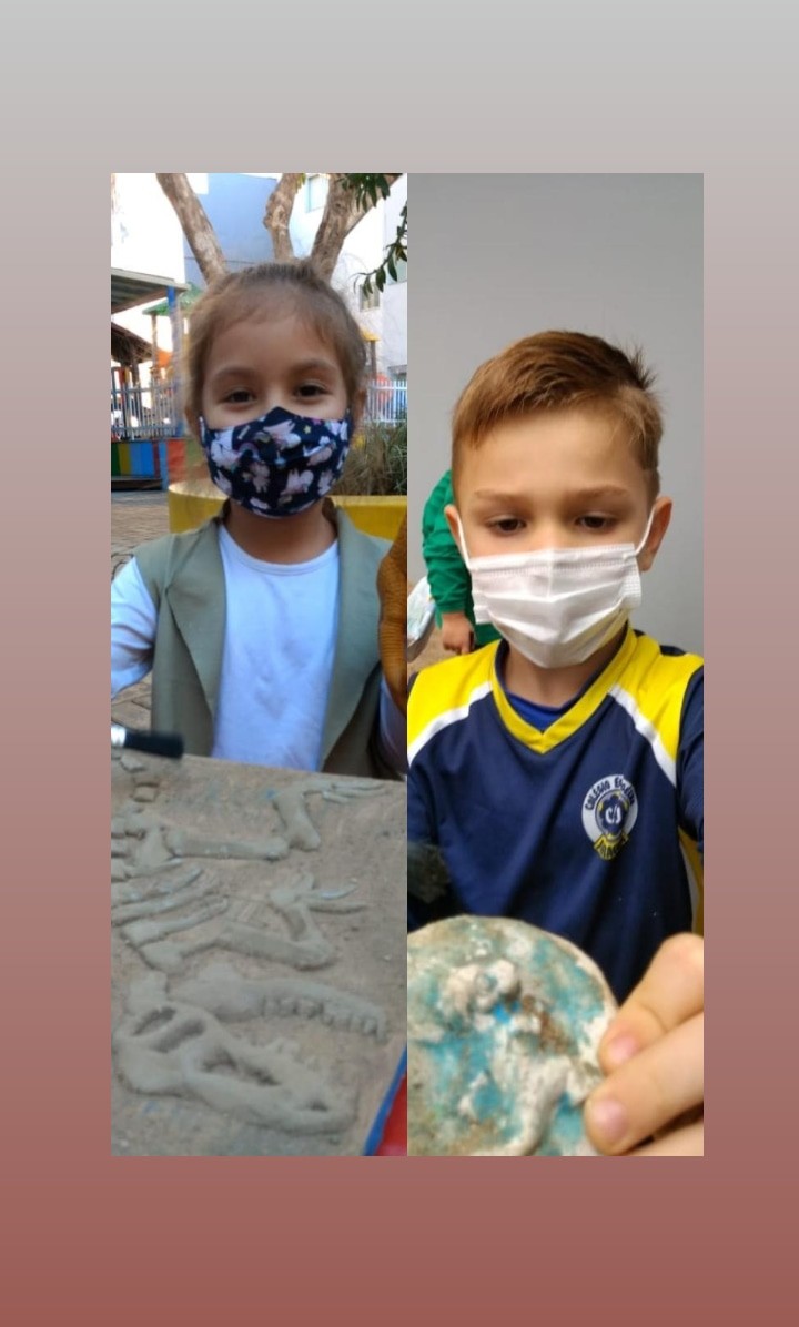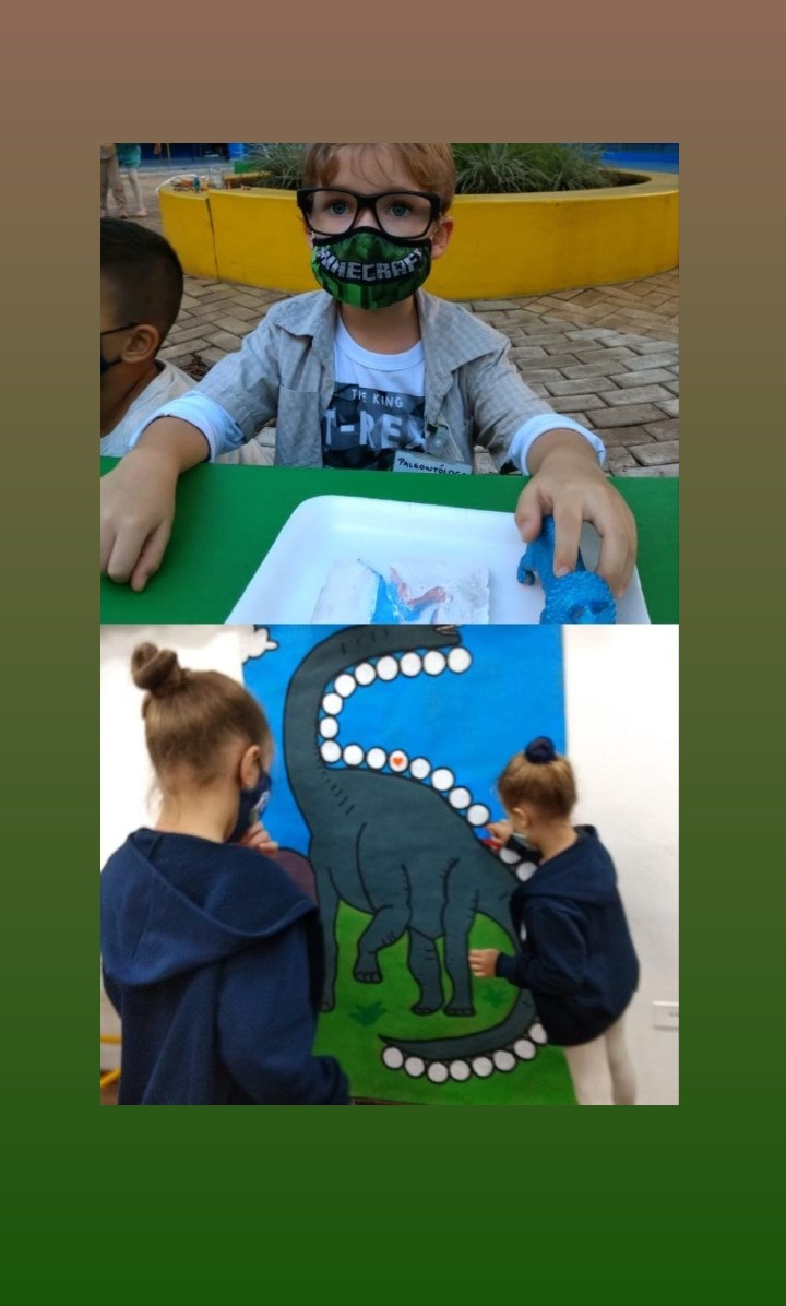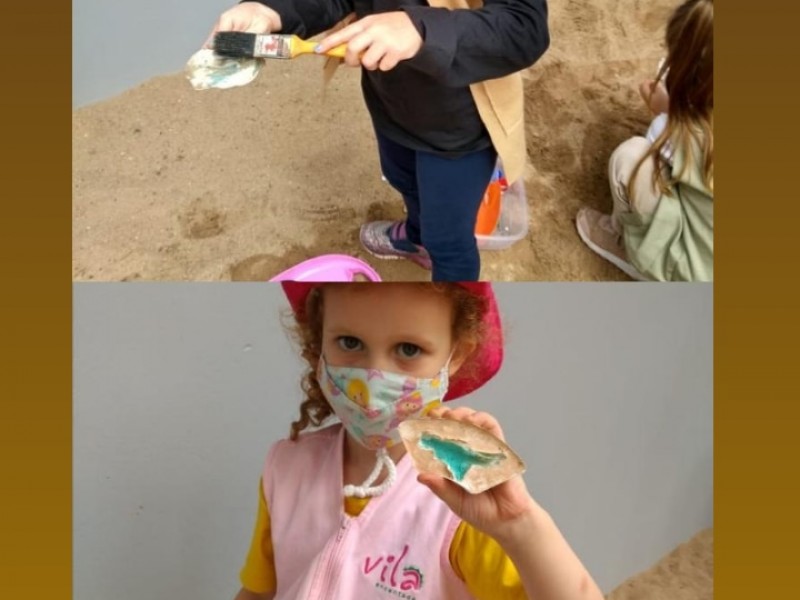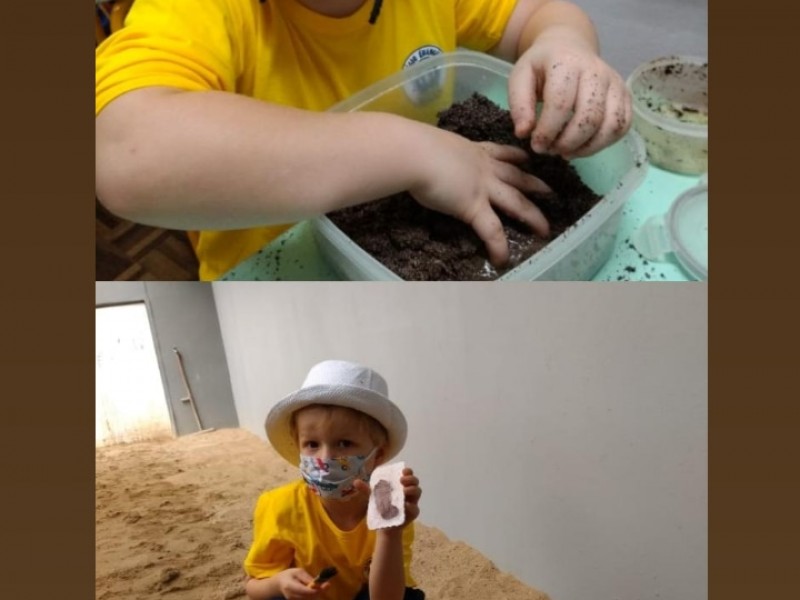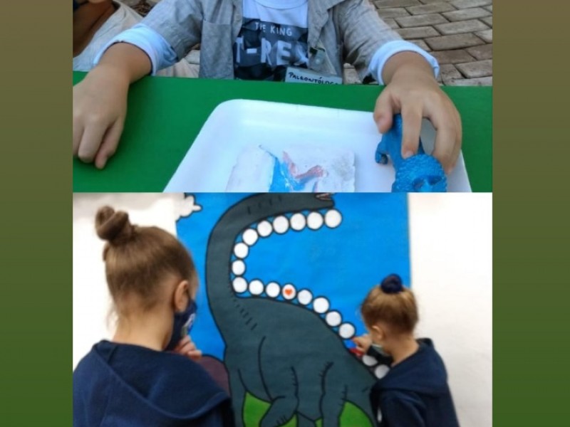 No percurso, demos ênfase aos dinossauros por se tratar de um tema que fascina as crianças. Realizamos diversas atividades lúdicas, como a pesquisa em livros e na internet, a brincadeira de paleontólogo, realizando a simulação de experienciar a escavação de fósseis no sítio paleontológico, a observação de imagens, confecção de massinha para a criação de fósseis, jogo do dinossauro, dança e coreografia da canção “Dinossauros”.