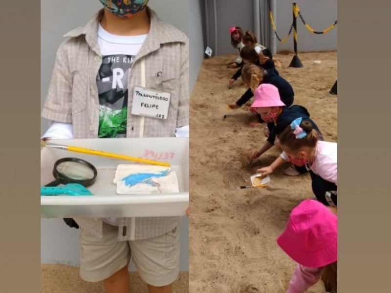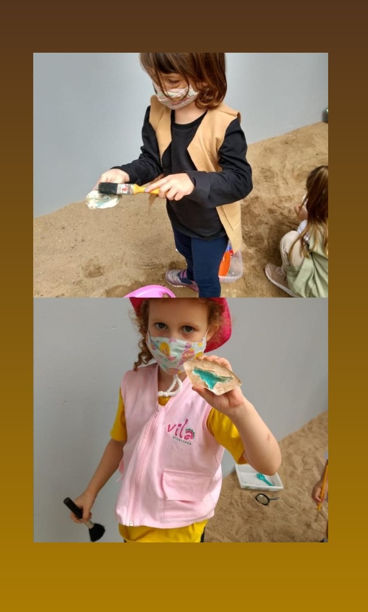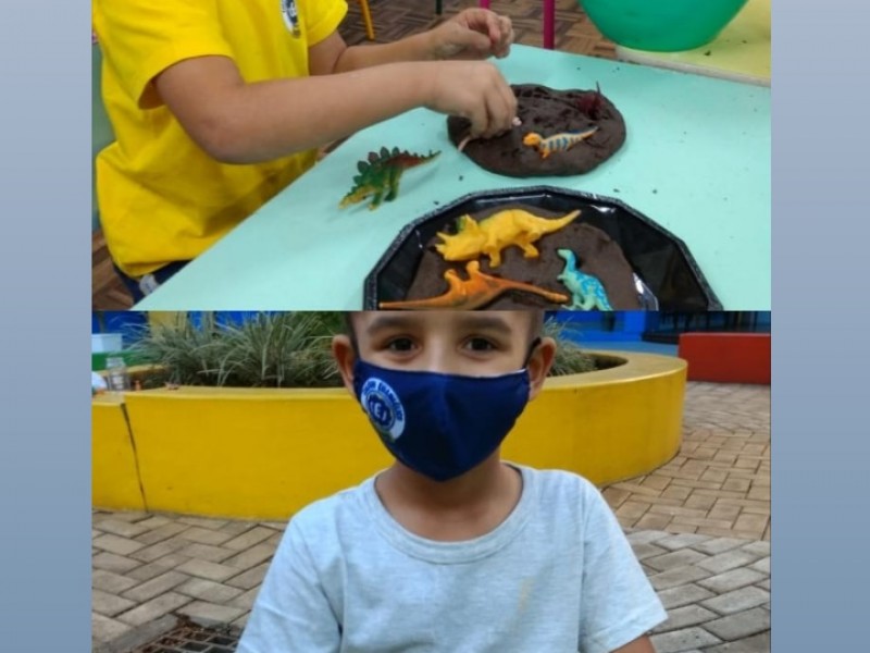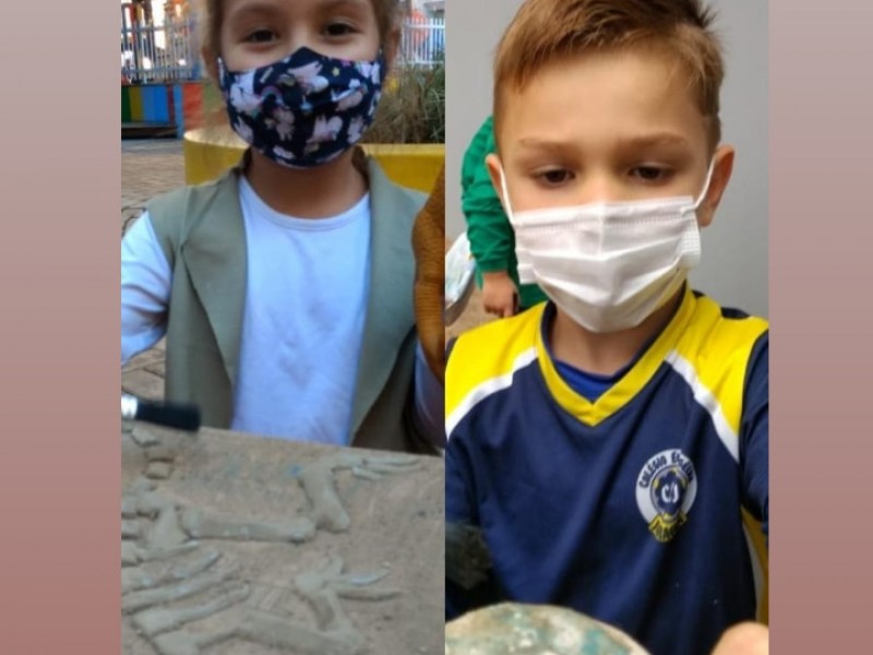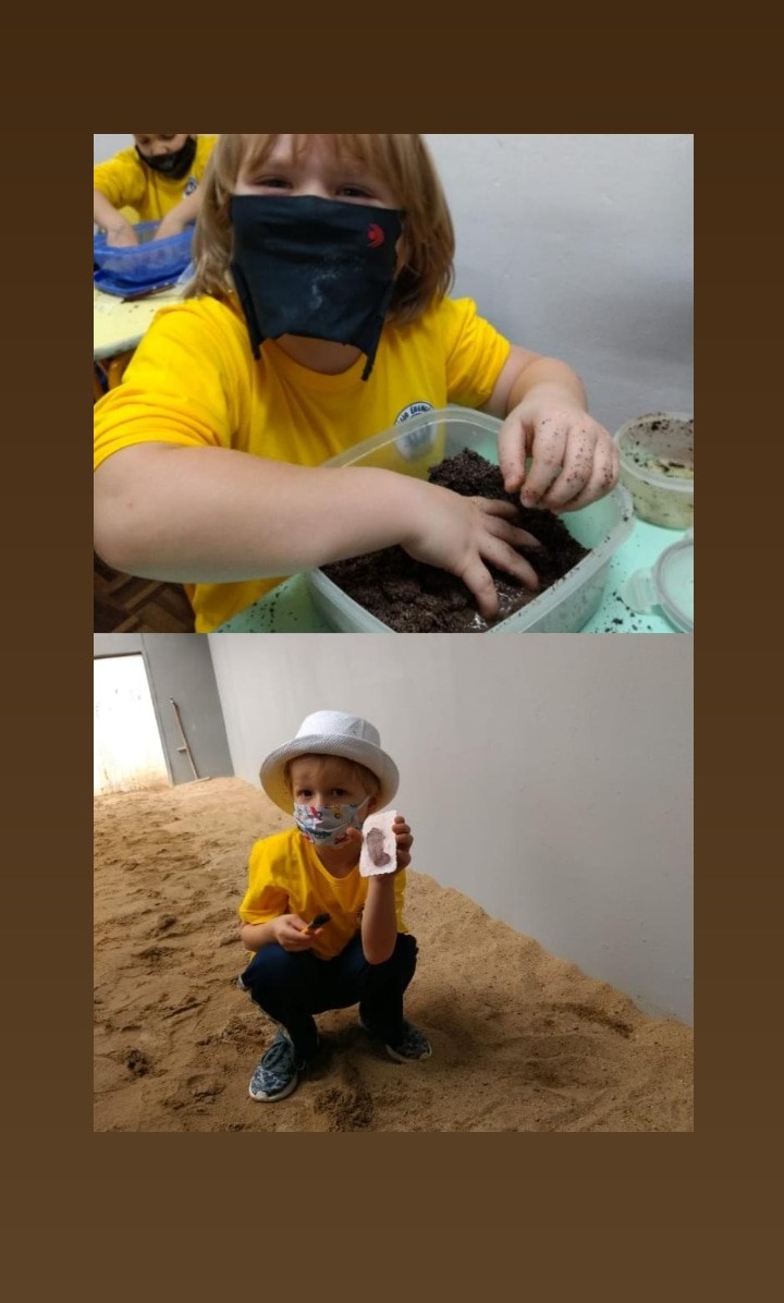 No percurso, demos ênfase aos dinossauros por se tratar de um tema que fascina as crianças. Realizamos diversas atividades lúdicas, como a pesquisa em livros e na internet, a brincadeira de paleontólogo, realizando a simulação de experienciar a escavação de fósseis no sítio paleontológico, a observação de imagens, confecção de massinha para a criação de fósseis, jogo do dinossauro, dança e coreografia da canção “Dinossauros”.