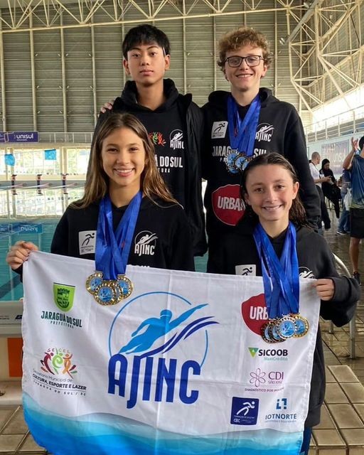 Os alunos e atletas do CEJ, Rayssa Isabelle Piaotquewicz, Isabela Possamai, Erick Lima e Tiago Yoshioka Ouki participaram do Campeonato Catarinense de Natacao de Inverno