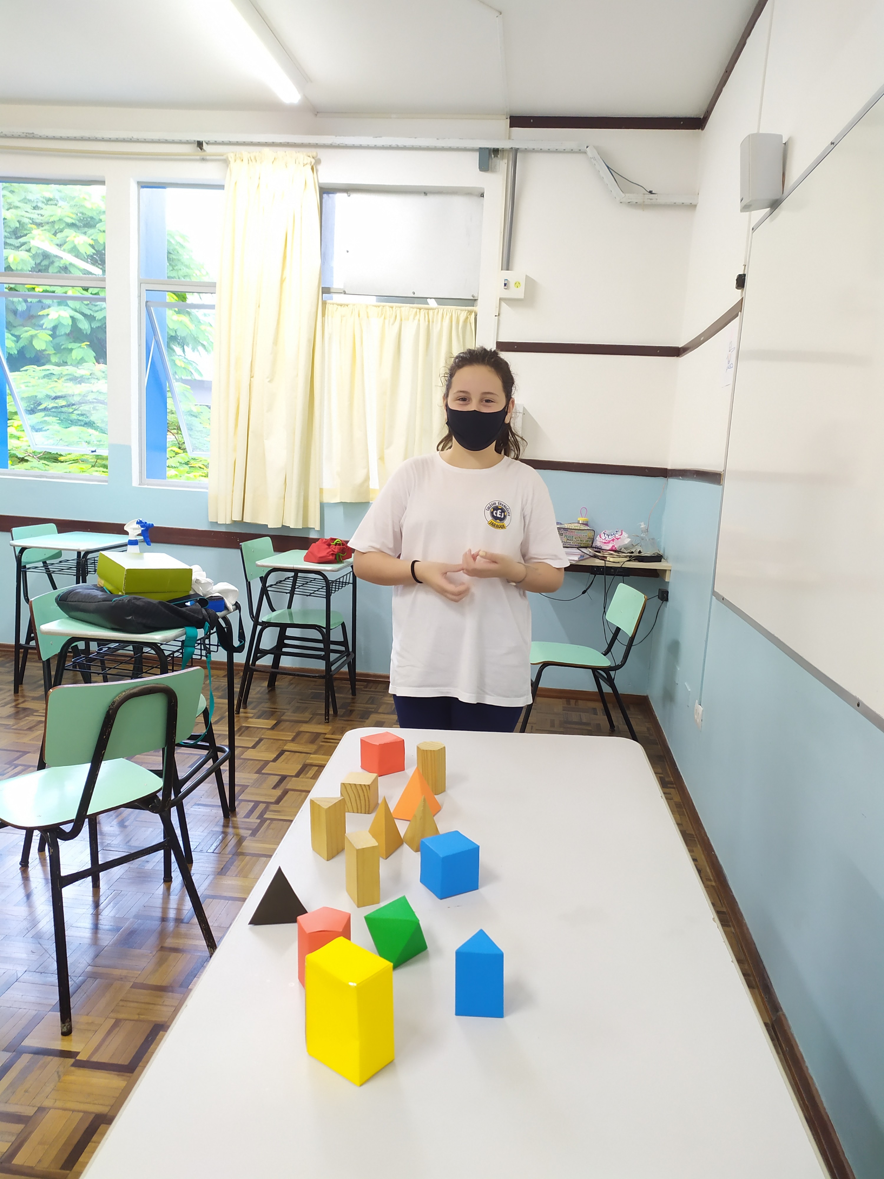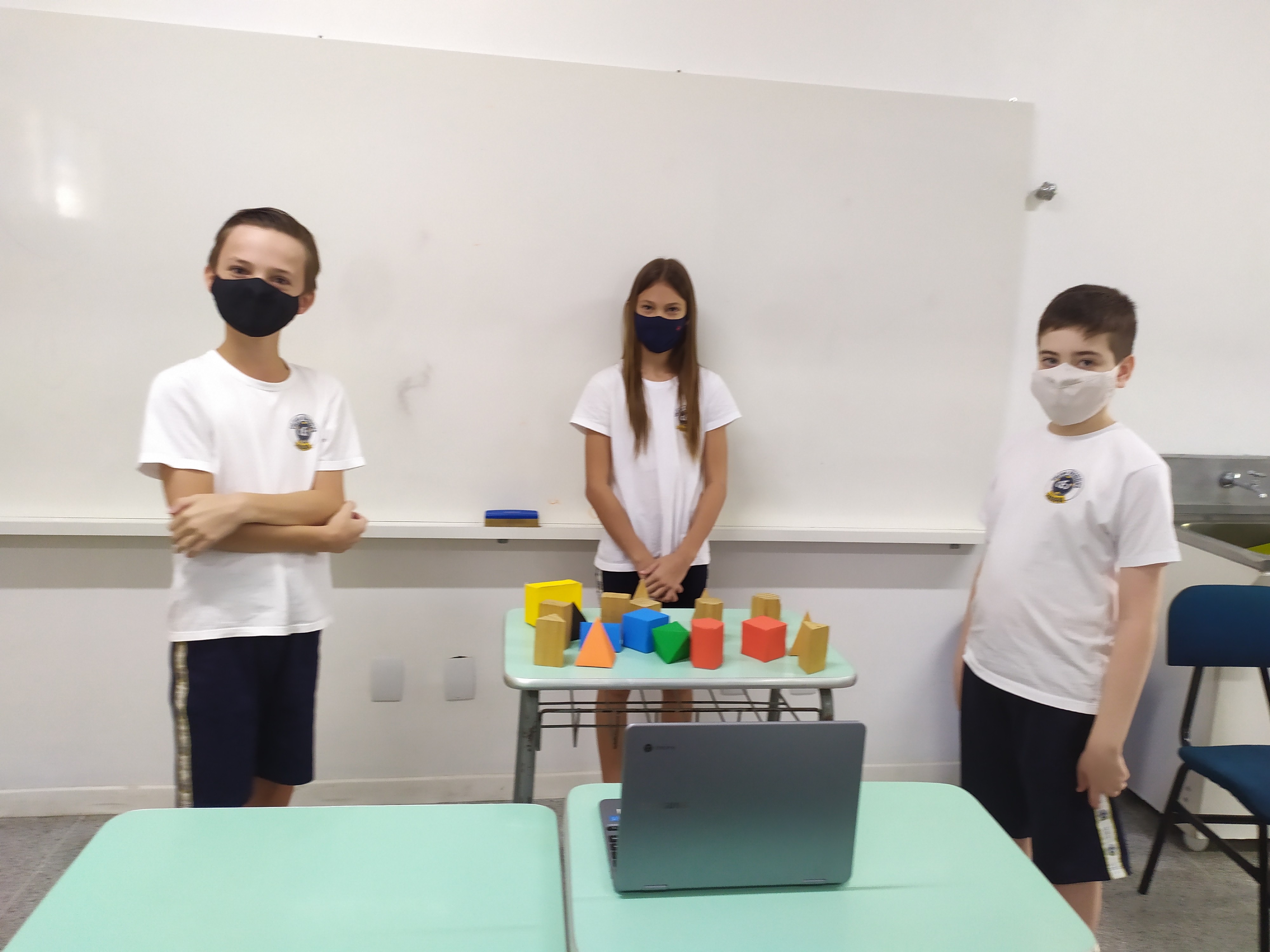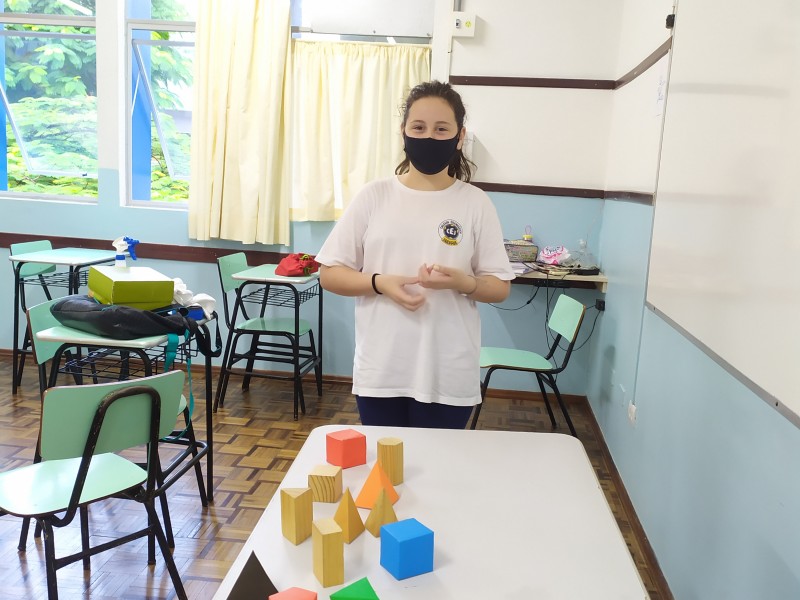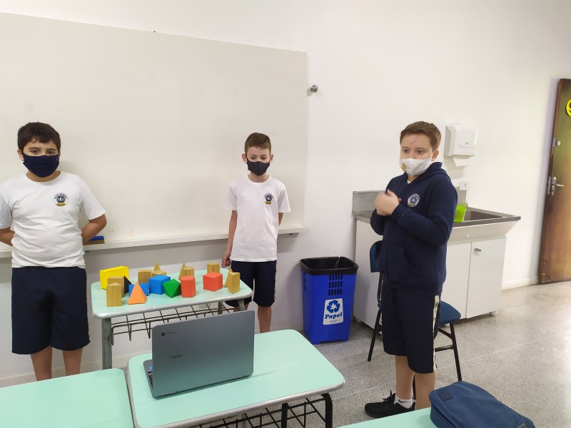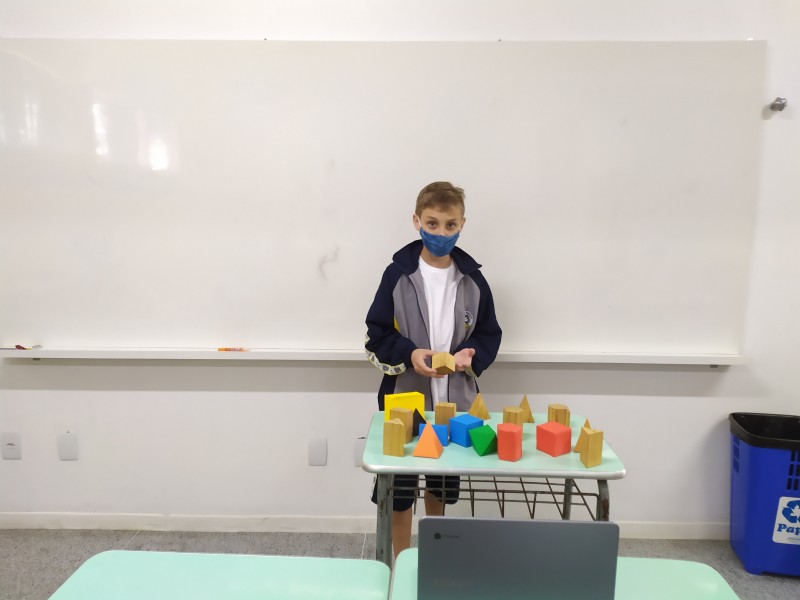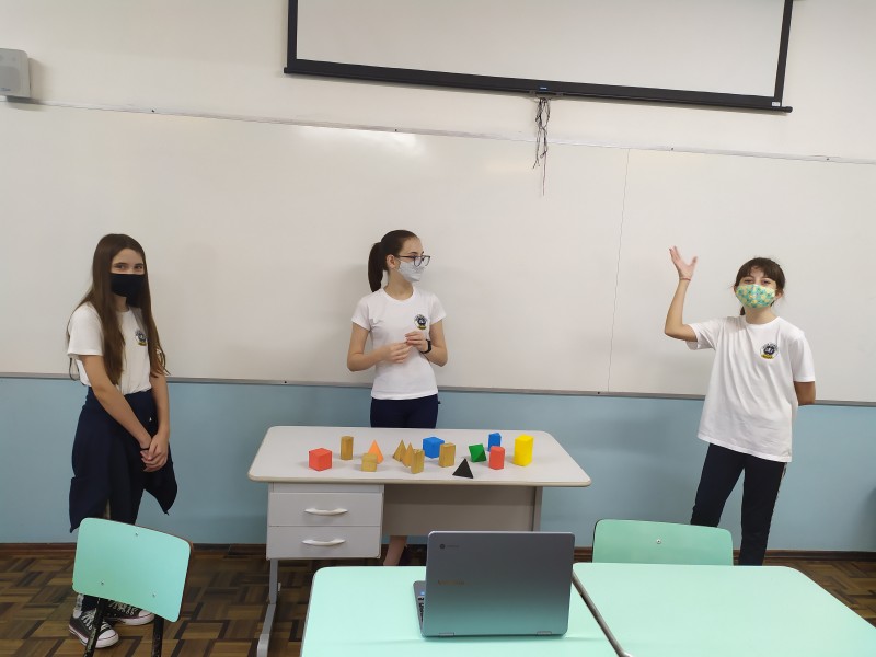 Durante o mês de março foi trabalhado o conteúdo de poliedros na aulas de Matemática dos 6ºs anos A e B. Durante as aulas foram levados vários tipos de sólidos, onde através do material concreto os alunos faziam suas apresentações , respondendo aos questionamentos orientados pela professora.