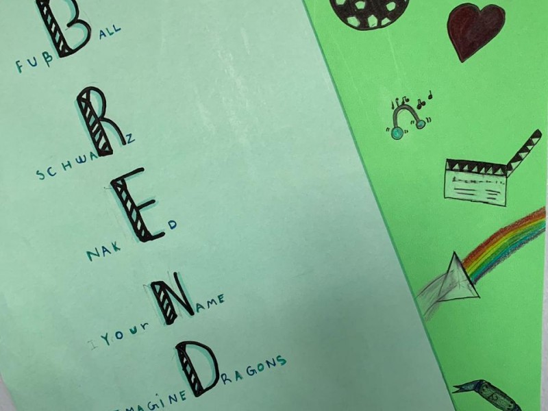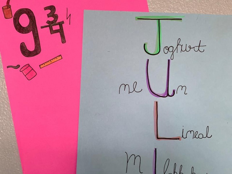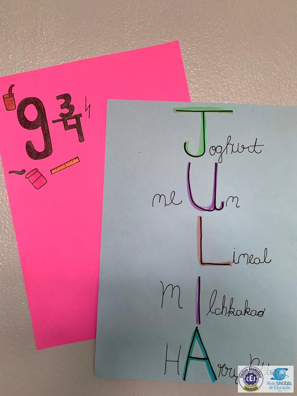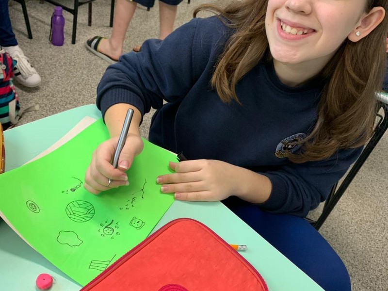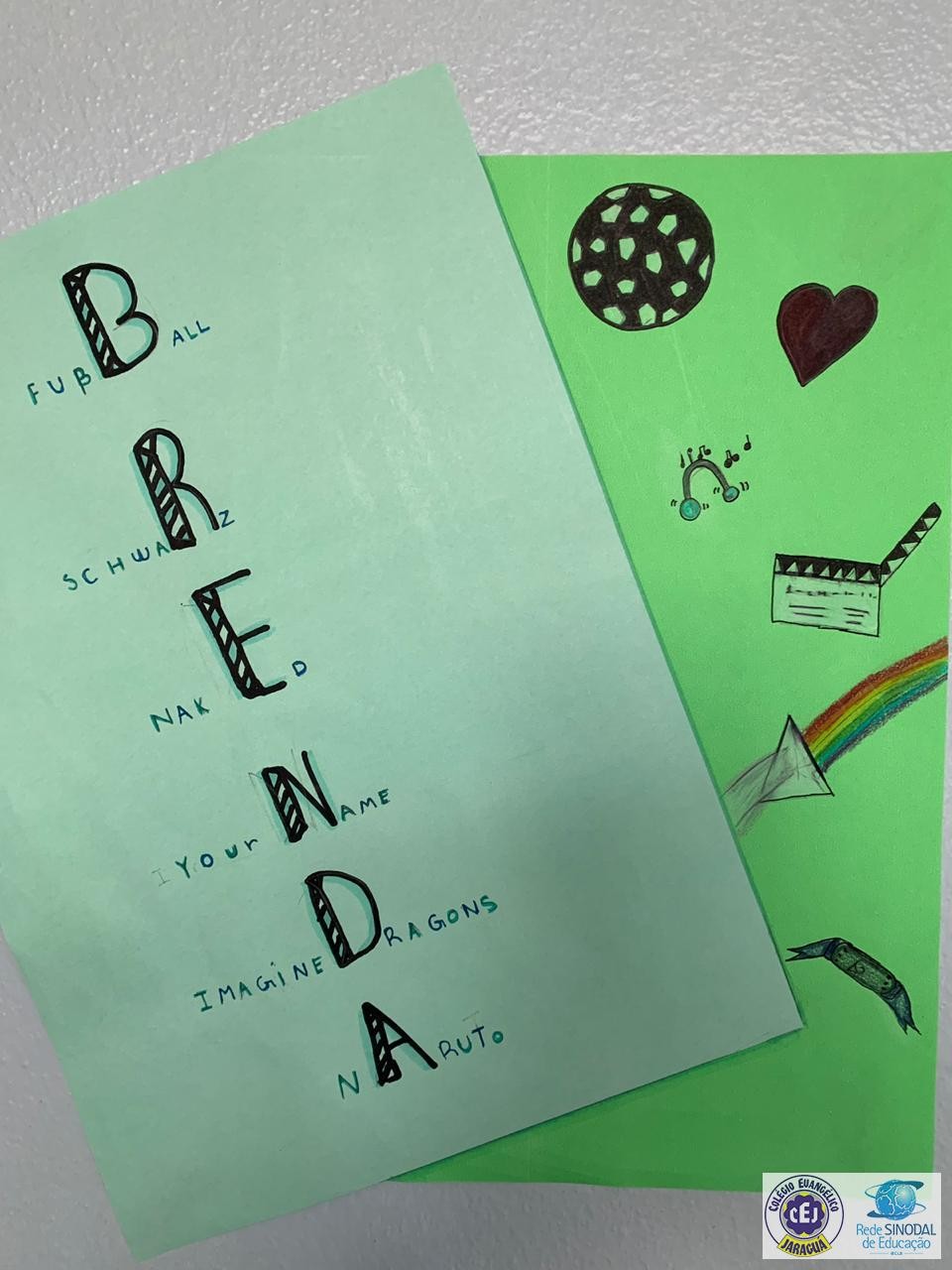 Os alunos praticaram os pronomes a partir dos seus gostos e preferências, elencadas no acróstico com seu próprio nome.