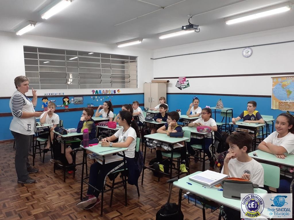 Mais notíciasAs mudanças sempre geram dúvidas e expectativas. Pensando nisso, a turma do 5º ano C teve um momento para tirar as suas dúvidas e expor seus questionamentos sobre como é a rotina do 6º ano e as principais mudanças que ocorrem neste período de transição do 5º ano para o 6º ano. Assim, os alunos contaram com a presença da professora Vivian Giese que ministra as aulas de história no Fundamental II para auxiliá-los neste momento de questionamentos, tirando as suas dúvidas e apresentando as principais rotinas do novo período que os aguardam.