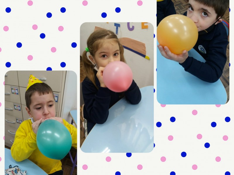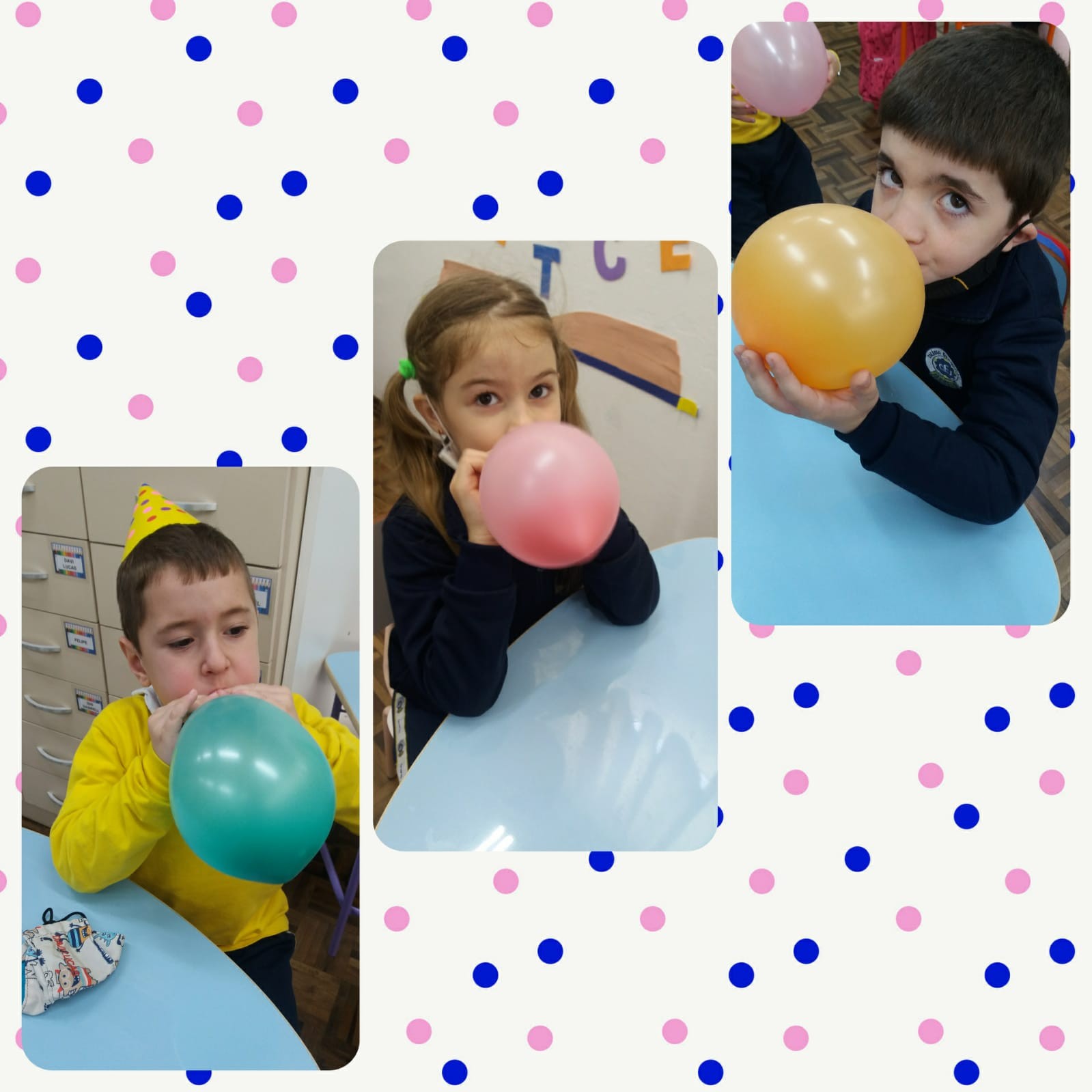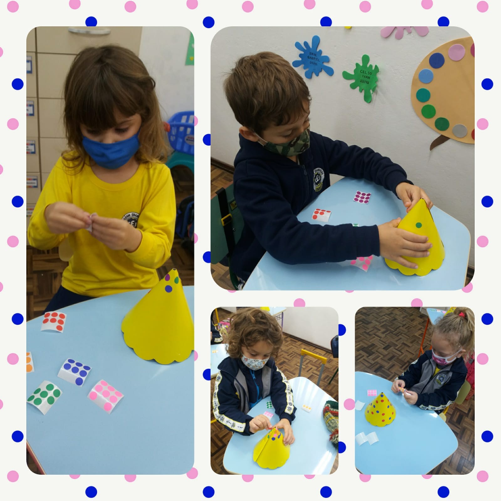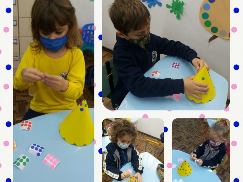 Fizeram o convite, enfeitaram o chapéu e sortearam uma letra para escolher um presente para a festa. No dia aguardado se divertiram com as surpresas ao encher e brincar com balão e ao confeccionar letras coloridas com docinhos.