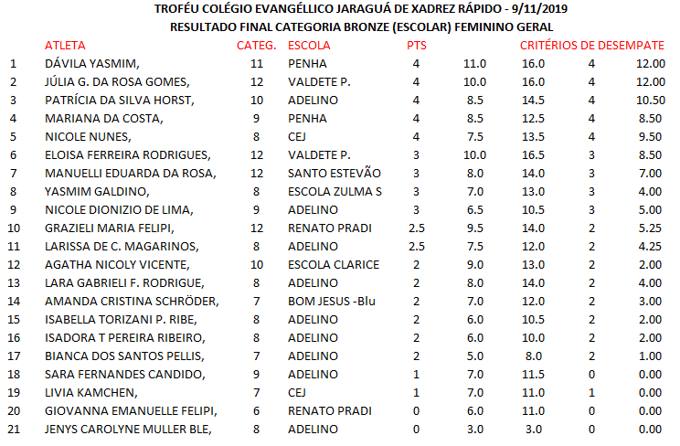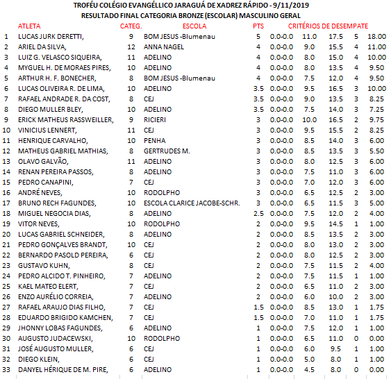 Mais notíciasNo dia 09/11 foi realizado no Colégio Evangélico Jaraguá o TROFÉU COLÉGIO EVANGÉLICO JARAGUÁ DE XADREZ RÁPIDO, com a participação de 65 enxadristas das cidades de Schroeder, Blumenau, Penha e de Jaraguá do Sul, resultados e fotos do evento anexo.